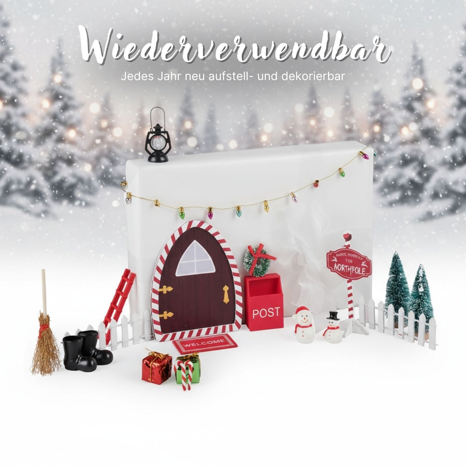 Wenn draussen Schneeflocken tanzen und die Welt in sanftes Weiss gehüllt ist, beginnt die Zeit, in der kleine Wunder greifbar werden. Genau dann zieht das 22-tlg. Wichteltür-Set in dein Zuhause ein – und mit ihm eine zauberhafte Miniaturwelt voller Fantasie und märchenhafter Magie. Die Weihnachtsdeko verwandelt Fensterbänke, Regale oder den Platz unter dem Weihnachtsbaum in eine Weihnachtsszene, in der Geschichten lebendig werden. Das Elfentür-Zubehör umfasst 1x dunkelbraune Holztür mit rot-weissem Rand (9cm x 0.6cm x 11cm), 1x roten Briefkasten (3.5cm x 1.8cm x 4.9cm), 2x grüne Tannenbäume, bedeckt mit weissem Schnee (3cm x 3cm x 7cm), 1x goldige Lichterkette mit pinken, blauen, roten, grünen, silbrigen und goldigen Perlen (Länge: 53cm), 1x weiss-rotes Nordpol-Schild mit Halterung (3.5cm x 3.5cm x 10cm), 2x Geschenkboxen in Rot und Grün (2cm x 2cm x 2cm), 1x grünen Kranz mit roter Schleife (3cm x 1.3cm x 3cm), 1x weissen Schneemann mit schwarzem Hut (1.8cm x 1.8cm x 2.8cm), 1x weissen Schneemann mit roter Mütze (2.3cm x 1.8cm x 3.2cm), 2x weisse Zaunelemente (10cm x 3cm), 1x schwarze Laterne (2.5cm x 2cm x 5.5cm), 1x rot-weisse Willkommensmatte (5.5cm x 3.5cm), 1x rote Leiter (2.8cm x 0.5cm x 7cm), 1x rote Schablone mit Wichtel-Fussabdrücken (4.7cm x 9.5cm), 1x Paar schwarze Stiefel (3.5cm x 1.5cm x 2.9cm), 1x braunen Besen (3cm x 3cm x 9.5cm) und 2x rot-weisse Zuckerstangen (Länge: 2.5cm). Die Weihnachtsfiguren können nach Belieben arrangiert und wiederverwendet werden, sodass du jedes Jahr aufs Neue deine eigene DIY-Winterwunderwelt gestalten kannst. Dieses Set lädt Kinder und Erwachsene dazu ein, gemeinsam zu basteln, Geschichten zu erfinden und die Vorfreude auf Weihnachten kreativ zu erleben. Es fördert Fantasie, Feingefühl, Zusammenhalt und Eltern-Kind-Interaktion. Die Kombination aus Holz und Kunststoff sorgt für eine angenehme Haptik und eine hochwertige Optik.