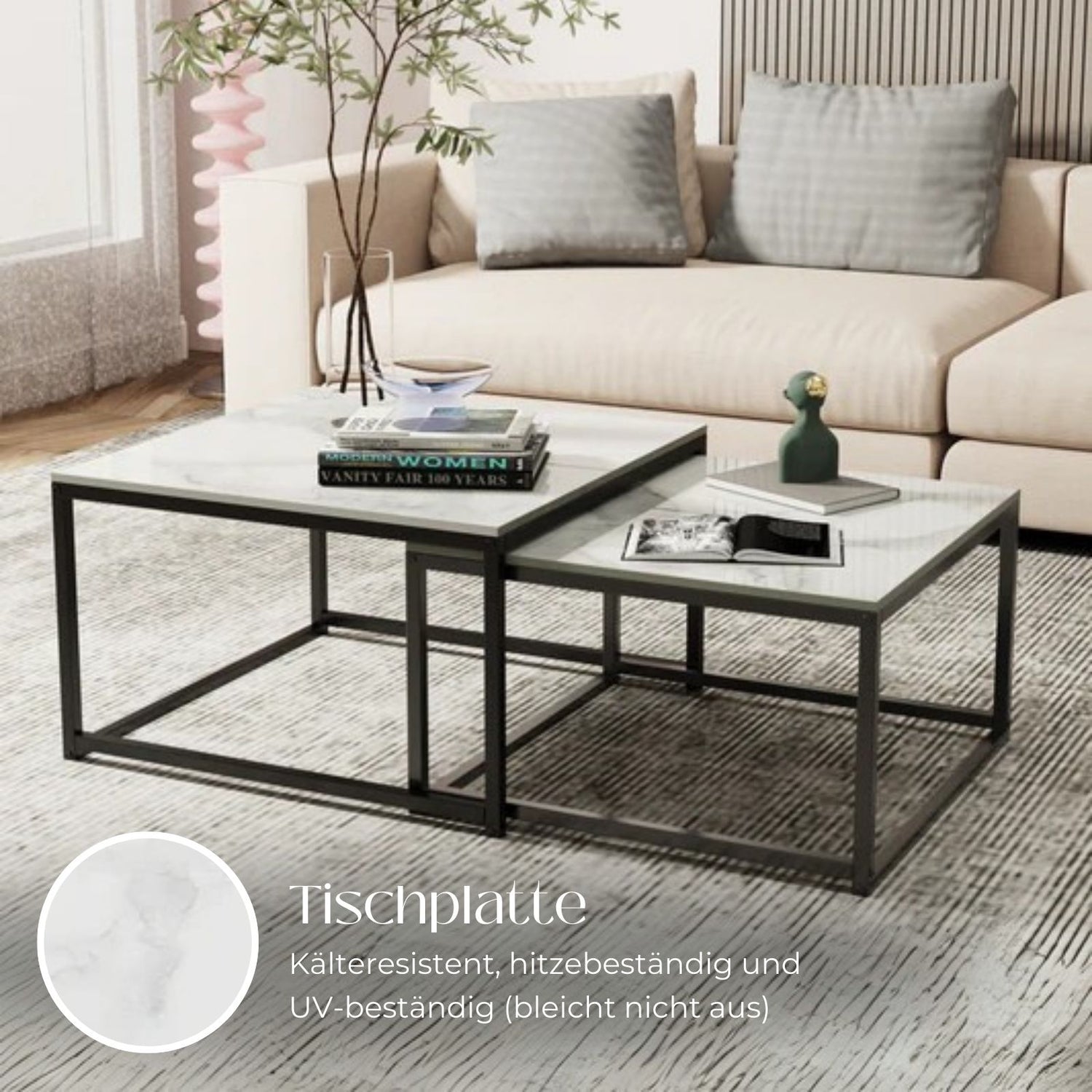 Verleihe deinem Zuhause eine stilvolle Aufwertung mit einem Möbelstück, das nicht nur praktisch ist, sondern auch durch seine Marmoroptik beeindruckt. Mit diesem 2er Couchtisch-Set bringst du zeitloses Design und vielseitige Funktionalität in dein Leben - der ideale Mittelpunkt für dein Wohnzimmer! Dieses Satztisch-Set bietet ein modernes Design mit klaren Linien und stilvollem Aussehen, das in jeden Raum passt. Egal ob im Wohnzimmer, Schlafzimmer, Büro oder Aufenthaltsraum, dieses Set fügt sich mit seinen schicken hellen Tischplatten aus gesintertem Stein in weisser Marmoroptik mühelos in jeden Wohnbereich ein. Die Tische sind 65cm x 65cm x 40cm und 60cm x 60cm x 34cm gross, können platzsparend ineinandergeschoben werden und bieten dir volle Flexibilität, da sie sowohl zusammen als auch einzeln verwendet werden können. Nutze sie als Ablagefläche für Getränke, Snacks, Dekoration, Vasen, Bücher und vieles mehr. Der grössere Tisch ist belastbar bis 60kg, der kleinere bis 50kg. Die hochwertige Tischplatte ist 10.7mm stark, was sie extrem stabil, abriebfest und kratzresistent macht. Die Oberfläche bleicht nicht aus und bleibt lange wie neu. Das schwarze Metallgestell sorgt zudem für einen festen Stand. Die beiden Tische sind pflegeleicht und einfach zu reinigen, die Montage kinderleicht und schnell erledigt. Verleihe deinem Raum mit diesem 2er Couchtisch-Set eine elegante wie charmante Note und erlebe zeitloses Design in seiner besten Form!