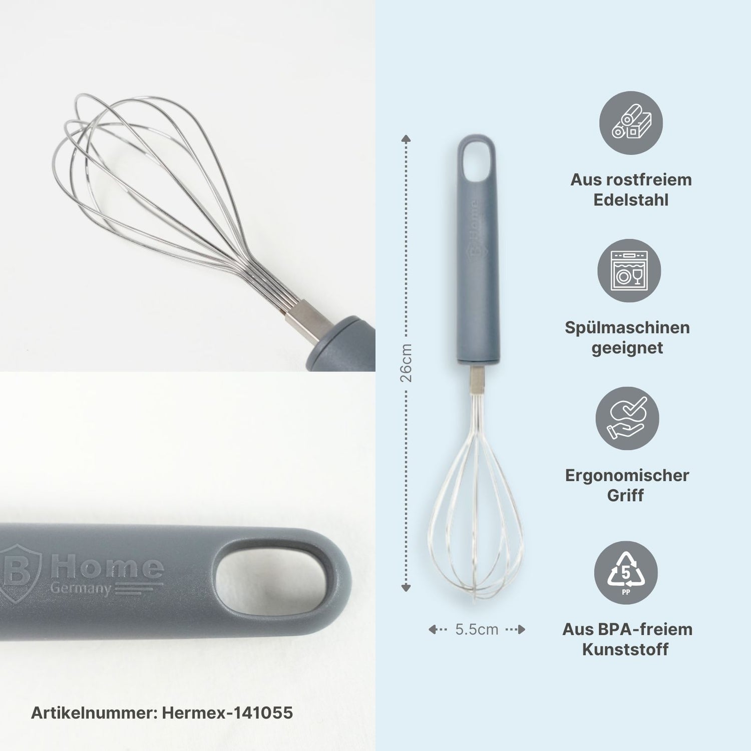 Dieses 3-teilige Schneebesen-Set bietet dir praktische Helfer für verschiedenste Aufgaben beim Backen und Kochen – vom luftig geschlagenen Eischnee bis zum gleichmässigen Verrühren von Teigen oder Saucen. Mit drei unterschiedlichen Rührbesen bist du für viele Küchenaufgaben bestens ausgestattet. Das Set enthält 1x Schwingbesen mit Kunststoffgriff und Edelstahlkopf, 1x Rührbesen mit Edelstahlgriff und Silikonkopf sowie 1x Schneebesen aus glasfaserverstärktem Kunststoff. Alle drei Werkzeuge sind mit ergonomisch geformten Griffen ausgestattet, die angenehm in der Hand liegen und dir auch bei längerer Nutzung sicheren Halt bieten. Die verwendeten Kunststoffe sind BPA-frei und lebensmittelecht. Die Länge der Schlagbesen liegt zwischen ca. 25.5cm und 28.5cm. Jeder Küchenhelfer ist auf eine bestimmte Anwendung ausgelegt: Der Schwingbesen eignet sich ideal zum schnellen Aufschlagen von Flüssigkeiten, der Kunststoff-Schneebesen ist perfekt für Rührteig, Sahne oder leichte Cremes und der Rührbesen mit Silikonkopf ist besonders schonend zu beschichteten Oberflächen. Alle drei Teile sind pflegeleicht und spülmaschinengeeignet – für eine einfache Reinigung nach dem Einsatz. Ein funktionales Trio für alle, die gerne selbst rühren, schlagen und mixen – ob beim Backen oder Kochen.