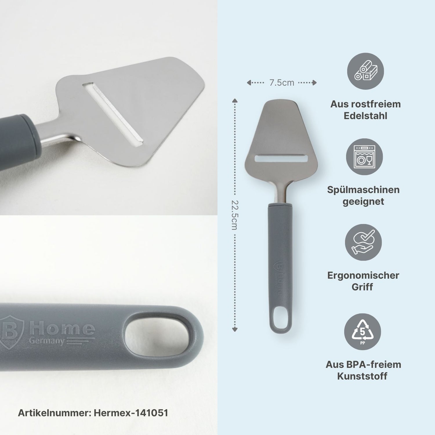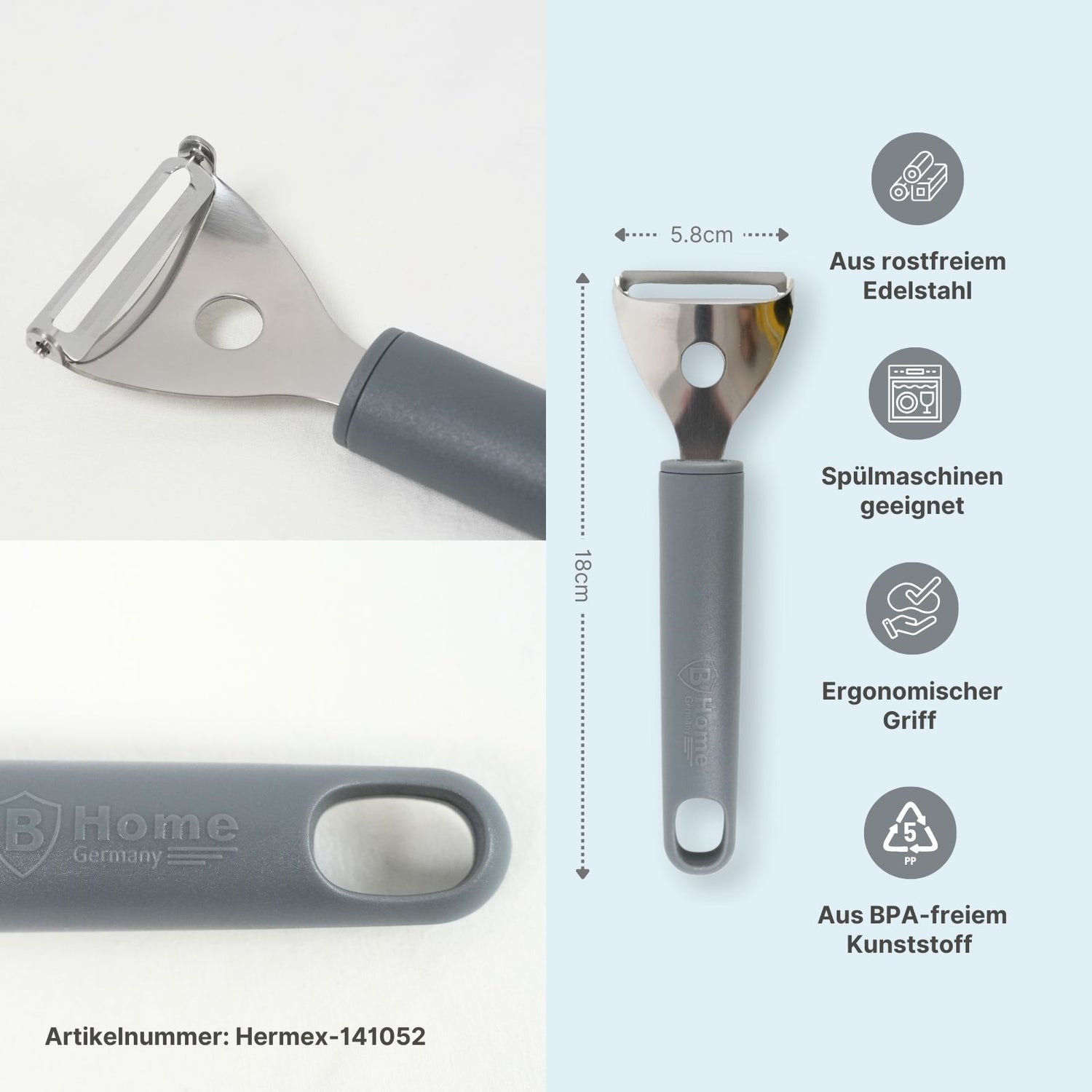 Dieses 3-teilige Set aus Sparschäler und Käsehobel bietet dir praktische Küchenhelfer – perfekt für die tägliche Zubereitung von Obst, Gemüse, Kartoffeln oder Käse. Das Set enthält 1x Sparschäler, 1x Kartoffelschäler und 1x Käsehobel und erleichtert dir viele Arbeitsschritte beim Kochen und sorgt für gleichmässige Ergebnisse bei geringem Aufwand. Alle drei Teile bestehen aus langlebigem, rostfreiem Edelstahl und sind mit einem ergonomischen, rutschfesten Griff aus BPA-freiem Kunststoff ausgestattet. Die Griffform liegt angenehm in der Hand und ermöglicht sicheres und präzises Arbeiten. Die Längen der Werkzeuge reichen von ca. 18cm bis 22.5cm und bieten dir eine gute Handhabung bei verschiedensten Anwendungen. Mit dem Sparschäler entfernst du dünne Schalen von Karotten, Gurken oder Äpfeln besonders effizient. Der schmale Kartoffelschäler ist ideal für Kartoffeln und rundliche Gemüsesorten. Der Käsehobel sorgt für gleichmässige Scheiben von Hart- und Schnittkäse – ideal zum Belegen von Broten oder Garnieren von Speisen. Alle Küchenhelfer sind lebensmittelecht, pflegeleicht und spülmaschinengeeignet – für eine einfache Reinigung nach dem Einsatz. Ein durchdachtes Set für alle, die in der Küche auf funktionale, langlebiges Zubehör setzen.