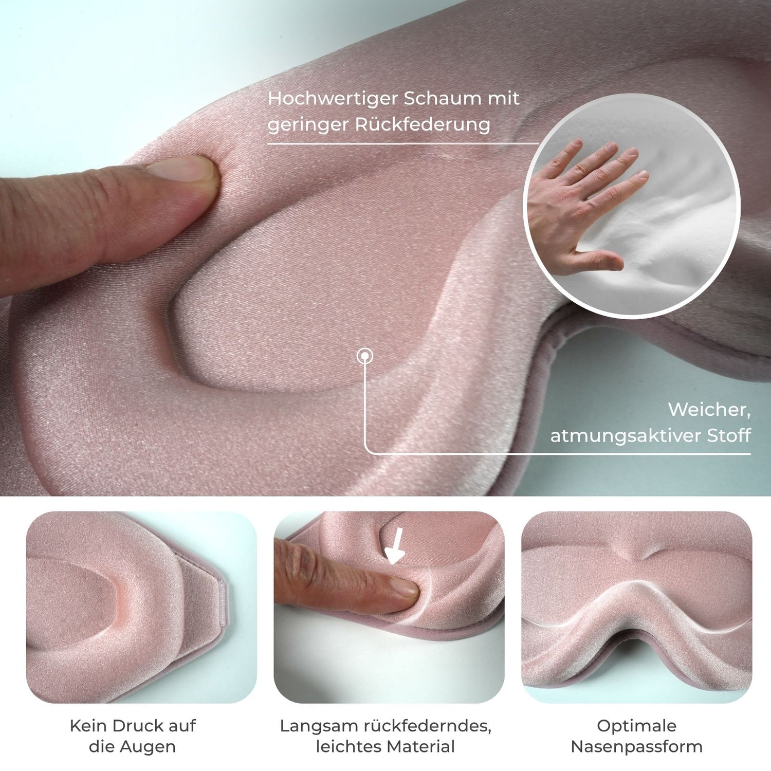 Nachts wälzt du dich hin und her und findest keinen Schlaf. Selbst mit geschlossenen Augen spürst du noch das Licht der Strassenlaternen, das deinen Schlaf stört. Setze deinen schlaflosen Nächten mit dieser 3D Schlafmaske ein Ende und gönn dir deine wohlverdiente Ruhe und einen erholsamen Schlaf! Die besondere Stärke dieser rosa Schlafbrille liegt im 3D-Design mit 1.3cm vertieften Augenhöhlen: Kein Druck auf deine Augen, kein Verwischen des Make-ups, kein Kontakt mit den Wimpern und keine Druckstellen, dafür besonders bequemer Tragekomfort. Das weiche, hautfreundliche und hochelastische sowie rückfedernde Memory Foam-Material fühlt sich seidig an, ist atmungsaktiv und sorgt selbst bei empfindlicher Haut für ein angenehmes Tragegefühl. Mit einem Gewicht von nur 35g spürst du die Augenmaske kaum, während sie sich dank ergonomischer Passform der Gesichtsform anpasst, eng anliegt und vollständig abdunkelt. Die integrierte Aussparung für den Nasenrücken sorgt für zusätzlichen Komfort und verhindert auch im Nasenbereich Lichtdurchlass, ohne dabei zu drücken. Dadurch erlaubt sich dir ruhiger Schlaf in jeder Position, egal ob du flach auf dem Rücken oder seitlich liegst. Auch kürzere Auszeiten wie ein kurzer Powernap, ein entspanntes Nickerchen oder Momente der Ruhe bei Yoga und Meditation werden mit dieser Maske spürbar erholsamer. Der elastische Gurt mit stufenlos verstellbarer Schnalle lässt sich flexibel anpassen und ist für einen Kopfumfang von 45cm bis 70cm geeignet. Durch die kompakte Grösse von 25cm x 10cm x 2cm passt die Nachtmaske in jede Tasche – eine praktische Lösung für lange Autofahrten, Flüge, Reisen, Urlaub oder für eine kurze, erholsame Pause im Büro. Pflegehinweis: Wasche die Maske per Hand mit einem neutralen Reinigungsmittel und lasse sie an der Luft trocknen. Nicht auswringen.