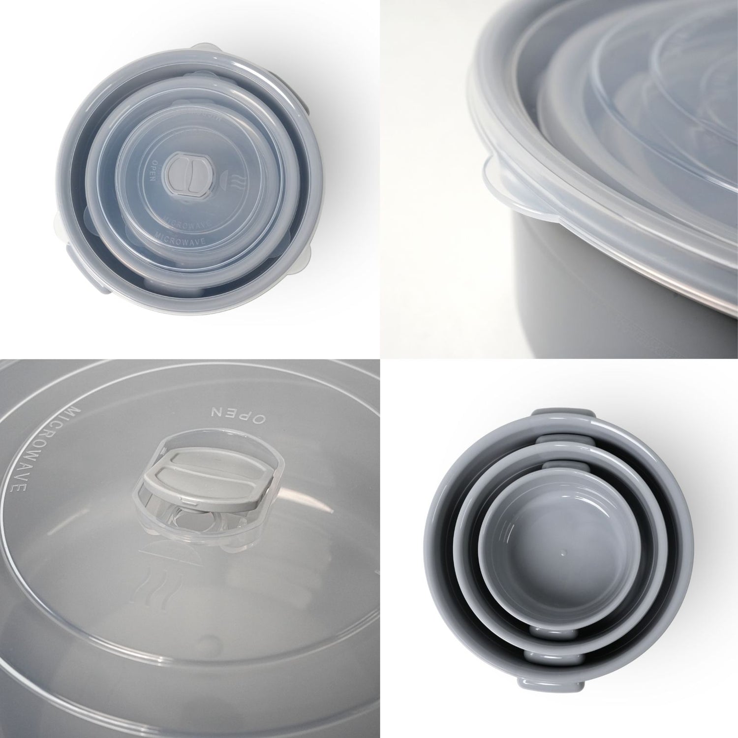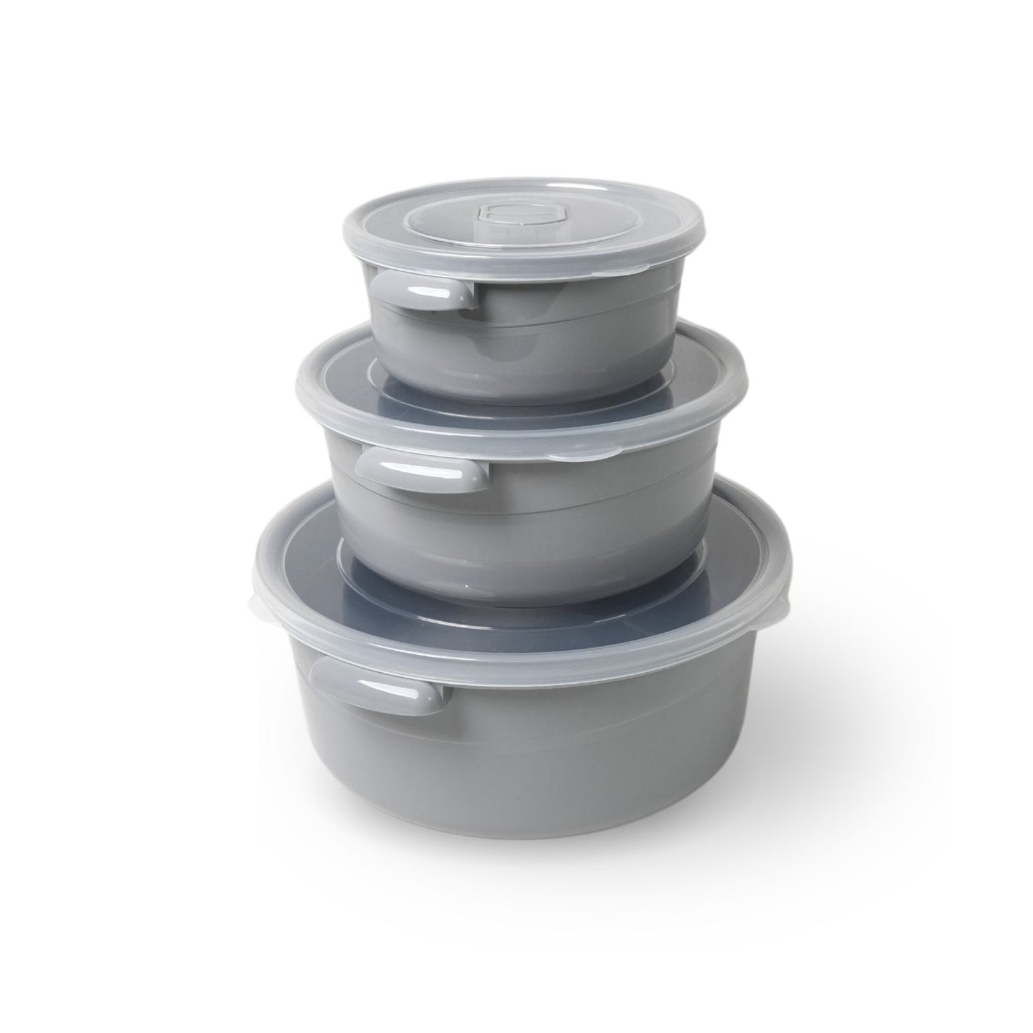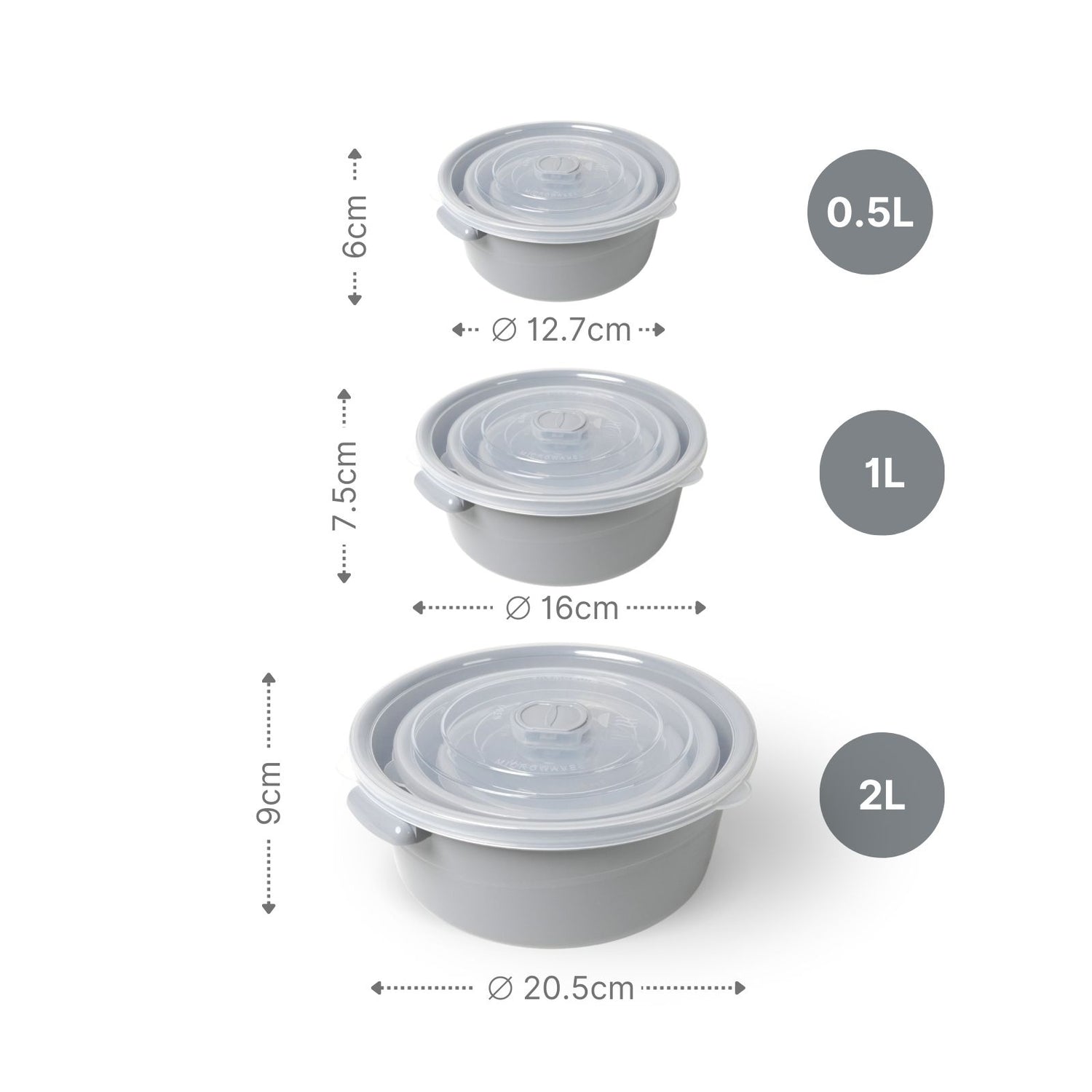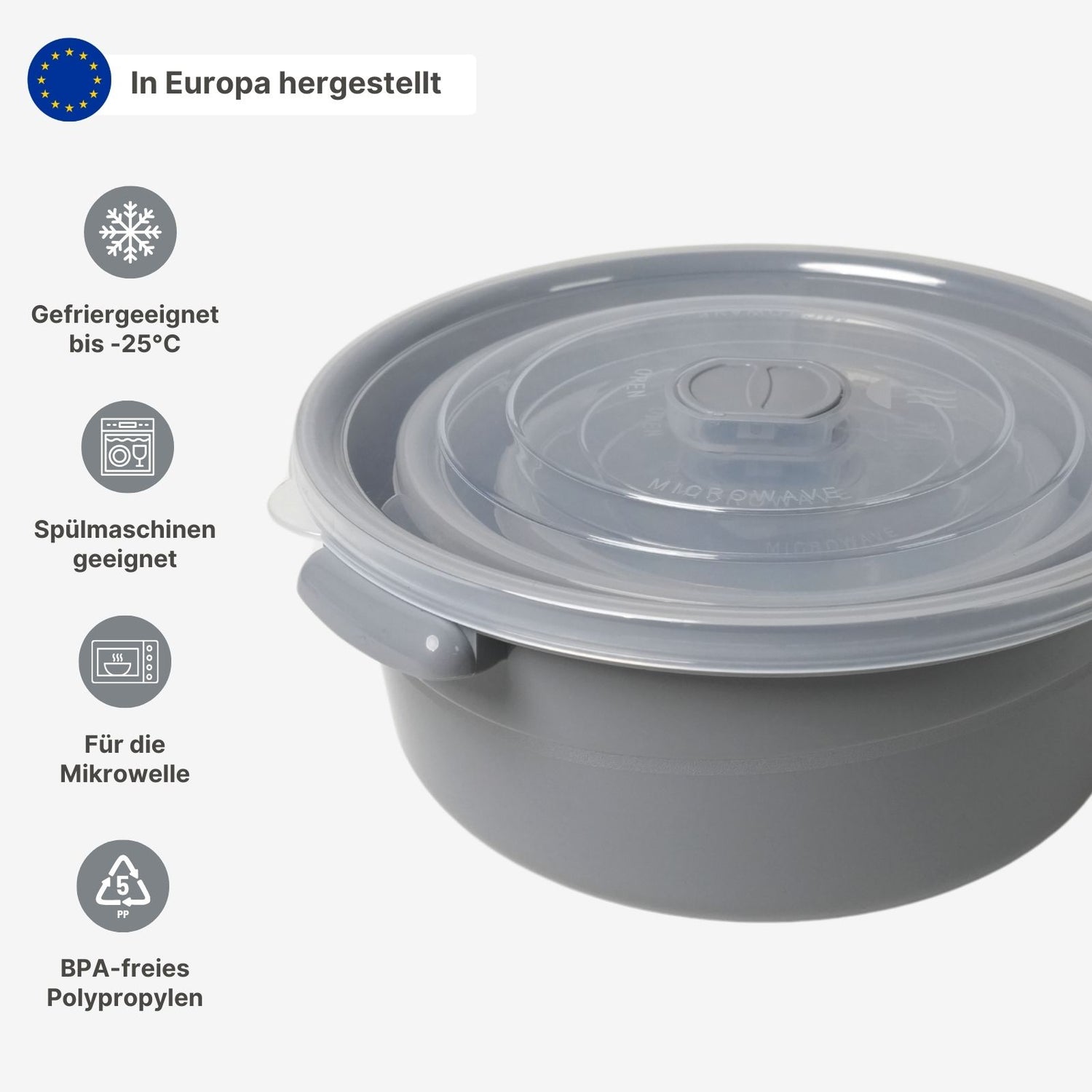 Praktisch und vielseitig – mit diesem 3-teiligen Mikrowellendosen-Set in Grau bist du perfekt ausgestattet, um Lebensmittel frisch zu halten, aufzubewahren oder direkt in der Mikrowelle zu erhitzen. Das Set besteht aus drei unterschiedlich grossen, runden Aufbewahrungsdosen mit transparenten Deckeln mit Lüftungsventil. So kannst du die Dosen direkt aus dem Kühlschrank in die Mikrowelle stellen, ohne den Deckel abnehmen zu müssen, was nicht nur praktisch ist, sondern auch Spritzer in der Mikrowelle verhindert. Die seitlichen Griffe erleichtern das Anheben und Transportieren der Dosen. Mit einem Inhalt von 0.5L (Ø 12.7cm), 1.0L (Ø 16cm) und 2.0L (Ø 20.5cm) passen die Behälter perfekt für unterschiedlichste Lebensmittel. Egal ob kleine Snacks, übrig gebliebenes Essen oder komplette Mahlzeiten – du hast immer die passende Grösse zur Hand. Wenn sie leer sind, passen die Dosen perfekt ineinander und lassen sich platzsparend verstauen. Die Kunststoffdosen aus Polypropylen sind BPA-frei, lebensmittelecht und spülmaschinengeeignet, sodass du sie leicht reinigen kannst. Ausserdem sind die Behälter gefrier-geeignet bis -25°C, was dir noch mehr Flexibilität bei der Aufbewahrung bietet. Die transparenten Deckel ermöglichen dir jederzeit den Überblick über den Inhalt, ohne die Dosen zu öffnen. Hergestellt in Europa, erfüllen die Vorratsdosen hohe Qualitätsstandards, sind formstabil und langlebig im Gebrauch. Ob im Kühlschrank, Gefrierfach oder in der Mikrowelle – mit diesem Mikrowellendosen-Set kannst du Speisen flexibel aufbewahren und wieder aufwärmen. Nutze die vielseitigen Einsatzmöglichkeiten und bringe mehr Ordnung und Übersicht in deine Küche. Das Aufbewahrungsdosen-Set enthält eine kleine Dose 0.5L, eine mittlere Dose 1L und eine grosse Dose 2L.