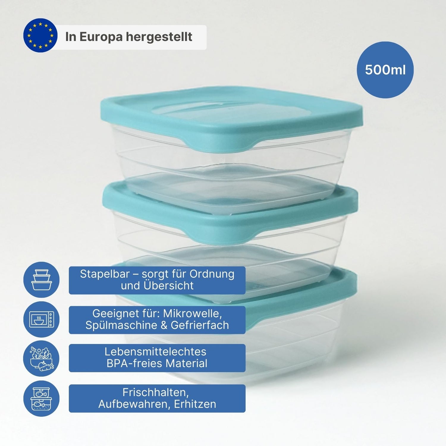 Einmal vorkochen und dann entspannt geniessen – mit diesem 3er-Set Frischhaltedosen bleibt alles übersichtlich, frisch und griffbereit. Ob übrig gebliebenes Essen, Meal-Prep oder kleine Snacks für unterwegs, diese praktischen Vorratsdosen sorgen für Ordnung wie Übersicht in der Küche und bieten eine sichere Aufbewahrung für verschiedenste Lebensmittel. Das Set besteht aus 3 quadratischen Dosen mit jeweils 500ml Fassungsvermögen. Dank der einheitlichen Grösse lassen sie sich platzsparend ineinander stapeln, wenn sie nicht gebraucht werden. Hergestellt in Europa, erfüllen die Vorratsboxen hohe Qualitätsstandards. Das BPA-freie Polypropylen ist lebensmittelecht, langlebig und formstabil. Die Gefrierdosen sind zudem vielseitig nutzbar: Sie sind gefriergeeignet bis -25°C, wodurch sich Speisen problemlos auf Vorrat lagern lassen. In der Mikrowelle können die Lebensmittel direkt in der Frischhaltebox erhitzt werden – der Deckel sollte jedoch zuvor entfernt werden. Darüber hinaus sind die Aufbewahrungsdosen spülmaschinengeeignet und lassen sich so leicht reinigen. Die transparenten Behälter ermöglichen eine schnelle Sicht auf den Inhalt, sodass sich jederzeit erkennen lässt, was noch vorrätig ist. Der türkise Deckel schliesst sicher, schützt Lebensmittel und hält sie länger frisch. Mit einer Grösse von 12.5cm x 12.5cm x 9.5cm und einem Gewicht von nur 129g sind die Boxen leicht zu handhaben und finden in jeder Küche ihren Platz. Egal ob für die Aufbewahrung im Kühlschrank, das Einfrieren von Speisen oder das schnelle Erwärmen in der Mikrowelle – dieses praktische 3er-Dosen-Set erleichtert den Alltag, hält Lebensmittel frisch und sorgt für mehr Übersicht und Ordnung.