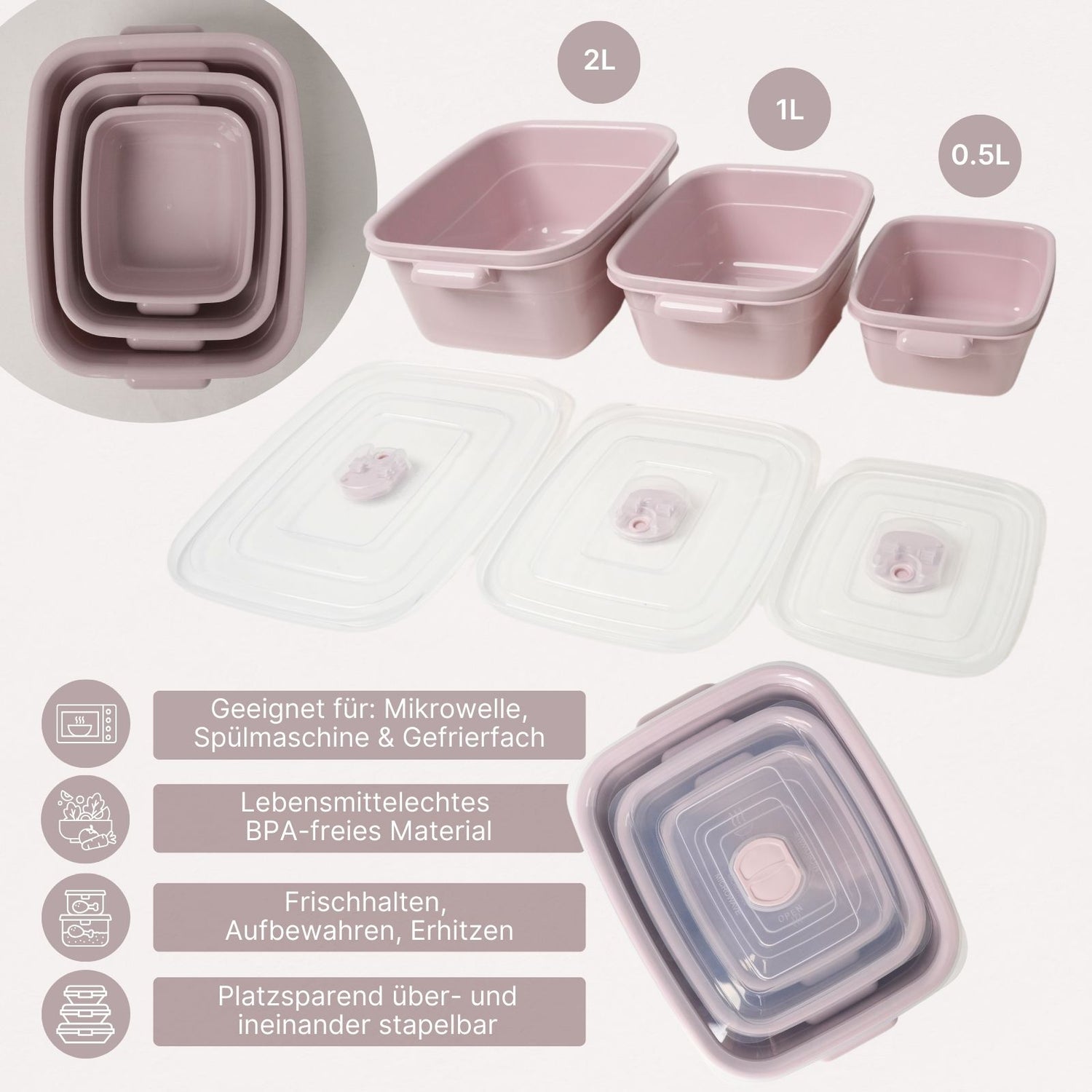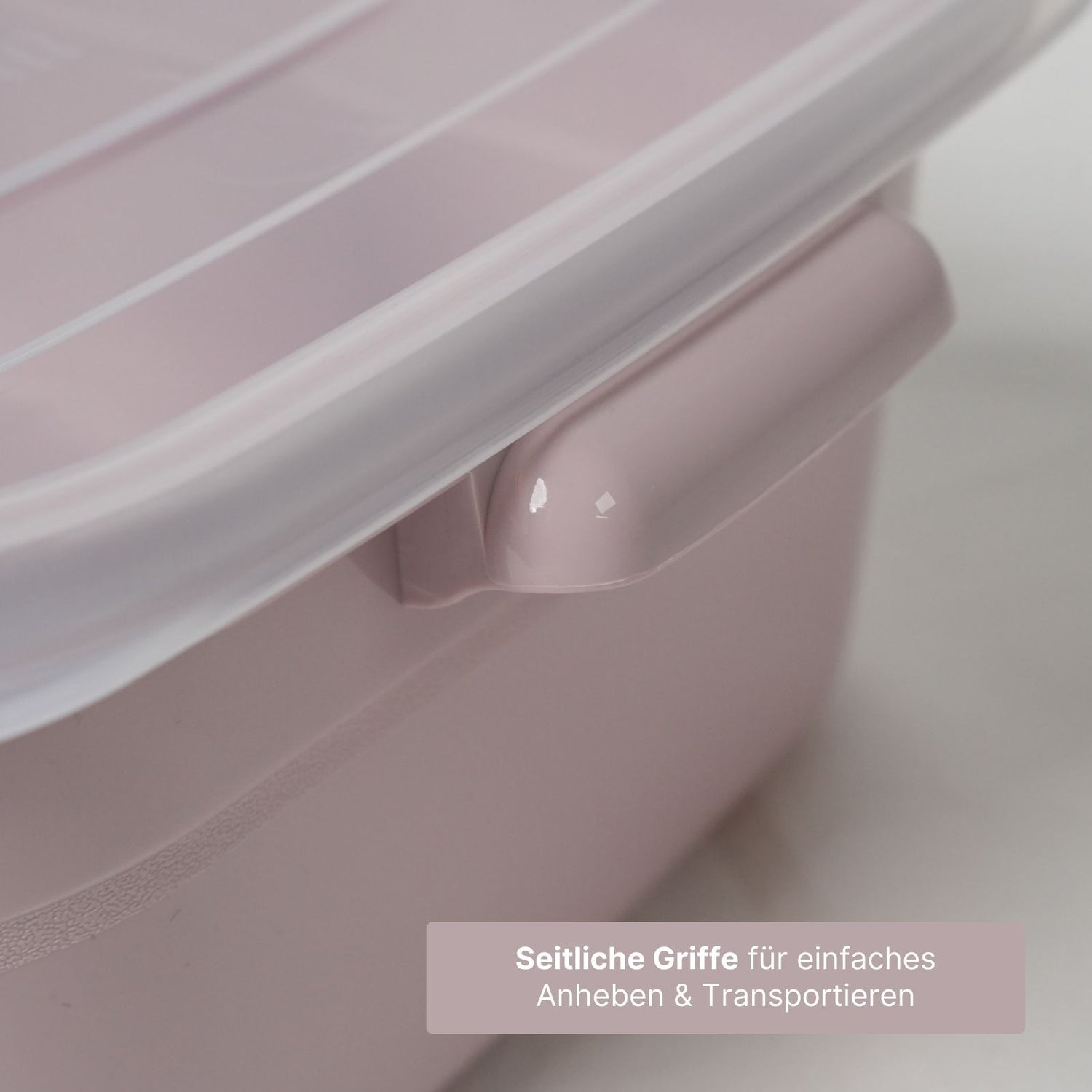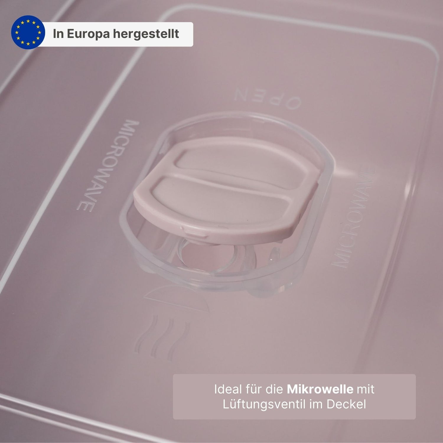 Praktisch und vielseitig – mit diesem 3-teiligen Mikrowellendosen-Set in Altrosa bist du perfekt ausgestattet, um Lebensmittel frisch zu halten, aufzubewahren oder direkt in der Mikrowelle zu erhitzen. Das Set besteht aus drei unterschiedlich grossen, rechteckigen Aufbewahrungsdosen mit transparenten Deckeln mit Lüftungsventil. So kannst du die Dosen direkt aus dem Kühlschrank in die Mikrowelle stellen, ohne den Deckel abnehmen zu müssen, was nicht nur praktisch ist, sondern auch Spritzer in der Mikrowelle verhindert. Die seitlichen Griffe erleichtern das Anheben und Transportieren der Dosen. Mit einem Inhalt von 0.5L (12.5cm x 11cm x 6cm), 1.0L (16.5cm x 14cm x 7.5cm) und 2.0L (20cm x 16.6cm x 9cm) passen die Behälter perfekt für unterschiedlichste Lebensmittel. Egal ob kleine Snacks, übrig gebliebenes Essen oder komplette Mahlzeiten – du hast immer die passende Grösse zur Hand. Wenn sie leer sind, passen die Dosen perfekt ineinander und lassen sich platzsparend verstauen. Die Kunststoffdosen aus Polypropylen sind BPA-frei, lebensmittelecht und spülmaschinengeeignet, sodass du sie leicht reinigen kannst. Ausserdem sind die Behälter gefrier-geeignet bis -25°C, was dir noch mehr Flexibilität bei der Aufbewahrung bietet. Die transparenten Deckel ermöglichen dir jederzeit den Überblick über den Inhalt, ohne die Dosen zu öffnen. Hergestellt in Europa, erfüllen die Vorratsdosen hohe Qualitätsstandards, sind formstabil und langlebig im Gebrauch. Ob im Kühlschrank, Gefrierfach oder in der Mikrowelle – mit diesem Mikrowellendosen-Set kannst du Speisen flexibel aufbewahren und wieder aufwärmen. Nutze die vielseitigen Einsatzmöglichkeiten und bringe mehr Ordnung und Übersicht in deine Küche. Das Aufbewahrungsdosen-Set enthält eine kleine Dose 0.5L, eine mittlere Dose 1L und eine grosse Dose 2L.