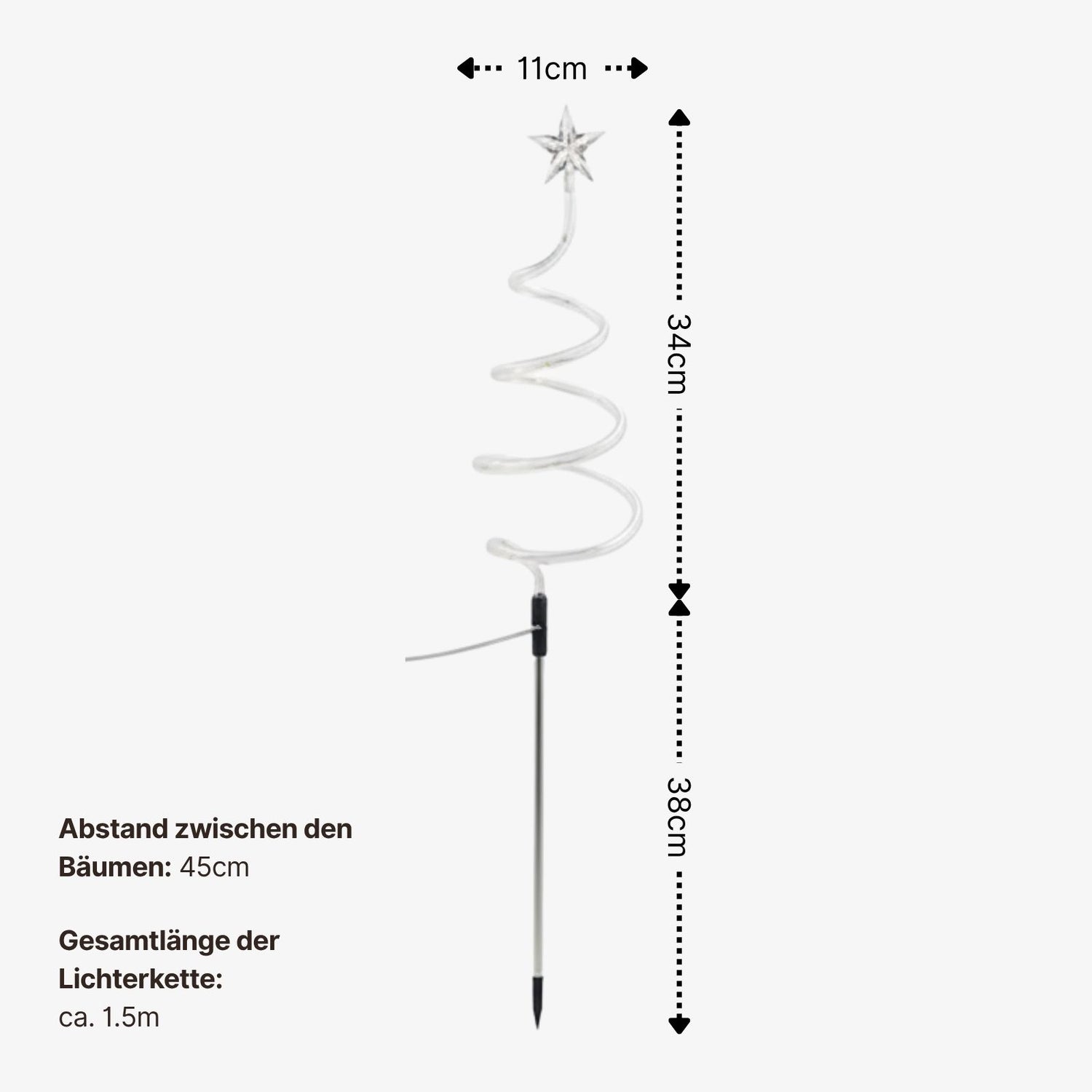 Wenn die Dunkelheit sanft über deinen Garten fällt und die kalte Winterluft in Stille gehüllt ist, beginnt die leise Magie der Weihnachtszeit und dieses 4er-Set LED Solar-Spiralbäume entfaltet seinen festlichen Glanz. Vier kleine, leuchtende Tannenbäume, die miteinander verbunden sind, verwandeln deinen Aussenbereich in ein romantisch funkelndes Wintermärchen. Ob im Garten, auf dem Balkon oder entlang eines Gartenwegs, das Licht der Solarlampen wirft glitzernde Reflexe auf Schnee und Zweige und schafft eine festliche Atmosphäre. Jeder Spiralbaum ist aus transparentem Kunststoff gefertigt (Masse: 11cm x 11cm x 34cm) und mit 20 kaltweiss-bläulich leuchtenden LEDs versehen. Der Abstand zwischen den einzelnen Tannenbäumen beträgt 45cm, wodurch sich eine Gesamtlänge von rund 1.5m ergibt. Mit den Metallstäben (Länge: 34cm) und den Erdspiessen (Länge: 6.2cm) kannst du die Lichterkette flexibel im Boden oder Beet platzieren. Die Spiraltannenbäume enden in einem leuchtenden Stern, der das festliche Design vollendet. Die gesamte Konstruktion erreicht dabei eine Höhe von etwa 72cm. Dank des integrierten Solarpanels (0.5W, 2V, Masse Gehäuse: 11cm x 7cm x 2.2cm, Masse Solarfläche: 4cm x 5.5cm) laden sich die Tannenlichter tagsüber im Sonnenlicht auf und leuchten im Dunkeln nach 6 Stunden Ladezeit automatisch für 8 bis 10 Stunden – ganz ohne Kabel, Steckdose und Stromkosten. Mit der verstellbaren Halterung lässt sich das Solarpanel bis zu 90° kippen, um den optimalen Lichteinfang zu gewährleisten. Ein Schalter an der Unterseite des Panels ermöglicht dir die Wahl zwischen drei Einstellungen: Dauerlicht („S“), Flackerlicht („F“) und Aus (Mitte). Die Bodenspirallampen sind mit Schutzart IP65 wetterfest und trotzen winterlichen Temperaturen, sodass du sie dauerhaft draussen als Weihnachtsdeko einsetzen kannst. So wird jeder Winterabend im Handumdrehen zu einem funkelnden Lichtermoment.