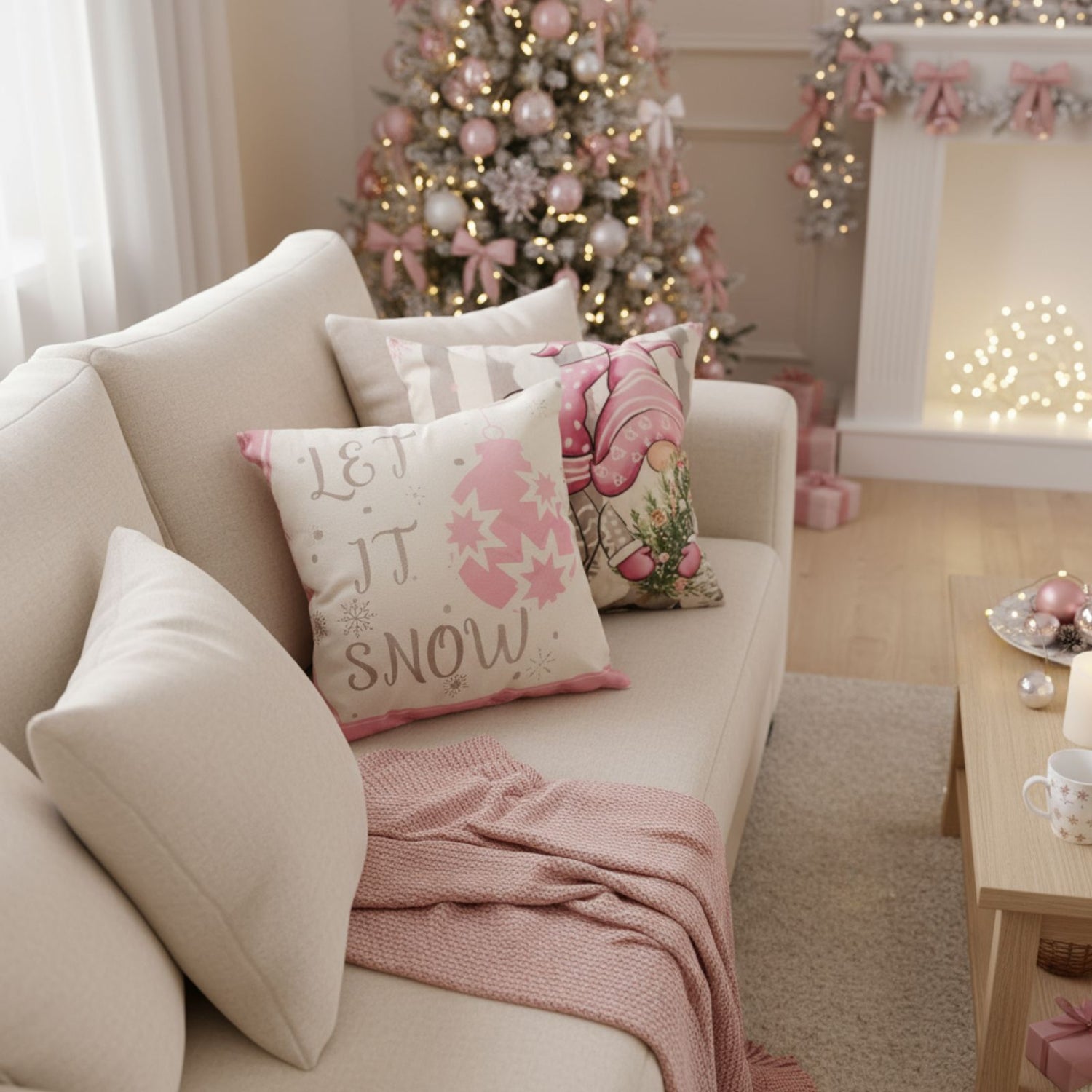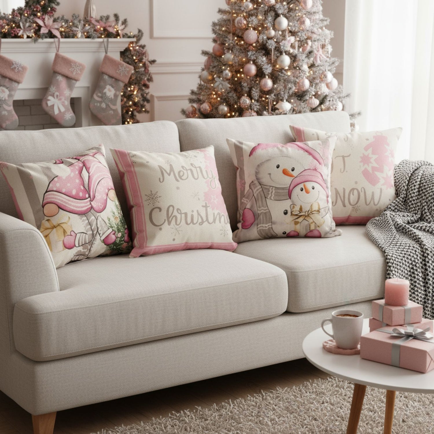 Wenn draussen der Wind weht und es langsam kälter wird, verwandelt sich dein Zuhause in den gemütlichsten Rückzugsort. Doch damit echte Weihnachtsstimmung einzieht, braucht es mehr als nur Kerzenlicht und Tannenzweige – es sind die kleinen Details, die Wärme und Geborgenheit schaffen. Dieses 4er-Set an quadratischen Weihnachts-Kissenbezügen (Masse: 45cm x 45cm, Gewicht: 70g pro Bezug) bringt mit seinen festlichen Motiven und den sanften Farben in Beige und Rosa harmonische Akzente in dein Wohnzimmer oder Schlafzimmer und sorgt für eine gemütliche, einladende Atmosphäre in der kalten Jahreszeit. Hergestellt aus einer hochwertigen Mischung aus Baumwolle und Leinen, fühlen sich die Kissenhüllen angenehm weich und natürlich an. Das Material ist antistatisch und hautfreundlich. Zudem sind die Bezüge besonders pflegeleicht. Sie sind waschmaschinengeeignet bis 30°C, verblassen nicht und behalten auch nach mehreren Waschgängen ihre Form. Die doppelseitigen Drucke der Dekokissen-Bezüge zeigen vier niedliche, liebevoll gestaltete Motive: einen „Merry Christmas“-Schriftzug mit Tannenbaum und Schneeflocken, eine Familie aus einem grossen und kleinen Schneemann, einen „Let It Snow“-Schriftzug mit Christbaumkugel und Schneeflocken sowie zwei Wichtel, die ein Geschenk und einen Weihnachtsbaum tragen. Mit den Massen von 45cm x 45cm passen die Zier-Bezüge auf gängige Kissen und sind dank Reissverschluss-Design leicht und schnell wechselbar. Sie eignen sich für Sofa, Bett, Stuhl oder Fensterbank und lassen sich sowohl im Wohnzimmer, im Schlafzimmer, als auch im Kinderzimmer oder Esszimmer wunderbar mit anderer Weihnachtsdeko kombinieren. Verwandle dein Zuhause mit diesem 4er-Set an Weihnachts-Kissenbezügen in eine weihnachtliche, festliche Wohlfühloase. Bitte beachte: Kissen sind nicht im Lieferumfang enthalten.