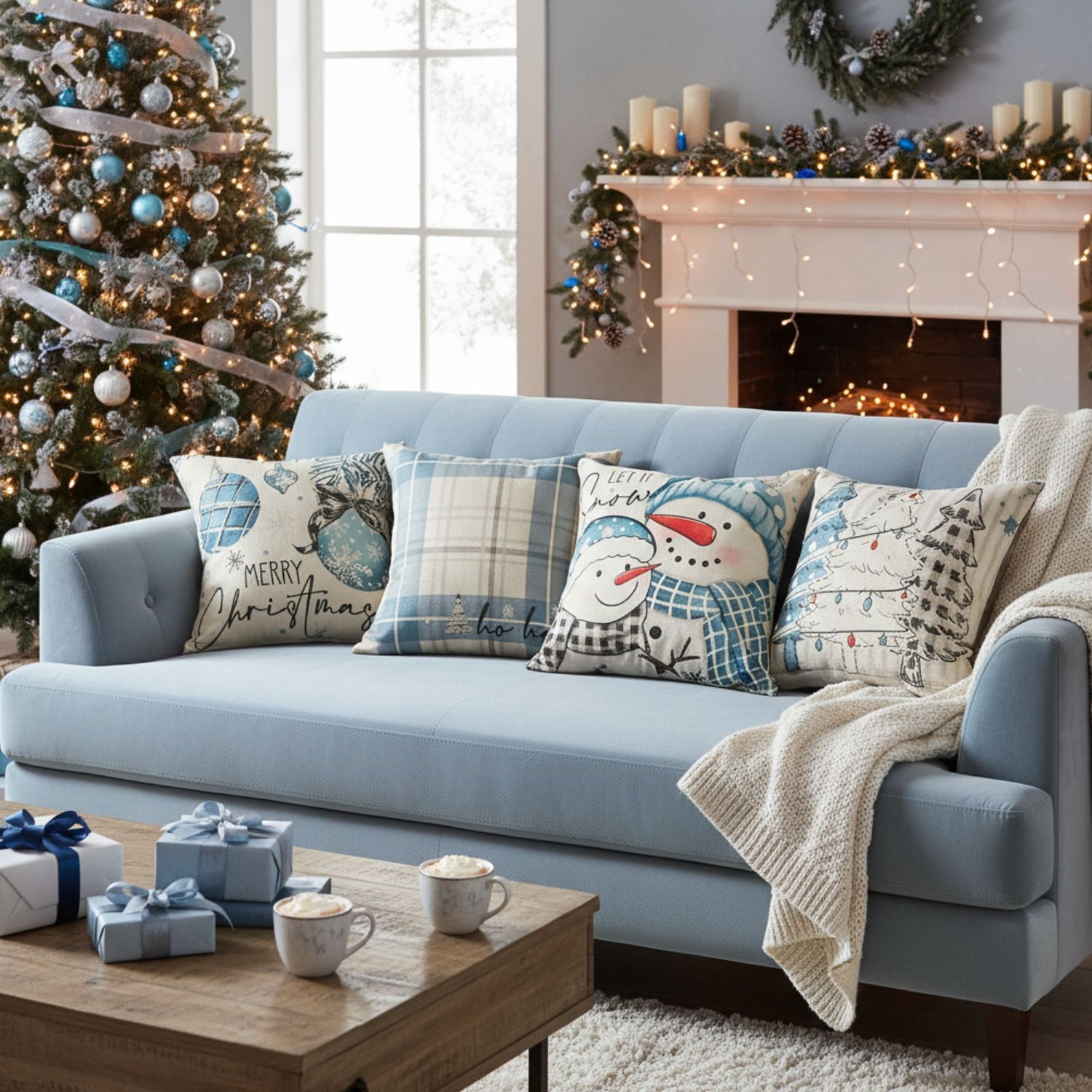 Wenn draussen der Wind weht und es langsam kälter wird, verwandelt sich dein Zuhause in den gemütlichsten Rückzugsort. Doch damit echte Weihnachtsstimmung einzieht, braucht es mehr als nur Kerzenlicht und Tannenzweige – es sind die kleinen Details, die Wärme und Geborgenheit schaffen. Dieses 4er-Set an quadratischen Weihnachts-Kissenbezügen (Masse: 45cm x 45cm, Gewicht: 65g pro Bezug) bringt mit seinen festlichen Motiven und den sanften Farben in Beige und Blau harmonische Akzente in dein Wohnzimmer oder Schlafzimmer und sorgt für eine gemütliche, einladende Atmosphäre in der kalten Jahreszeit. Hergestellt aus einer hochwertigen Mischung aus Baumwolle und Leinen, fühlen sich die Kissenhüllen angenehm weich und natürlich an. Das Material ist antistatisch und hautfreundlich. Zudem sind die Bezüge besonders pflegeleicht. Sie sind waschmaschinengeeignet bis 30°C, verblassen nicht und behalten auch nach mehreren Waschgängen ihre Form. Die doppelseitigen Drucke der Dekokissen-Bezüge zeigen vier niedliche, liebevoll gestaltete Motive: geschmückte Weihnachtsbäume und Schneeflocken, eine Familie aus einem grossen und kleinen Schneemann mit "Let It Snow"-Schriftzug und einen Vogel, einen „Merry Christmas“-Schriftzug mit Christbaumkugel und Schneeflocken sowie ein kariertes Muster mit Weihnachtsbaum, Schneeflocken und "Ho Ho Ho"-Schriftzug. Mit den Massen von 45cm x 45cm passen die Zier-Bezüge auf gängige Kissen und sind dank Reissverschluss-Design leicht und schnell wechselbar. Sie eignen sich für Sofa, Bett, Stuhl oder Fensterbank und lassen sich sowohl im Wohnzimmer, im Schlafzimmer, als auch im Kinderzimmer oder Esszimmer wunderbar mit anderer Weihnachtsdeko kombinieren. Verwandle dein Zuhause mit diesem 4er-Set an Weihnachts-Kissenbezügen in eine weihnachtliche, festliche Wohlfühloase. Bitte beachte: Kissen sind nicht im Lieferumfang enthalten.