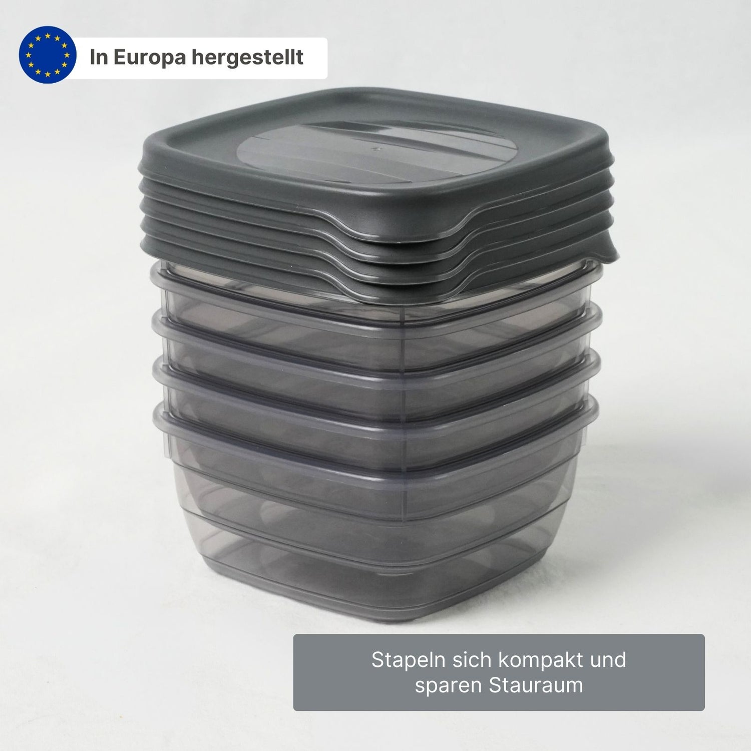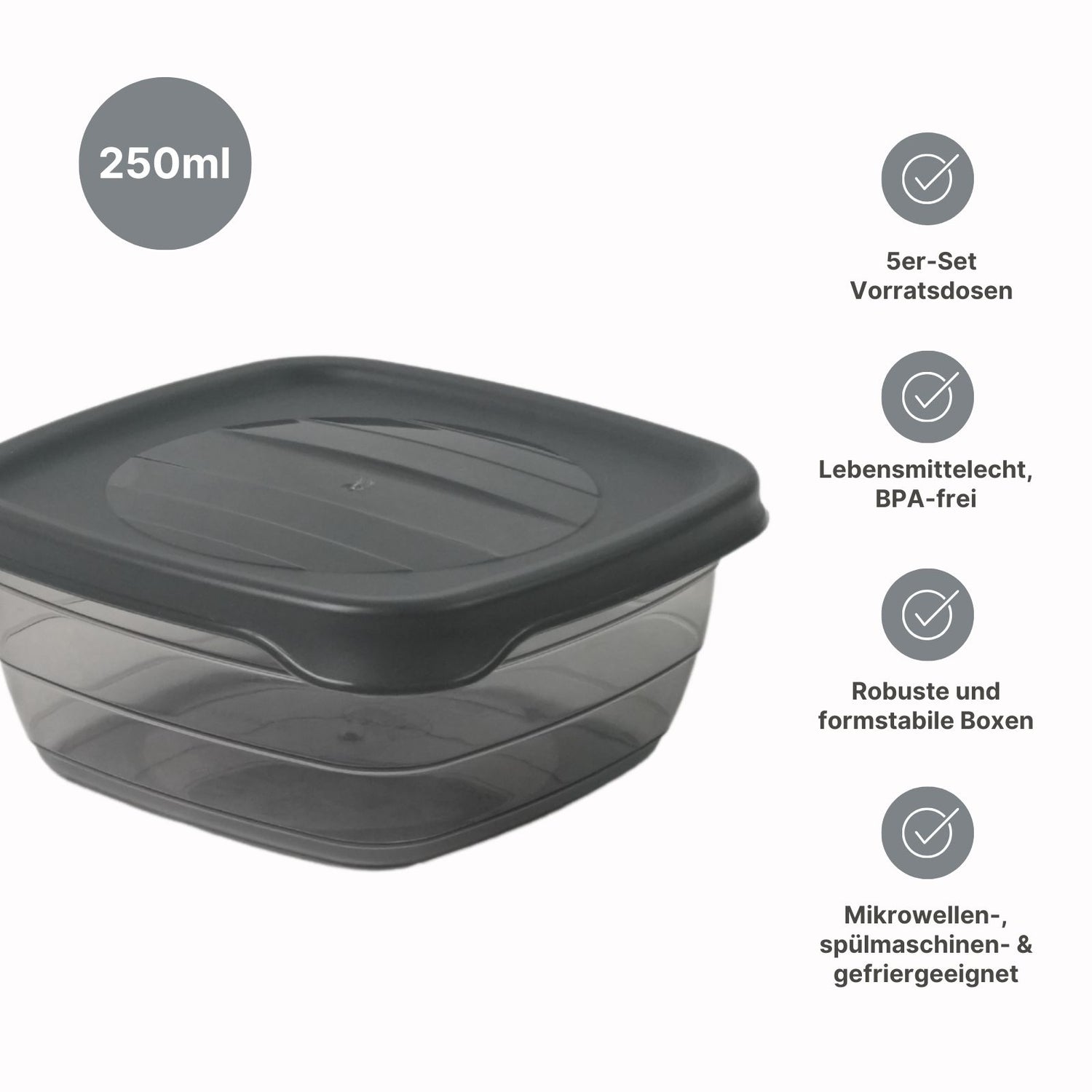 Kleine Portionen clever aufbewahren – mit diesem 5er-Set Frischhaltedosen bleibt alles übersichtlich, frisch und griffbereit. Ob übrig gebliebene Speisen, Gewürze, Saucen oder Snacks für unterwegs, die kompakten Vorratsdosen bieten eine praktische Lösung für die sichere Aufbewahrung verschiedenster Lebensmittel und sorgen für Ordnung wie Übersicht in der Küche. Das Set besteht aus 5 quadratischen Dosen mit jeweils 250ml Fassungsvermögen, die sich platzsparend ineinander stapeln lassen, wenn sie nicht gebraucht werden. Hergestellt in Europa, erfüllen diese Vorratsdosen hohe Qualitätsstandards. Das BPA-freie Polypropylen ist lebensmittelecht, langlebig und formstabil. Die Gefrierdosen sind zudem vielseitig nutzbar: Sie sind gefriergeeignet bis -25°C, wodurch sich Lebensmittel portionsweise einfrieren lassen. In der Mikrowelle kann das Essen direkt in der Frischhaltebox erhitzt werden – der Deckel sollte jedoch zuvor entfernt werden. Zudem sind die Aufbewahrungsdosen spülmaschinengeeignet und lassen sich so leicht reinigen. Die transparenten Behälter mit leicht dunkelgrauer Tönung ermöglichen eine schnelle Sicht auf den Inhalt, sodass sich jederzeit erkennen lässt, was noch vorrätig ist. Der dunkelgraue Deckel schliesst sicher, schützt Lebensmittel und hält sie länger frisch. Mit einer Grösse von 10cm x 10cm x 5cm und einem Gewicht von nur 23g sind die Boxen leicht zu handhaben und finden in jeder Küche ihren Platz. Egal ob für die Aufbewahrung im Kühlschrank, das Einfrieren von Speisen oder das schnelle Erwärmen in der Mikrowelle – dieses praktische 5er-Dosen-Set erleichtert den Alltag, hält Lebensmittel frisch und sorgt für mehr Übersicht und Ordnung.