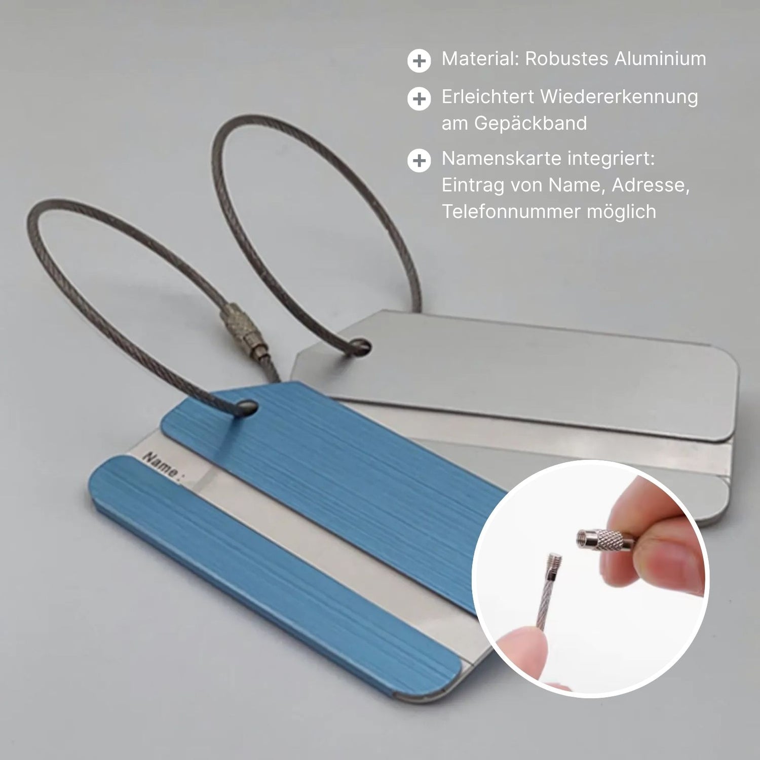Du stehst am Gepäckband, ein schwarzer Koffer nach dem anderen zieht vorbei. Doch welcher war nochmal deiner? Damit du dein Reisegepäck auf den ersten Blick erkennst, sorgt dieses 5er-Set farbiger Kofferanhänger aus robustem Aluminium für Ordnung und Wiedererkennung. Gleichzeitig ermöglicht es die diskrete Angabe deiner Kontaktdaten – für den Fall der Fälle. Die Gepäckanhänger sind 8cm x 4.2cm x 0.2cm gross, haben ein Gewicht von 14g pro Stück und werden jeweils mit einer stabilen Metallschlaufe geliefert, die einfach durch den Koffergriff gezogen und sicher verschraubt wird. Im Set enthalten sind fünf verschiedene Farben: Silbrig, Roségoldig, Violett, Blau und Grün. So kannst du dein Gepäck individuell kennzeichnen oder mehrere Koffer farblich unterscheiden. Auf der integrierten Namenskarte lassen sich Name, Adresse oder Telefonnummer eintragen. Die Karten sind durch das Aluminiumcover geschützt und von aussen nur durch den seitlichen Ausschnitt sichtbar. Deine persönlichen Daten sind damit nicht vollständig einsehbar. Ob für Koffer, Rucksäcke oder Reisetaschen, diese Kofferlabels sind vielseitig einsetzbar und erleichtern das Erkennen deines Gepäcks an Flughäfen, Bahnhöfen oder Busstationen. Das leichte, aber stabile Material sorgt dafür, dass das Koffernamensschild auch grössere Belastungen auf Reisen problemlos mitmacht. Ein farbenfrohes Reisezubehör-Set für alle, die gerne unterwegs sind und dabei auf Übersicht und Funktionalität setzen.