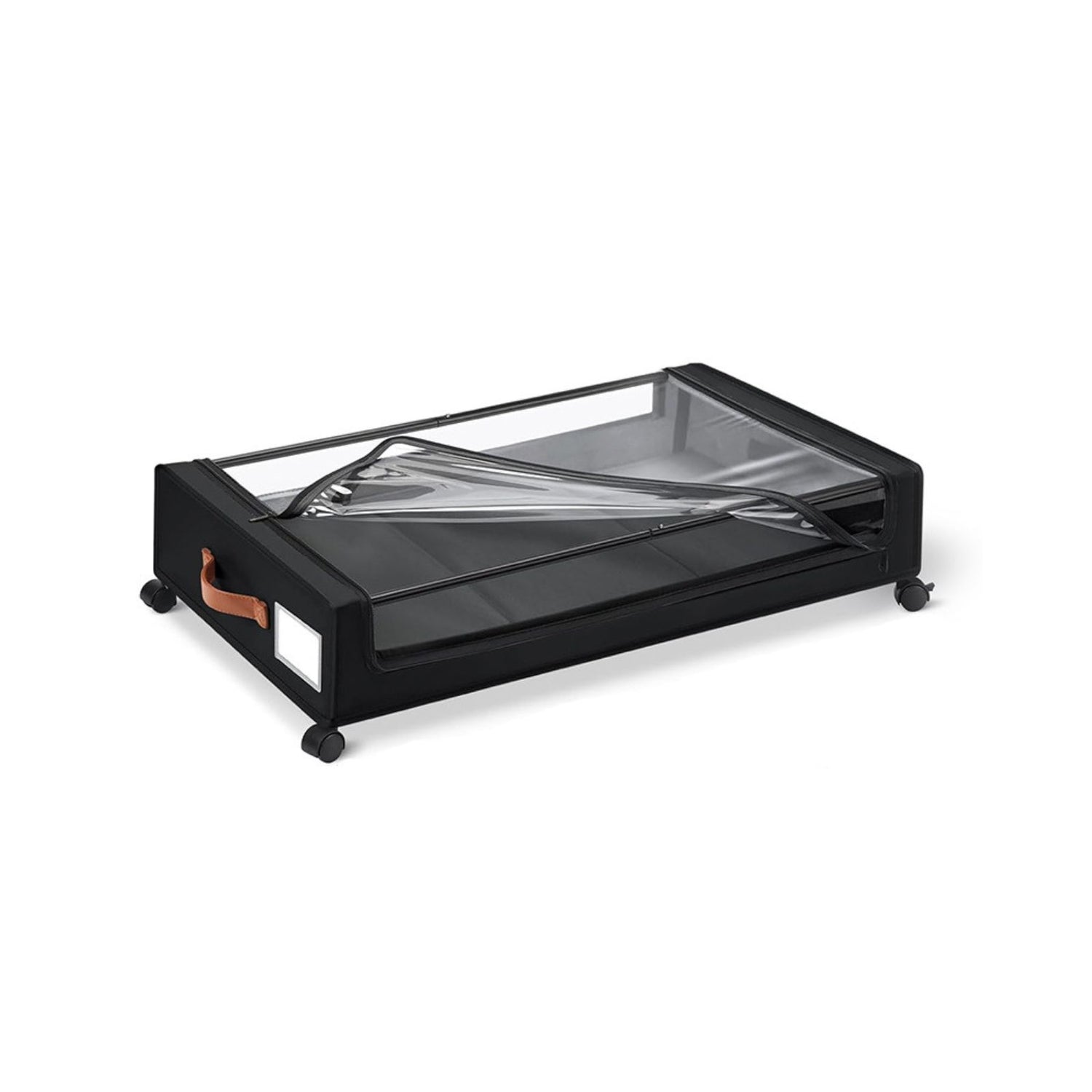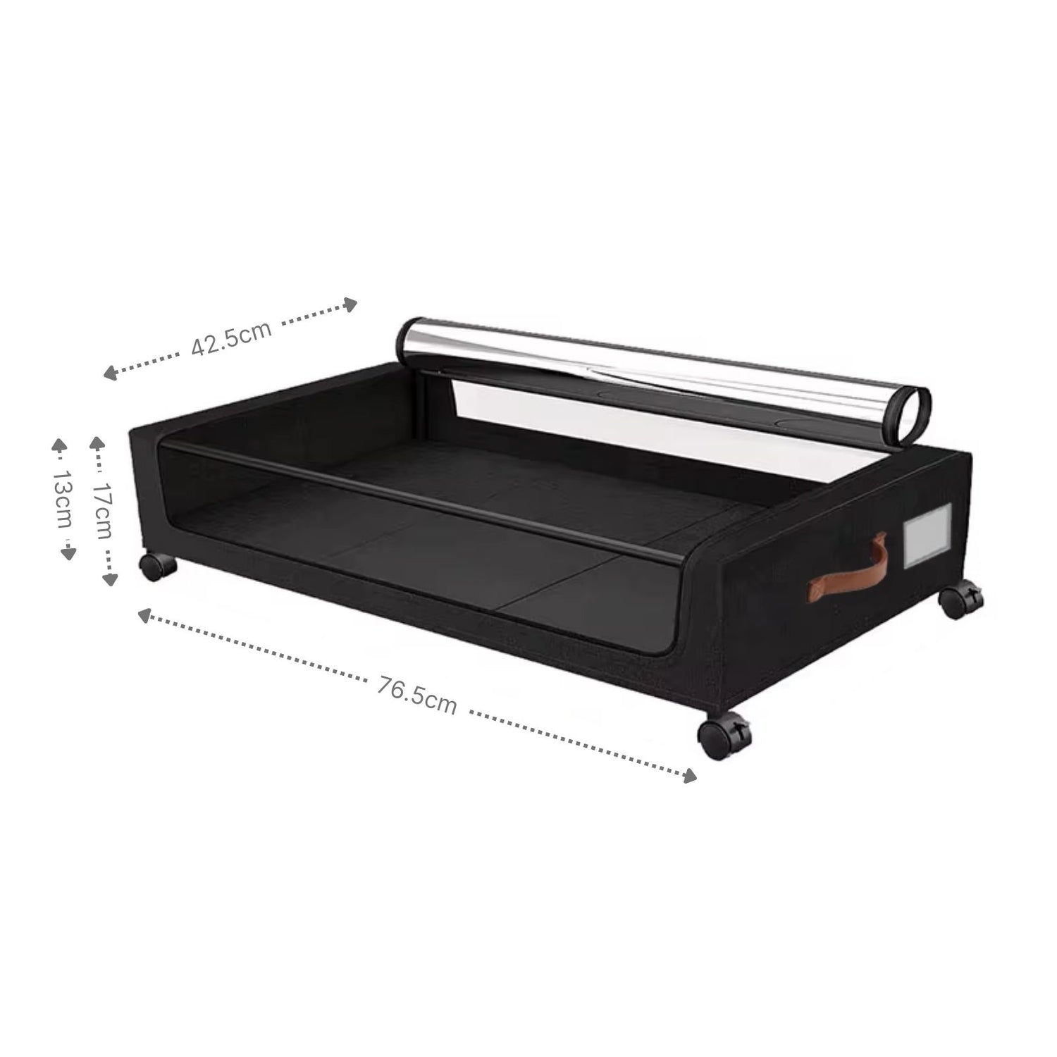 Dein Kleiderschrank platzt aus allen Nähten, aber unter dem Bett bleibt wertvoller Stauraum ungenutzt? Diese Aufbewahrungsbox mit Rollen schafft schnell und unkompliziert Ordnung – ob für Kleidung, Bettwäsche, Spielzeug oder Schuhe. Als flache Unterbettkommode mit den Massen 76.5cm x 42.5cm x 17cm (inkl. Rollen, Höhe ohne Rollen 13cm) passt sie unter viele gängige Betten und Sofas und hilft dir, auch enge Räume sinnvoll zu nutzen. Das durchdachte Design macht den Unterschied: Ein stabiles Metallgestell wird einfach zusammengesteckt und bildet das Grundgerüst der Box. Darüber wird die Hülle aus robustem schwarzen Oxford-Stoff mit transparenter Abdeckung gespannt. Sie schützt deine Gegenstände vor Staub und lässt sich mit einem Reissverschluss leicht öffnen und schliessen. Die durchsichtige Oberseite sorgt dafür, dass du jederzeit siehst, was sich in der Box befindet – ohne mühsames Suchen. Nach dem Einlegen des Bodens werden zum Schluss die Räder an der Unterseite fixiert – und schon ist die Unterbettbox einsatzbereit. Dank der vier leichtgängigen, feststellbaren Rollen, die sich um 360°drehen können, kannst du die Aufbewahrungstasche am seitlichen Tragegriff unter dem Bett oder Sofa hervorziehen und wieder verstauen. Und damit du auch bei mehreren Boxen den Überblick behältst, lässt sich das integrierte Etikettenfach ganz einfach beschriften. So siehst du auf einen Blick, was sich in der Unterbettkommode befindet. Ob als saisonale Kleidungslagerung, Spielzeugkiste im Kinderzimmer oder Schuhaufbewahrung im Flur – diese Tasche mit einem Volumen von ca. 35L passt sich flexibel deinem Bedarf an. Auch für Bücher, Decken oder Haustierzubehör wie Hundespielzeug bietet sie eine praktische Lösung.