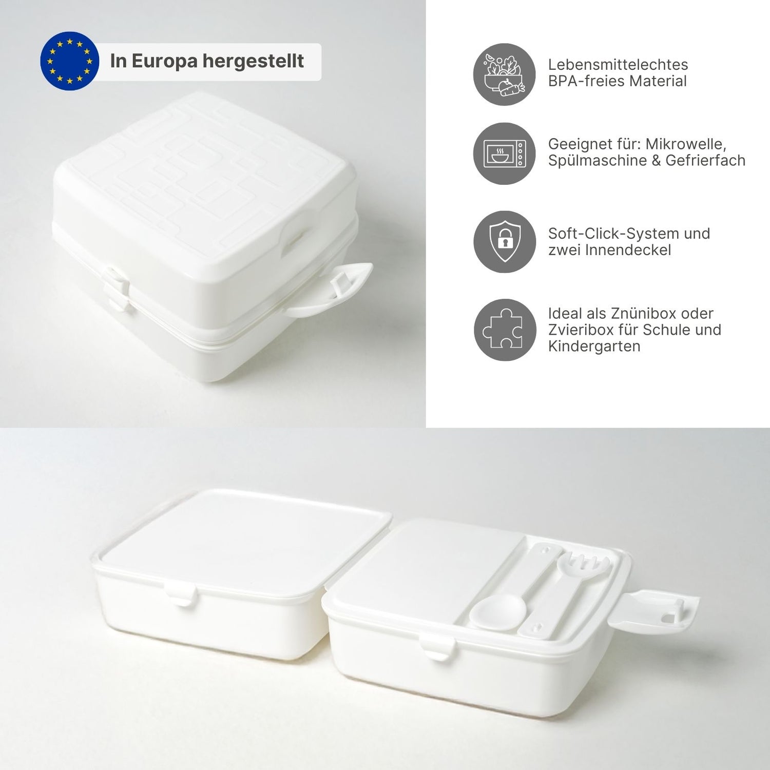 Die weisse Multi-Brot- und Lunch-Box mit Besteck bietet dir eine flexible Möglichkeit, Mahlzeiten sicher und übersichtlich aufzubewahren und mitzunehmen. Mit einem Volumen von 1.4 Litern und 4 Fächern unterschiedlicher Grösse hast du ausreichend Platz für Brote, Obst, Snacks und mehr. Dank des Soft-Click-Systems und den beiden Innendeckeln bleibt alles fest verschlossen, sodass unterschiedliche Speisen problemlos getrennt voneinander aufbewahrt werden können. Im Deckel integriert sind ein Löffel und eine Gabel, ideal für unterwegs. Das kinderfreundliche Design macht sie auch zur perfekten Znünibox oder Zvieribox für Kindergarten und Schule. Mit den kompakten Massen von 14.5cm x 14.5cm x 9cm im geschlossenen Zustand passt sie problemlos in Rucksäcke oder Taschen. Geöffnet hat sie eine Grösse von 29cm x 29cm x 4.5cm, wodurch du den Inhalt übersichtlich und bequem geniessen kannst. Hergestellt aus hochwertigem Polypropylen, ist die Lunchbox BPA-frei und lebensmittelecht, was sie sicher für alle Arten von Speisen macht. Die stabile Konstruktion sorgt für eine langlebige Nutzung und schützt den Inhalt vor dem Zerdrücken. Die Meal-Prep-Box ist mikrowellengeeignet, sodass du Speisen direkt darin aufwärmen kannst (Besteck vorher entnehmen). Ausserdem ist der Snackbehälter gefrier-geeignet bis -25°C, was dir noch mehr Flexibilität bei der Aufbewahrung bietet. Hergestellt in Europa erfüllt die Brotdose hohe Qualitätsstandards und überzeugt durch ihre robuste Verarbeitung. Sie ist zudem spülmaschinengeeignet, sodass du sie leicht reinigen kannst. Egal ob für die Arbeit, die Schule oder unterwegs – diese Multi-Brot- und Lunch-Box mit Besteck macht es einfach, Mahlzeiten frisch und sicher mitzunehmen und zu essen.