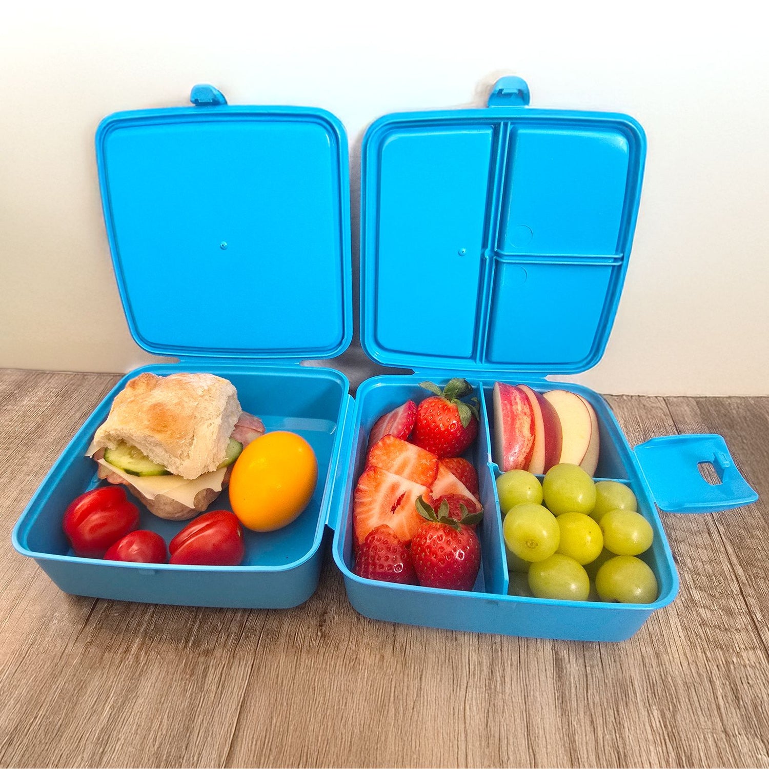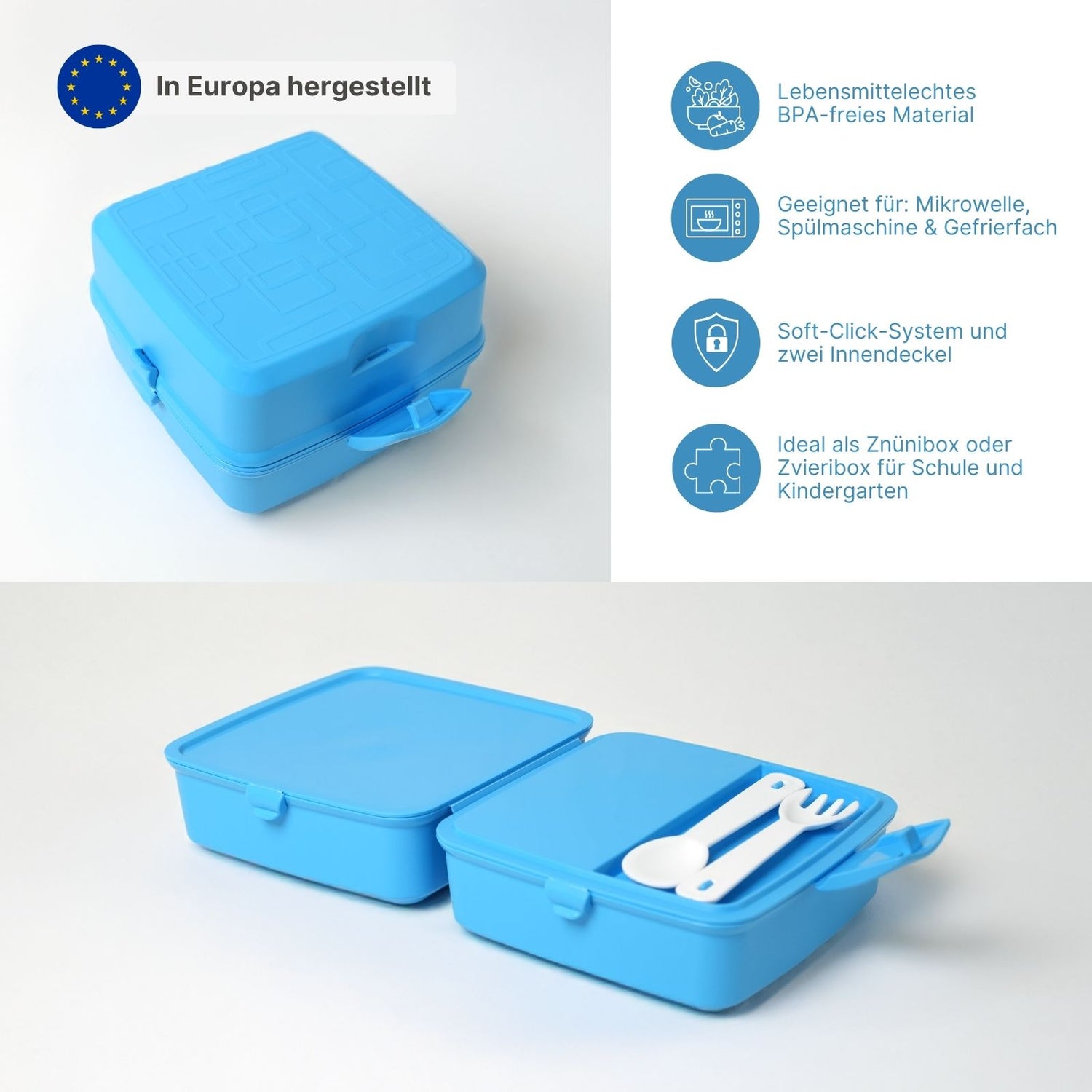 Die hellblaue Multi-Brot- und Lunch-Box mit Besteck bietet dir eine flexible Möglichkeit, Mahlzeiten sicher und übersichtlich aufzubewahren und mitzunehmen. Mit einem Volumen von 1.4 Litern und 4 Fächern unterschiedlicher Grösse hast du ausreichend Platz für Brote, Obst, Snacks und mehr. Dank des Soft-Click-Systems und den beiden Innendeckeln bleibt alles fest verschlossen, sodass unterschiedliche Speisen problemlos getrennt voneinander aufbewahrt werden können. Im Deckel integriert sind ein Löffel und eine Gabel, ideal für unterwegs. Das kinderfreundliche Design macht sie auch zur perfekten Znünibox oder Zvieribox für Kindergarten und Schule. Mit den kompakten Massen von 14.5cm x 14.5cm x 9cm im geschlossenen Zustand passt sie problemlos in Rucksäcke oder Taschen. Geöffnet hat sie eine Grösse von 29cm x 29cm x 4.5cm, wodurch du den Inhalt übersichtlich und bequem geniessen kannst. Hergestellt aus hochwertigem Polypropylen, ist die Lunchbox BPA-frei und lebensmittelecht, was sie sicher für alle Arten von Speisen macht. Die stabile Konstruktion sorgt für eine langlebige Nutzung und schützt den Inhalt vor dem Zerdrücken. Die Meal-Prep-Box ist mikrowellengeeignet, sodass du Speisen direkt darin aufwärmen kannst (Besteck vorher entnehmen). Ausserdem ist der Snackbehälter gefrier-geeignet bis -25°C, was dir noch mehr Flexibilität bei der Aufbewahrung bietet. Hergestellt in Europa erfüllt die Brotdose hohe Qualitätsstandards und überzeugt durch ihre robuste Verarbeitung. Sie ist zudem spülmaschinengeeignet, sodass du sie leicht reinigen kannst. Egal ob für die Arbeit, die Schule oder unterwegs – diese Multi-Brot- und Lunch-Box mit Besteck macht es einfach, Mahlzeiten frisch und sicher mitzunehmen und zu essen.