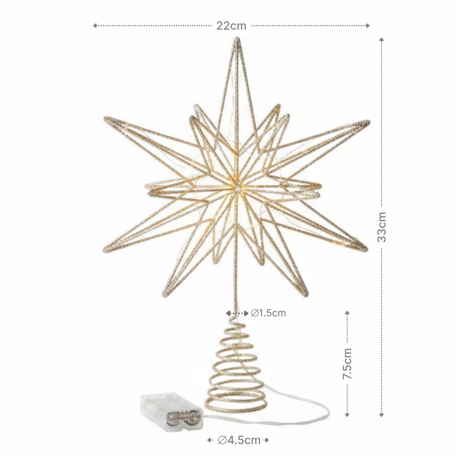 Wenn der Weihnachtsbaum schon geschmückt ist, aber noch das gewisse Etwas fehlt, bringt eine leuchtende Baumspitze den entscheidenden festlichen Glanz. Diese champagnerfarbige LED-Christbaumspitze in Sternform setzt dein Weihnachtsarrangement gekonnt in Szene und sorgt mit ihrem warmweissen Licht für einen strahlenden Abschluss deines Baums. Der sanfte Glanz der 20 integrierten LEDs lässt den Stern aus feinem Metall in klarem Licht erstrahlen – ein Highlight, das Tradition und moderne Eleganz verbindet. Die Oberfläche ist mit feinem Glitter überzogen, der im Licht wunderschön funkelt und für einen glitzernden, festlichen Effekt sorgt. Mit seinen kompakten Massen von 22cm x 6.5cm x 33cm und einem Gewicht von ca. 200g passt der Weihnachtsbaumschmuck auf mittelgrosse bis grosse Christbäume. Die stabile, 7.5cm lange Federhalterung mit einem Durchmesser von 4.5cm unten und 1.5cm oben sorgt für einen sicheren Sitz auf dem Weihnachtsbaum und lässt sich leicht anbringen. Dank Batteriebetrieb kannst du die Weihnachtsdeko unabhängig von Steckdosen frei im Raum platzieren – ganz nach deinem Geschmack und Standort des Baums. Über das Batteriefach lässt sich die Beleuchtung bequem ein- und ausschalten (benötigt werden 2x AA-Batterien, nicht im Lieferumfang enthalten). Das transparente Batteriefachkabel mit einer Länge von 27.5cm fügt sich dezent in die Baumdekoration ein und bleibt nahezu unsichtbar. Ob klassisch, modern oder verspielt – diese LED-Baumspitze sorgt für eine festliche Atmosphäre und bringt deinen Baum stilvoll zum Strahlen.