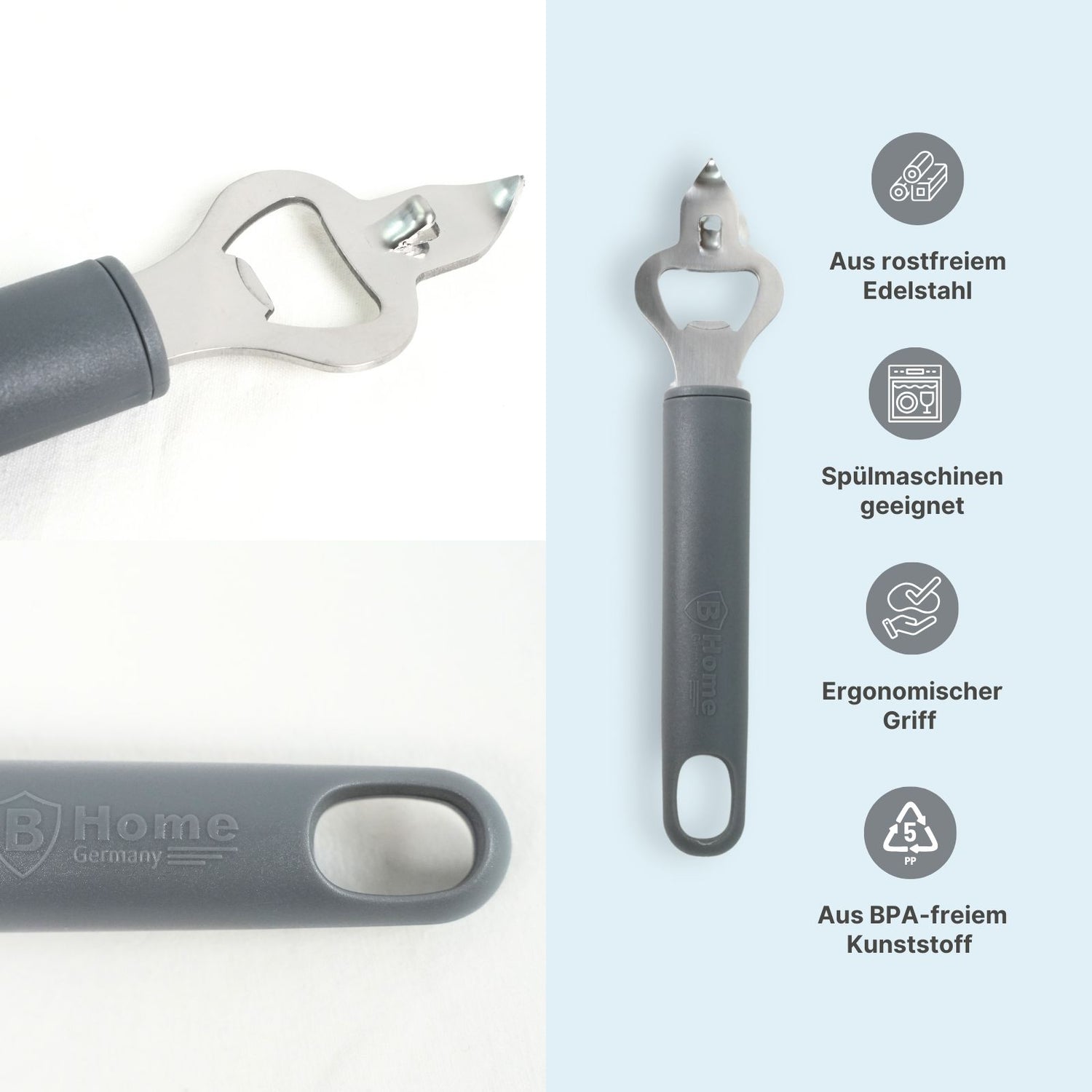 Ein langer Tag neigt sich dem Ende und eine erfrischende Flasche deines Lieblingsgetränks wartet nur auf dich. Das einzige, was dem kühlen Genuss noch im Weg steht, ist ein festsitzender Kronkorken. Dieser Flaschenöffner aus hochwertigem Edelstahl ermöglicht dir das mühelose Öffnen von Flaschen mit Kronkorken oder auch das Anstechen von Dosen im Nu! Dank seiner stabilen Verarbeitung liegt er angenehm in der Hand und sorgt für eine komfortable Handhabung. Die zwei integrierten Öffner bieten vielseitige Einsatzmöglichkeiten – der klassische Kapselheber entfernt Kronkorken sicher und mit minimalem Kraftaufwand, während die spitze Öffnungshilfe das Anstechen von Dosen erleichtert. So kannst du den flüssigen Inhalt, wie Kondensmilch oder Obstsaft, kontrolliert ausgiessen, ohne einen separaten Dosenöffner zu benötigen. Der Flaschenöffner misst insgesamt 19.5cm x 4.3cm x 2cm, wobei der ergonomische Griff aus BPA-freiem Kunststoff einen sicheren Halt bietet. Die robuste Verarbeitung aus rostfreiem Edelstahl macht den Öffner langlebig, stabil und lebensmittelecht. Durch die praktische Aufhängeöse lässt sich der Flaschenheber platzsparend verstauen und ist jederzeit griffbereit. Zudem ist er spülmaschinengeeignet und lässt sich mühelos reinigen – ein praktischer Begleiter für deine Küche, Bar oder unterwegs.