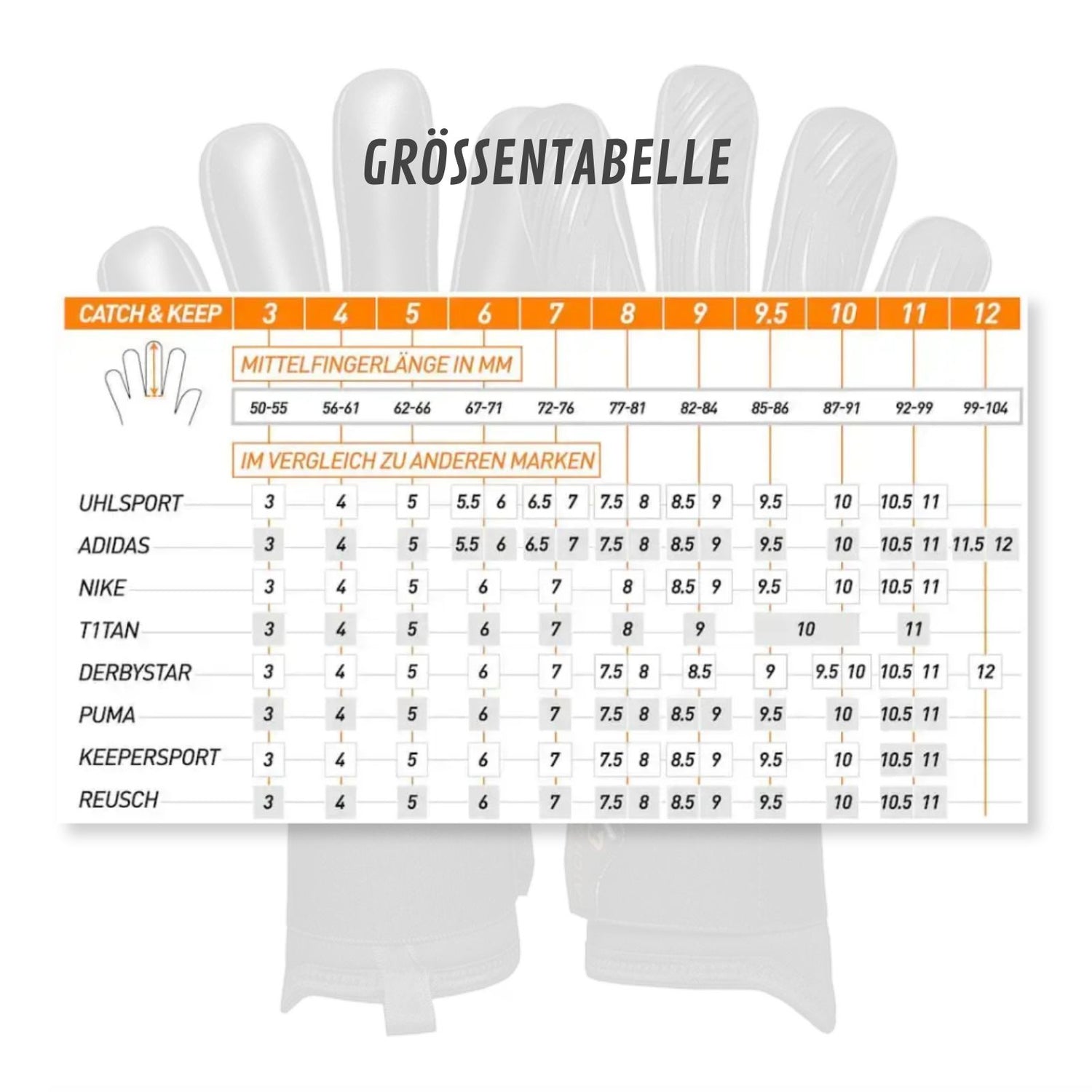 Wenn du im Tor stehst, zählt jede Sekunde und jeder Griff muss sitzen. Nasse Finger, rutschiger Ball, kraftvoller Schuss – eine typische Spielsituation, die höchste Konzentration verlangt. Selbst bei solch schwierigen Bedingungen sorgen die Invictus Black Gold Fussballhandschuhe für zuverlässigen Grip, Kontrolle und ein Tragegefühl, das sich wie eine zweite Haut anfühlt. Der Premium 4mm Viper Grip bietet dir zuverlässige Performance bei trockenen und nassen Bedingungen und sichere Kontrolle über den Ball. Zusammen mit dem weichen 3mm Schaumstoff sorgen die Handschuhe für eine ausgewogene Kombination aus Rückmeldung und Dämpfung, wodurch deine Hände und Handgelenke geschützt werden. Der Negative Cut+ mit etwas breiterem Schnitt legt sich passgenau um deine Finger und vermittelt dir ein stabiles und gleichzeitig bequemes Spielgefühl im Handschuh beim Fausten und Fangen. Dank des flexiblen NeoFlex-Oberhandmaterials wird jede Bewegung deiner Hand unterstützt und blitzschnelle Reaktionen im Strafraum ermöglicht. Die elastische, fixierte Bandage sorgt dabei für ein stabiles und rutschfestes Tragegefühl. Durch die innovative Grip Protection sind deine Handschuhe besser vor Rissen und Abrieb geschützt. Dieses Torwarthandschuh-Paar in Grösse 7 passt bei einer Mittelfingerlänge von 7.2cm bis 7.6cm. Die Grössentabelle in den Produktbildern hilft dir dabei, die richtige Grösse zu finden. Geliefert werden die Goalie-Handschuhe in einer Mesh-Bag zur sicheren und ordentlichen Aufbewahrung. Pflegehinweis: Wasche die Handschuhe per Hand unter kaltem oder lauwarmem Wasser. Drücke sie anschliessend vorsichtig aus, ohne sie zu drehen und zu wringen, und lasse sie halbnass in einem Handtuch trocknen. Vermeide direkte Sonneneinstrahlung sowie das Trocknen auf Heizkörpern.