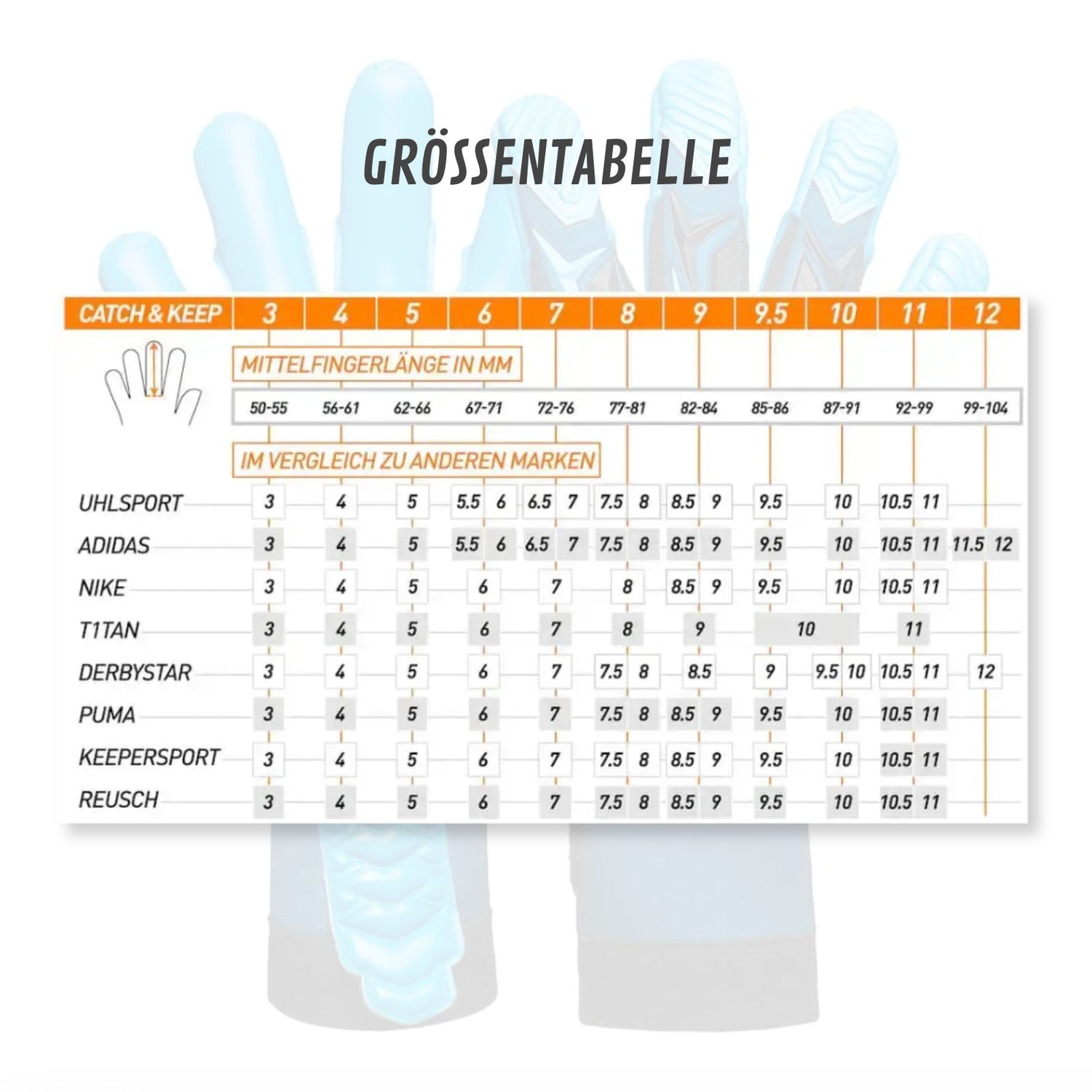 Wenn der Ball in hohem Tempo auf dich zufliegt, kommt es auf die richtige Ausstattung an. Die ViVor Rainy Blue Fussballhandschuhe sind dafür gemacht: Sie bieten dir zuverlässigen Grip, eine präzise Passform und volle Bewegungsfreiheit – abgestimmt auf die hohen Anforderungen im Tor. Der 4mm Profi Octopus Grip sorgt für sicheren Halt bei jedem Ballkontakt, selbst bei kraftvollen Abschlüssen. Er wird durch die Hybrid Flat Cut-Form mit rund gearbeiteten Fingern ergänzt, die die Ballkontaktfläche vergrössert, die Kontrolle verbessert und eine präzise, flexible Fingerführung beim Fangen und Fausten ermöglicht. Zusammen mit dem weichen 3mm Schaumstoff sorgen die Handschuhe für eine ausgewogene Kombination aus Rückmeldung und Dämpfung, wodurch deine Hände geschützt werden. Das atmungsaktive AirFlex Breathaprene-Material passt sich deiner Hand an und sorgt auch bei hoher Belastung für angenehmen Tragekomfort. Für mehr Beweglichkeit lässt sich die Handgelenkslasche bei Bedarf einfach abnehmen. Die integrierte Punching Zone schützt deine Finger beim Fausten und dämpft harte Schüsse gezielt ab. Dieses Torwarthandschuh-Paar in Grösse 9 passt bei einer Mittelfingerlänge von 8.2cm bis 8.4cm. Die Grössentabelle in den Produktbildern hilft dir dabei, die richtige Grösse zu finden. Geliefert werden die Goalie-Handschuhe in einer Mesh-Bag zur sicheren und ordentlichen Aufbewahrung. Die Grip-Fläche der Fussballhandschuhe ist mit einer Folie geschützt, die vor dem ersten Gebrauch entfernt werden muss. Pflegehinweis: Wasche die Handschuhe per Hand unter kaltem oder lauwarmem Wasser. Drücke sie anschliessend vorsichtig aus, ohne sie zu drehen und zu wringen, und lasse sie halbnass in einem Handtuch trocknen. Vermeide direkte Sonneneinstrahlung sowie das Trocknen auf Heizkörpern.