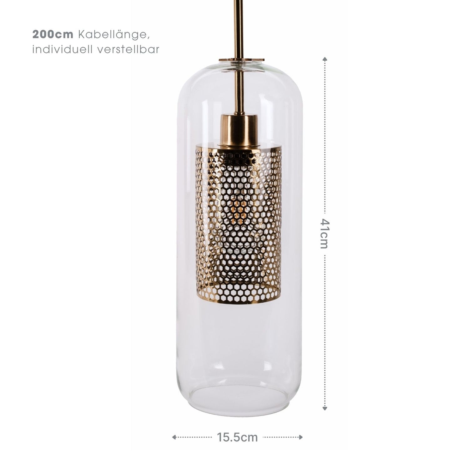 Wenn abends sanftes Licht den Raum erfüllt, entsteht eine Stimmung, die sofort zur Ruhe kommen lässt und den Alltag vergessen macht. Diese moderne Glas-Deckenleuchte mit industriell-elegantem Charakter verbindet stilvolles Design mit warmer Ausstrahlung. Das transparente Glas des zylindrischen Lampenschirms lässt das Licht gleichmässig strahlen und erzeugt eine behagliche Atmosphäre – ideal für entspannte und ruhevolle Abende. Die Pendelleuchte kombiniert das goldige Metall aus galvanisiertem Eisen und den Glas-Lampenschirm zu einer eleganten Hängelampe, die sich harmonisch in deinen Indoor-Bereich einfügt, z.B. in Schlafzimmer, Küche, Esszimmer, Café, Restaurant oder Loft. Das mitgelieferte LED-Leuchtmittel (4W, 220V) mit 2700K Farbtemperatur sorgt für angenehm warmweisses Licht, ist dimmbar und überzeugt mit einer Lebensdauer von bis zu 30000h. Ausgestattet mit einer E27-Fassung kannst du auch andere LEDs oder Glühlampen einsetzen und das Licht nach deinen Vorstellungen variieren. Mit einer Schirmgrösse von 15.5cm x 15.5cm x 41cm und einem Baldachin von 9.5cm x 9.5cm x 2cm eignet sich die Deckenlampe optimal für Flächen von etwa 10-15m². Mit einer Kabellänge von 200cm, die sich bei der Montage individuell kürzen lässt, eignet sich die Hängeleuchte zudem für unterschiedliche Raumhöhen. Das Anbringen der Leuchte gelingt unkompliziert mit dem im Set enthaltenen Befestigungsmaterial. Ob über dem Esstisch, als dezente Beleuchtung im Schlafzimmer oder als stilvolles Detail in Bar oder Restaurant – diese Pendelleuchte schafft ein wohliges Ambiente.