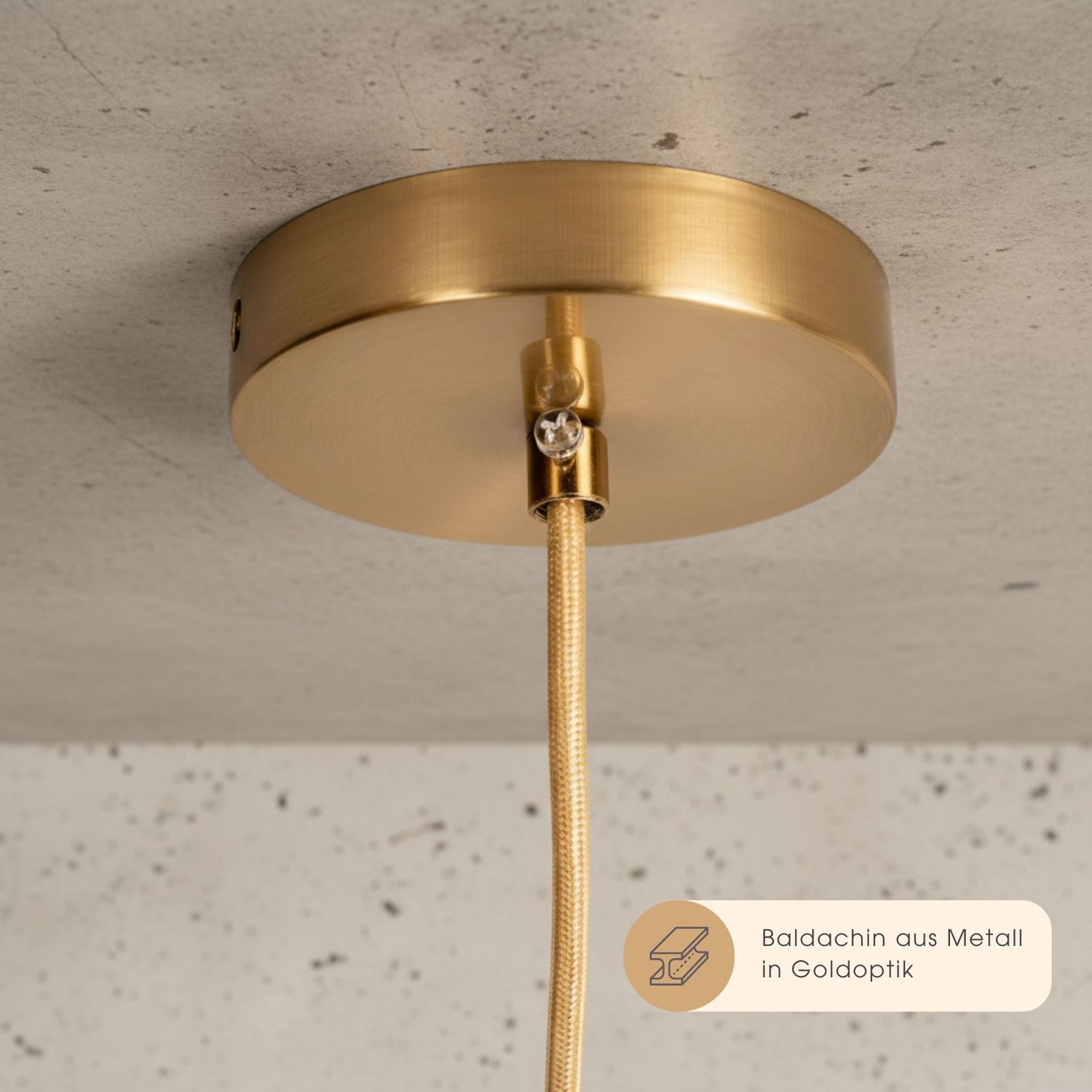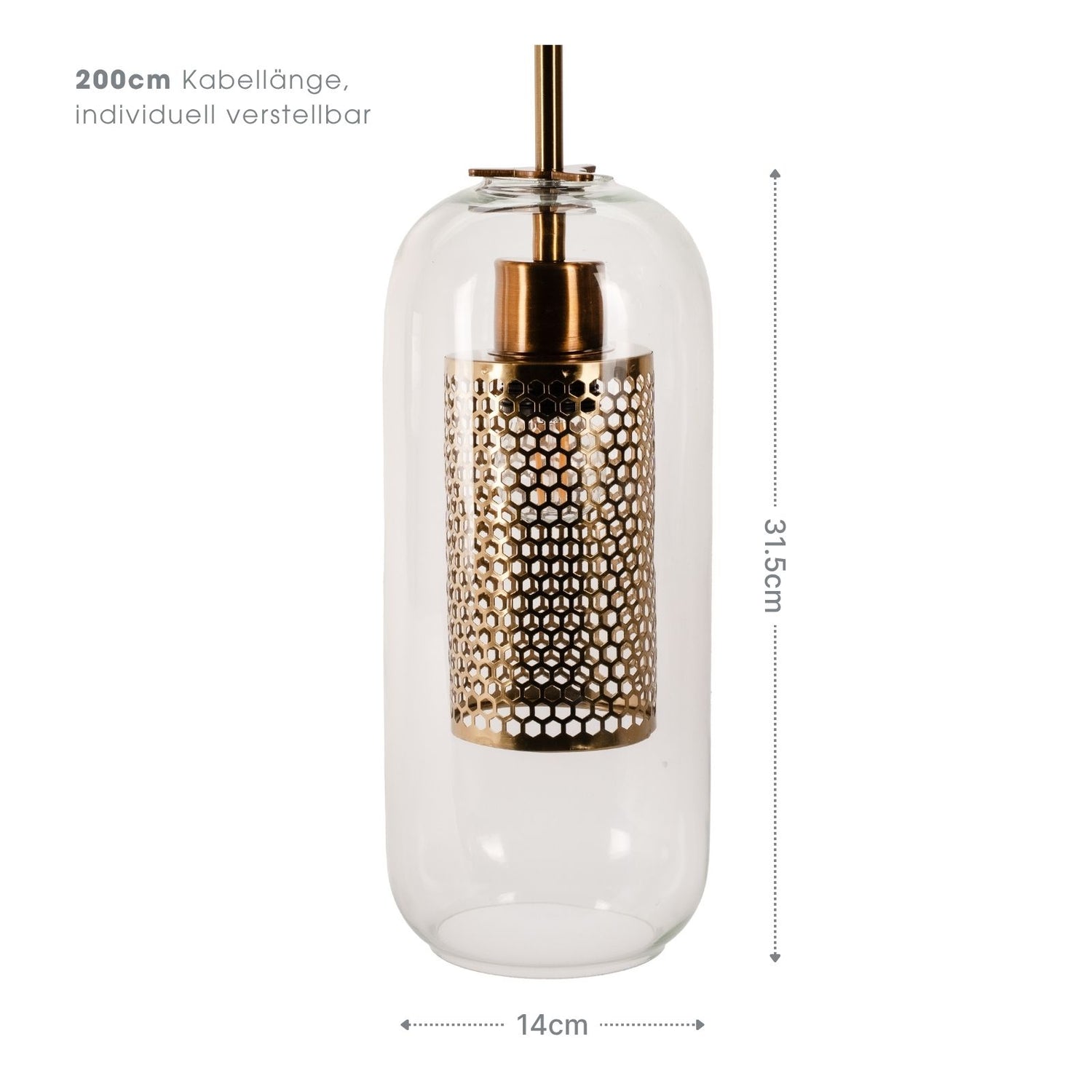 Wenn abends sanftes Licht den Raum erfüllt, entsteht eine Stimmung, die sofort zur Ruhe kommen lässt und den Alltag vergessen macht. Diese moderne Glas-Deckenleuchte mit industriell-elegantem Charakter verbindet stilvolles Design mit warmer Ausstrahlung. Das transparente Glas des zylindrischen Lampenschirms lässt das Licht gleichmässig strahlen und erzeugt eine behagliche Atmosphäre – ideal für entspannte und ruhevolle Abende. Die Pendelleuchte kombiniert das goldige Metall aus galvanisiertem Eisen und den Glas-Lampenschirm zu einer eleganten Hängelampe, die sich harmonisch in deinen Indoor-Bereich einfügt, z.B. in Schlafzimmer, Küche, Esszimmer, Café, Restaurant oder Loft. Das mitgelieferte LED-Leuchtmittel (4W, 220V) mit 2700K Farbtemperatur sorgt für angenehm warmweisses Licht, ist dimmbar und überzeugt mit einer Lebensdauer von bis zu 30000h. Ausgestattet mit einer E27-Fassung kannst du auch andere LEDs oder Glühlampen einsetzen und das Licht nach deinen Vorstellungen variieren. Mit einer Schirmgrösse von 14cm x 14cm x 31.5cm und einem Baldachin von 9.5cm x 9.5cm x 2cm eignet sich die Deckenlampe optimal für Flächen von etwa 10-15m². Mit einer Kabellänge von 200cm, die sich bei der Montage individuell kürzen lässt, eignet sich die Hängeleuchte zudem für unterschiedliche Raumhöhen. Das Anbringen der Leuchte gelingt unkompliziert mit dem im Set enthaltenen Befestigungsmaterial. Ob über dem Esstisch, als dezente Beleuchtung im Schlafzimmer oder als stilvolles Detail in Bar oder Restaurant – diese Pendelleuchte schafft ein wohliges Ambiente.