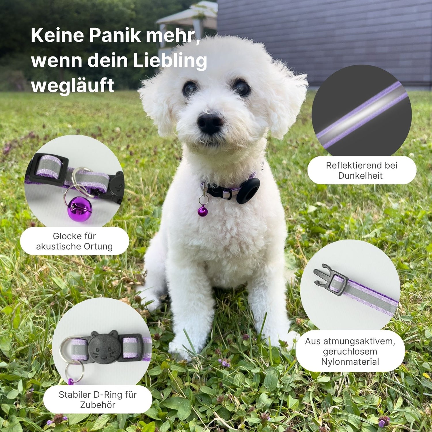 Manchmal genügt ein kurzer Moment der Unachtsamkeit – die Tür steht einen Spalt offen, dein Haustier schlüpft hinaus, und du weisst nicht, wo es ist. Mit diesem Halsband mit AirTag-Halterung kannst du deine Katze, deinen Welpen oder kleinen Hund jederzeit lokalisieren, verlierst keine Zeit mit Suchen und musst dir keine Sorgen mehr darüber machen, wo sich deine Fellnase gerade aufhält – für die Sicherheit deines Lieblings und für dein gutes Gefühl. Das Hundehalsband in Violett integriert eine passgenaue Silikonhülle für den Apple AirTag GPS-Tracker (nicht im Lieferumfang enthalten), damit du deinen Vierbeiner jederzeit über die „Wo ist?“-App orten kannst. Die Hülle ist wasserfest, stossfest und weich, damit der AirTag gut geschützt ist und dein Tier sich trotzdem wohlfühlt. Das Katzenhalsband ist aus geruchlosem, fellschonendem und atmungsaktivem Nylonmaterial. Mit einem Gewicht von nur 8g bleibt das Welpenhalsband angenehm leicht. Die Länge lässt sich flexibel zwischen 17cm und 28cm anpassen, die Breite beträgt schlanke 1cm – ideal für Katzen, kleine Hunde wie Chihuahuas oder junge Welpen. Für zusätzliche Sicherheit sorgt der clevere Sicherheits-Clip-Verschluss: Bei starkem Ziehen öffnet sich das Halsband automatisch und verhindert so Verletzungen oder Strangulation. Das liebevolle und süsse Katzendesign mit runden Ohren verleiht dem Verschluss eine spielerische Note. Besonders praktisch: Der reflektierende Streifen des Halsbands erhöht die Sichtbarkeit deines Vierbeiners bei Dunkelheit. Die mitgelieferte, abnehmbare Glocke sorgt zusätzlich für leichtere auditive Ortung deines Haustiers. Ein robuster D-Ring aus Chrome ermöglicht das Anbringen eines Adressanhängers oder weiteren Zubehörs (nicht im Lieferumfang enthalten). Verliere deinen pelzigen Freund mit diesem Halsband mit AirTag-Halterung nicht mehr aus den Augen!