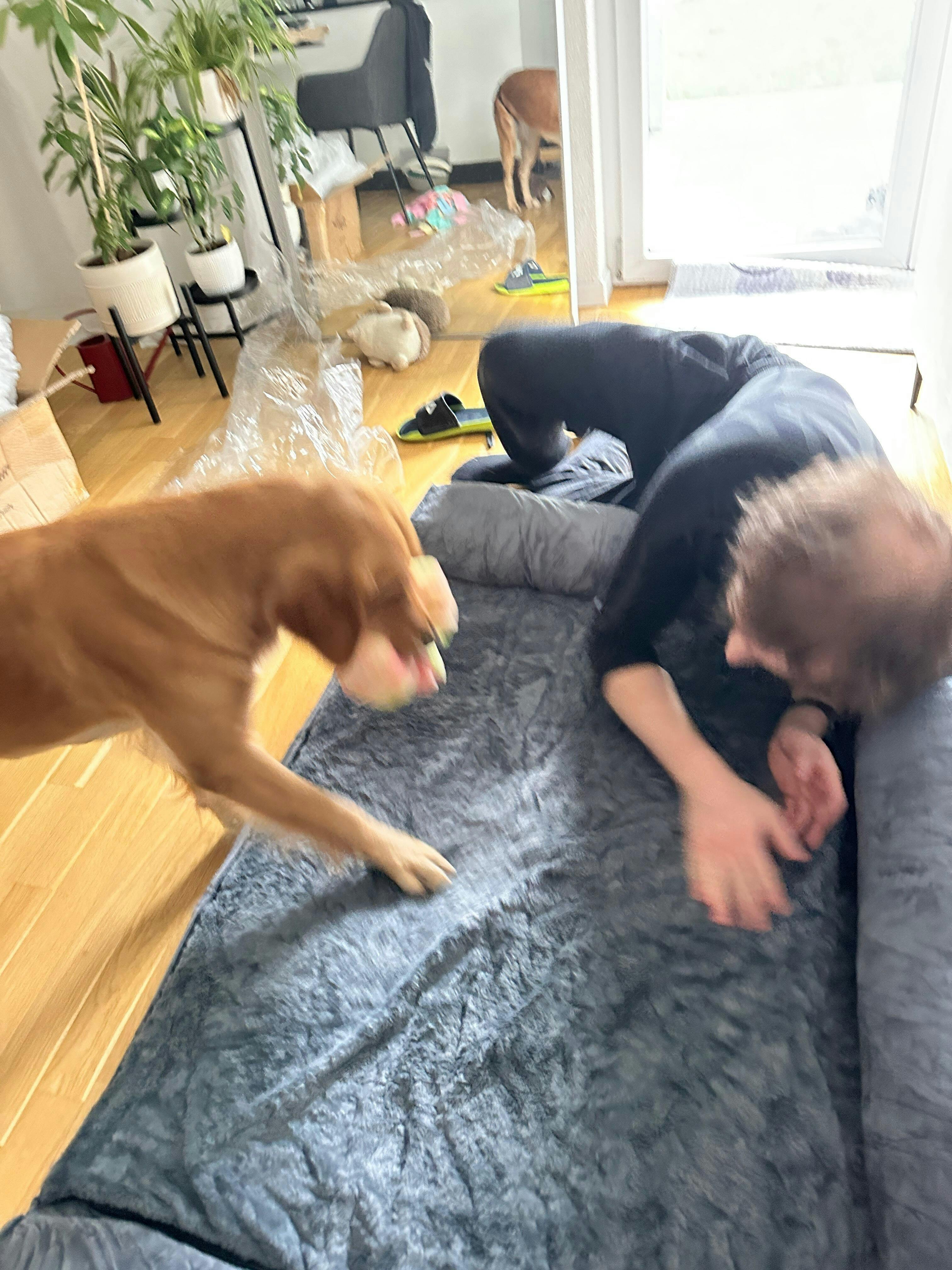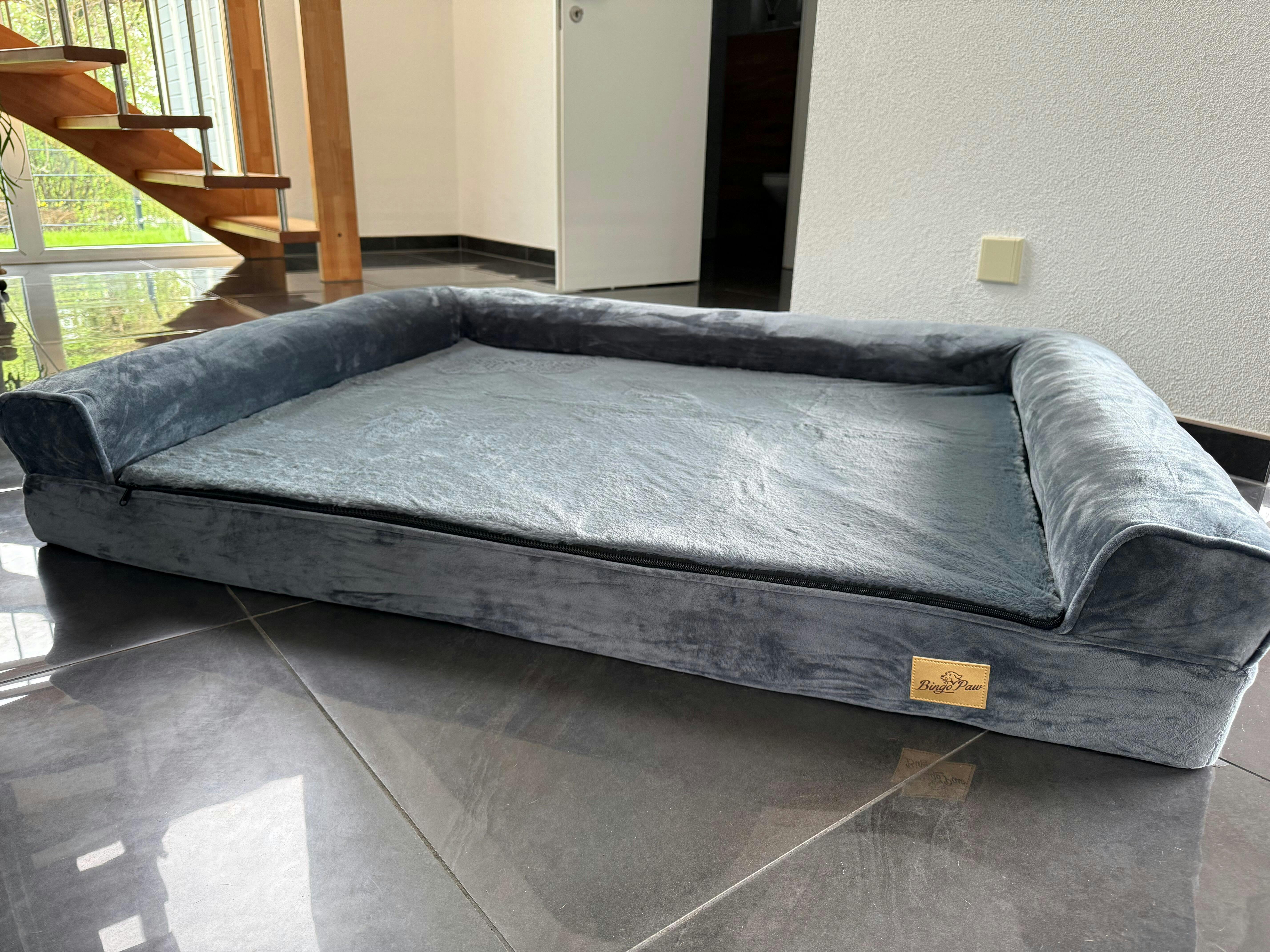 Nach einem langen Spaziergang durch Wald und Wiese freut sich dein pelziger Freund auf einen Ort, an dem er zur Ruhe kommen kann. Doch wenn das Hundebett zu dünn gepolstert ist oder nach kurzer Zeit durchgelegen wirkt, wird der Schlaf deines Vierbeiners unruhig. Genau hier setzt dieses orthopädische Hundebett an. Es wurde speziell entwickelt, um deinem Hund nicht nur ein weiches Plätzchen zu bieten, sondern seine Gelenke zu entlasten und die Regeneration zu fördern. Mit 135cm x 100cm x 24cm ist es grosszügig für deinen vierbeinigen Begleiter bemessen. Im Inneren wartet orthopädischer Schaum, der sich punktgenau an die Körperform deines Hundes anpasst. Das entlastet Hüften und Wirbelsäule spürbar – besonders wichtig für ältere Tiere oder solche mit Gelenkproblemen. Dein Hund kann sich in den flauschigen Plüschbezug einkuscheln, der von einer 12cm dicken Füllung gestützt wird und durch die weiche, angenehme Liegefläche erholsamen Schlaf geniessen. Die Oberfläche hält Urin und Wasser ab, ohne unangenehme Gerüche zu hinterlassen. Zudem ist der Bezug maschinenwaschbar, widerstandsfähig und kratzfest, ideal für lebendige Hund und wenn es mal wieder etwas wilder zugeht. Dank der wasserabweisenden Oxford-Unterseite kannst du das Bett auch draussen nutzen – auf dem Balkon, der Terrasse oder im Garten. Tipp: Wenn du das Bett zum ersten Mal auspackst, nimm den Bezug ab und lege den Schaumstoff auf den Boden. Verwende einen Föhn, um den Stoff in seine ursprüngliche Form zurückzubringen. Schaffe mit diesem orthopädischen Hundebett nicht nur einen Ort zum Schlafen, sondern gib deinem pelzigen Freund den Komfort, den er verdient und investiere in das Wohlbefinden deines geliebten Haustiers. Ersatzbezug erhältlich unter der Artikelnummer Hermex-139797.