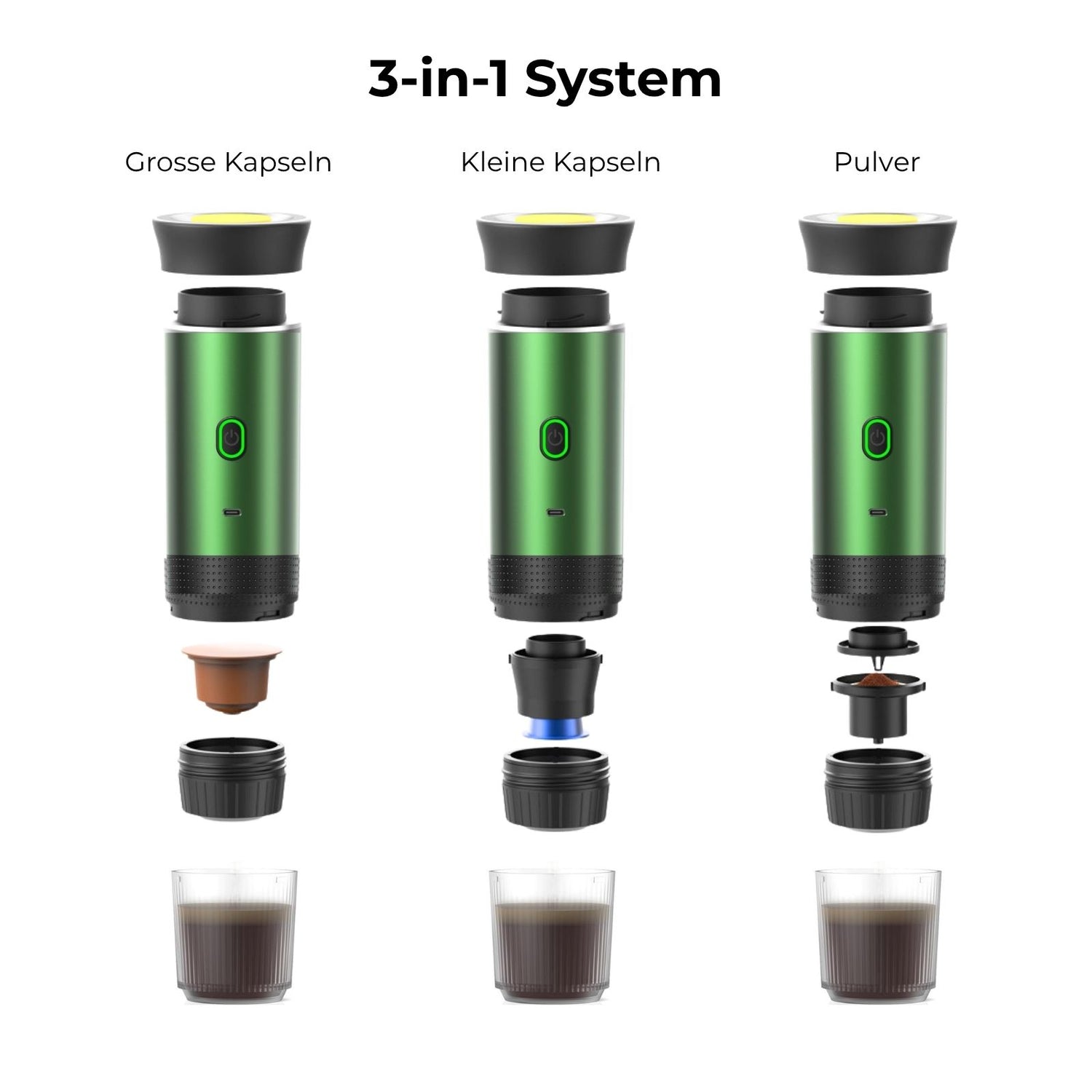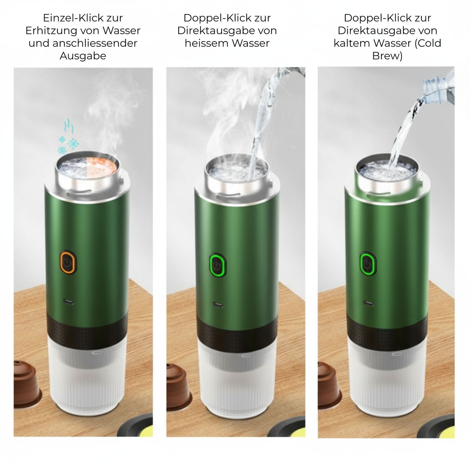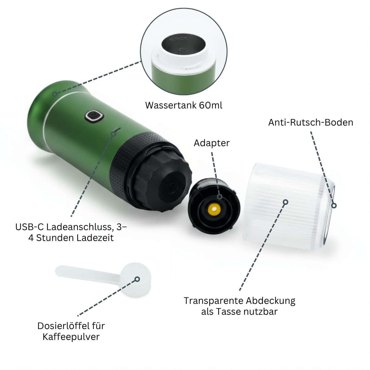 Noch bevor der Tag richtig beginnt, weht der Duft von frisch gebrühtem Kaffee durch deine Gedanken – doch unterwegs im Auto, beim Wandern oder im Büro scheint der nächste Espresso oft unerreichbar. Genau hier setzt diese tragbare Kaffeemaschine (72W, 5V) an: ein kabelloser Espressokocher, der dir jederzeit und überall heissen, aromatischen Kaffee oder Espresso schenkt. Das 3-in-1 System verarbeitet dank extra Aufsätzen Kaffeepulver, kleine wie auch grosse Kapseln und bietet so volle Flexibilität. Mit nur einem Doppelklick erhitzt die Kapselmaschine das in den Tank gefüllte Wasser (Kapazität: 60ml) in etwa 5 Minuten auf 92 °C (leuchtet Orange), signalisiert das Ende mit vier leisen Pieptönen und füllt automatisch rund 60 Sekunden lang 1 Tassenfüllung frischen Kaffee in den integrierten Becher (Kapazität: 120ml). Durch Gedrückt-Halten kann heiss aufgefülltes oder kaltes Wasser direkt ausgeschenkt werden und so auch Cold Brew Kaffee genossen werden. Das dunkelgrüne Gehäuse aus ABS, Edelstahl 304 und PC bietet eine griffige Oberfläche. Die transparente Abdeckung lässt sich als Kaffeetasse nutzen, während der Anti-Rutsch-Boden des Bechers für sicheren Stand sorgt. Mit dem mitgelieferten USB-C-Ladekabel lädst du über den USB-C-Ladeport den 2500mAh Akku des Kaffeeautomaten in etwa 3-4 Stunden komplett auf – genug für etwa 50 Einsätze. Mit 8.4cm x 8.4cm x 24.6cm und nur 710g passt das Gerät problemlos in Rucksack, Reisetasche oder Schreibtischschublade und ist ideal für Wanderungen, Camping, Büro, lange Autofahrten oder den gemütlichen Morgen zuhause. Und wenn es um die Pflege geht, genügt ein kurzer Spülgang: Einfach frisches Wasser einfüllen und ohne Kapsel laufen lassen. So bleibt deine Maschine mühelos sauber und bereit für den nächsten aromatischen Moment. Die Kaffeemaschine ist kompatibel mit Dolce Gusto und Nespresso Kapseln.