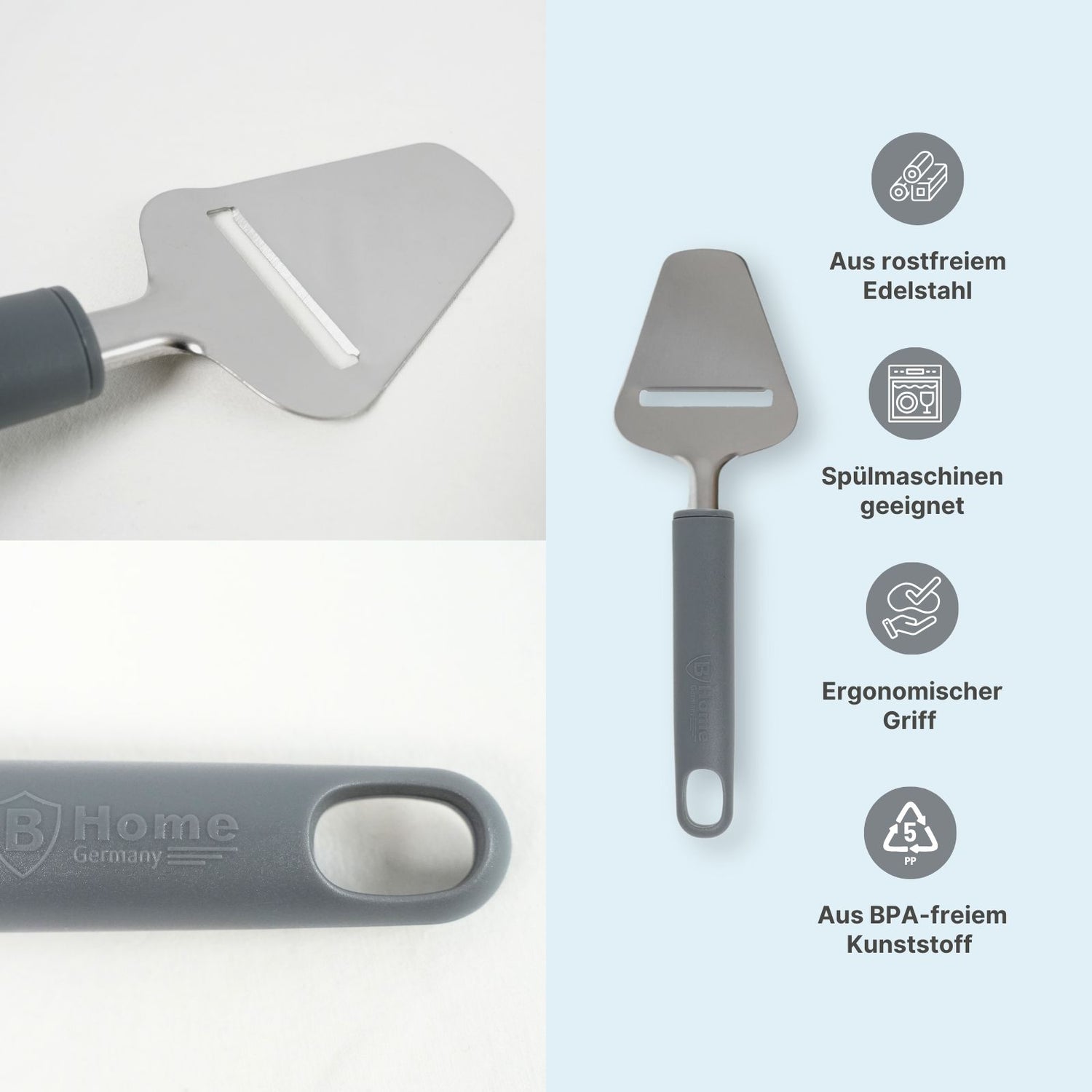Ein frisch aufgeschnittenes Stück Käse entfaltet sein volles Aroma, während du es genussvoll auf dein Brot legst oder kunstvoll auf einer Käseplatte arrangierst. Dieser Käsehobel aus hochwertigem Edelstahl ermöglicht dir das mühelose Schneiden von feinen Käsescheiben – perfekt für deinen Frühstückstisch oder eine ansprechende Käseplatte. Mit seiner scharfen Klinge gleitet er leicht durch Hart- und Schnittkäse und sorgt für gleichmässige Scheiben, die sich ideal auf dem Brot oder als Snack eignen. Mit Massen von 22.5cm x 7.5cm x 2cm und dem ergonomischen Griff aus BPA-freiem Kunststoff, liegt er angenehm in der Hand und ermöglicht dir ein sicheres und rutschfestes Schneiden. Hergestellt aus rostfreiem Edelstahl, ist der Käseschneider lebensmittelecht und sicher für alle Arten von Käse. Die hochwertige Verarbeitung sorgt dafür, dass der Hobel seine Schärfe behält und auch bei häufigem Gebrauch zuverlässig bleibt. Die glatte Oberfläche verhindert, dass der Käse haften bleibt, was das Schneiden noch einfacher macht. Dank der praktischen Aufhängung am Griff kannst du ihn platzsparend aufbewahren und hast ihn immer griffbereit in der Küche. Er ist zudem spülmaschinengeeignet, sodass du ihn leicht reinigen kannst. Ob für feine Käseplatten, das Frühstücksbrot oder zum Garnieren von Speisen – dieser Käseschaber ist ein vielseitiger Küchenhelfer, der dir das Schneiden und Servieren von Käse erleichtert und für gleichmässige Scheiben sorgt.