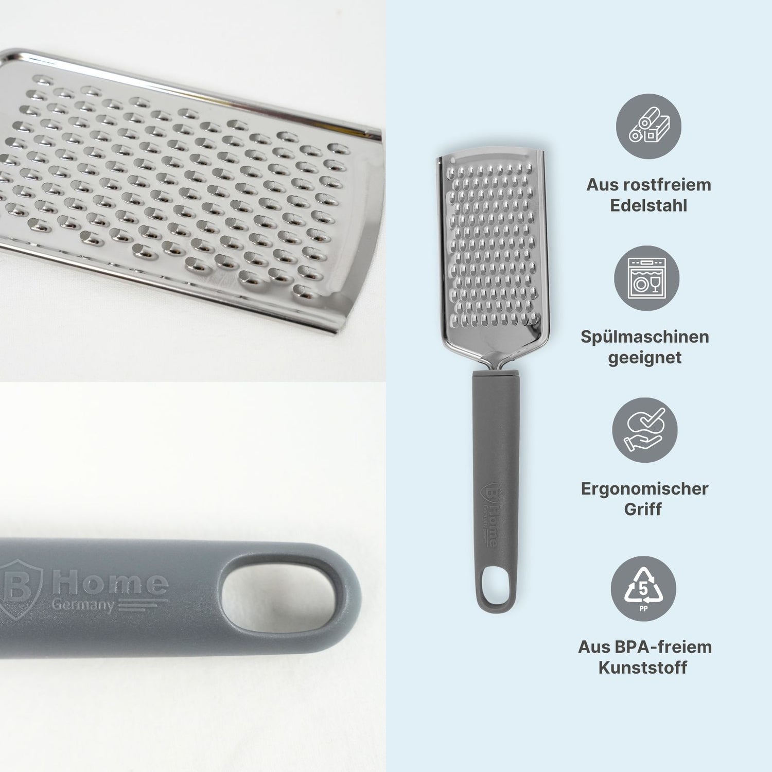 Der Duft von frisch geriebenem Käse steigt auf, während feine Raspel sanft auf die dampfende Pasta fallen und sich mit der Sauce verbinden. Diese Käsereibe aus hochwertigem Edelstahl ermöglicht dir das mühelose Reiben von Hart- und Schnittkäse – perfekt zum Verfeinern von Pastagerichten, Gratins oder Salaten. Mit ihren scharfen Reibeflächen gleitet sie leicht durch den Käse und sorgt für gleichmässige Raspel, die sich ideal zum Bestreuen oder Garnieren eignen. Mit den Massen von 24cm x 6cm x 2cm und dem ergonomischen Griff aus BPA-freiem Kunststoff liegt die Reibe angenehm in der Hand und ermöglicht dir ein komfortables und sicheres Arbeiten. Hergestellt aus rostfreiem Edelstahl, ist die Küchenreibe langlebig, robust und lebensmittelecht, was sie sicher für alle Arten von Käse macht. Die hochwertige Verarbeitung sorgt dafür, dass die Reibe ihre Schärfe behält und auch bei häufigem Gebrauch zuverlässig bleibt. Durch ihre vielseitigen Einsatzmöglichkeiten eignet sie sich nicht nur für Käse, sondern auch zum Reiben von Schokolade oder Gemüse. Mit der praktischen Aufhängung am Griff kannst du sie platzsparend aufbewahren und hast sie immer griffbereit in der Küche. Sie ist zudem spülmaschinengeeignet, sodass du sie leicht reinigen kannst. Diese Handreibe ist ein vielseitiger Küchenhelfer, der dir das Reiben und Garnieren erleichtert und für gleichmässige Raspel sorgt.