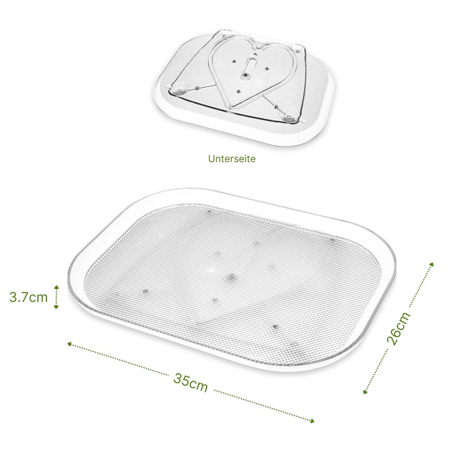 1x Kühlschrank-Drehteller. Du kennst das Problem: Du möchtest im Kühlschrank etwas herausholen, doch die hinteren Gegenstände sind schwer zu erreichen. Mit diesem Kühlschrank-Drehteller gehört das lästige Suchen und Verschieben der Vergangenheit an! Diese drehbare Platte sorgt für Ordnung, Organisation und schafft effizient Platz. Ob Lebensmittel, Dosen oder Getränke – einfach auf den Drehteller stellen und bei Bedarf problemlos darauf zugreifen. Der 360° drehbare und nach vorne oder hinten verschiebbare Organizer ermöglicht einen einfachen und schnellen Zugriff, ohne dass du andere Gegenstände verschieben oder aus dem Kühlschrank herausnehmen musst. Durch die werkzeugfreie Montage ist das Aufbewahrungs-Tablett in kürzester Zeit einsatzbereit: Einfach die Saugnäpfe befestigen, festdrücken, etwas warten und schon ist der Teller nutzbar. Die Saugnäpfe bieten zudem einen Anti-Rutsch-Halt, sodass der Drehteller stabil bleibt. Der transparente Teller ist aus robustem Acryl und PET gefertigt und sorgt für eine elegante Optik in deinem Kühlschrank. Die Herzform auf der Unterseite verleiht ihm zusätzlich eine besondere, ansprechende Note. Mit einem Gewicht von nur 413g und Massen von 35cm x 26cm x 3.7cm ist der Drehteller leicht und biete eine hohe Lagerkapazität. Trotz leichtem Gewicht bietet er eine Belastbarkeit von bis zu 7.8kg. So kannst du ihn besonders vielseitig einsetzen, nicht nur im Kühlschrank, sondern auch auf dem Esstisch, auf der Küchentheke, im Badezimmer für Pflegeprodukte, im Büro zur Aufbewahrung von Schreibtischutensilien, im Wohnzimmer als Servierteller für Snacks, auf dem Schminktisch für Kosmetikartikel, in der Werkstatt zur Organisation kleinerer Werkzeuge oder in der Vorratskammer. Der benötigte Platz für den Drehteller beträgt 35cm x 27cm. Schaffe Ordnung und Organisation in deinem Alltag mit dieser drehbaren Aufbewahrungsplatte – ideal für mehr Struktur im Leben!