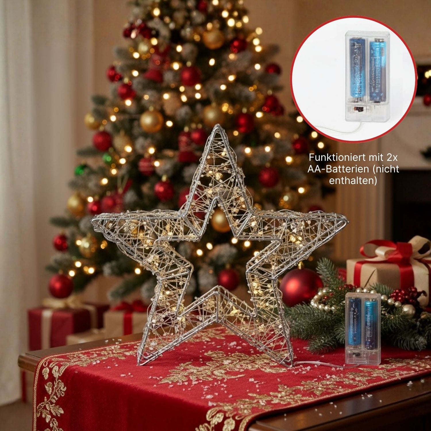 Wenn draussen die Tage kürzer werden und das Zuhause in warmes Licht getaucht ist, sorgt ein stimmungsvoller Akzent für echte Weihnachtsatmosphäre: der LED-Dekostern aus Metall. Mit seiner silbrigen Oberfläche und den 20 strahlenden LEDs schafft er sofort ein festliches Ambiente – egal ob auf dem Sideboard, am Fenster oder als Blickfang im Wohnzimmer. Der filigrane Drahtstern mit einer Grösse von 30cm x 5cm x 28cm und seiner offenen, dreidimensionalen Struktur verleiht deiner Dekoration eine festliche Eleganz. Das warmweisse Licht der LEDs schimmert durch das feine Metallgeflecht und erzeugt ein gemütliches Leuchten. Das Licht lässt sich über das Batteriefach bequem ein- und ausschalten (benötigt werden 2x AA-Batterien, nicht im Lieferumfang enthalten) und du kannst den Dekostern flexibel überall im Innenbereich aufstellen – ideal auch für Fensterbretter, Tische oder Regale. Das Verbindungskabel vom Batteriefach zum Stern ist transparent und bietet mit einer Länge von 28cm genug Spielraum, um das Fach unauffällig zu platzieren. Der LED-Stern als festliches Weihnachtsmotiv ist nicht nur Dekoration, sondern ein Symbol für Licht und Geborgenheit in der dunklen Jahreszeit. Er lässt sich sowohl einzeln als auch zusammen mit anderen Dekoelementen harmonisch arrangieren. Mach es dir mit diesem leuchtenden 3D-Stern gemütlich und geniesse das warme Schimmern, das dein Zuhause in festliche Stimmung taucht.