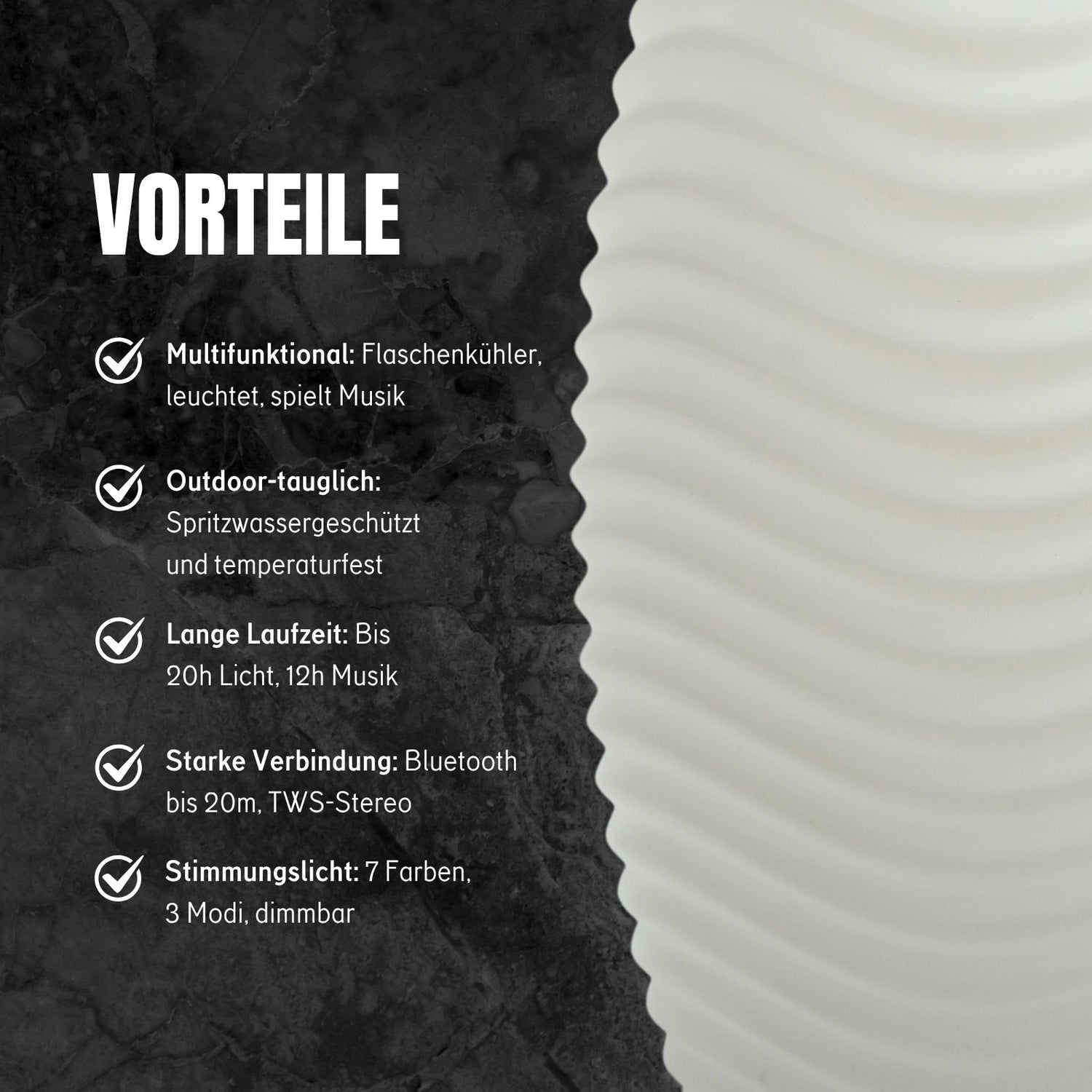 Schönes Licht, stimmungsvolle Musik und kühle Getränke: Dieser LED-Getränkekühler mit integriertem Bluetooth-Lautsprecher schafft im Handumdrehen eine besondere Atmosphäre – zu Hause, im Garten oder auf Events. Mit Eiswürfeln gefüllt, hält er deine Getränke zuverlässig kühl und stets griffbereit. Mit einer Grösse von 22cm x 22cm x 37cm (Höhe mit Henkel: 48.5cm) und einem Innenfach mit Massen von 12.5cm x 12.5cm x 15.5cm bietet der Kühler ausreichend Platz für Getränkeflaschen und -dosen und wird zugleich zum leuchtenden Mittelpunkt jeder Party. Gefertigt aus robustem PE-Kunststoff und geschützt nach IP65, eignet er sich für den Einsatz im Freien: er ist formstabil und temperaturbeständig von -70°C bis +40°C. So bleiben deine Getränke im Sommer kühl und das Licht sorgt das ganze Jahr über für stilvolle Akzente. Die Helligkeit lässt sich in 4 Stufen regeln; dazu stehen 7 RGB-Farben (Rot, Dunkelgrün, Dunkelblau, Hellgrün, Hellblau, Orange und Violett) sowie 3 Beleuchtungsmodi (schneller, gradueller und langsamer Farbübergang) zur Auswahl. Gesteuert wird alles bequem über die Fernbedienung mit einer Reichweite von bis zu 6m, mit der du auch den integrierten Lautsprecher leiser und lauter stellen und Lieder wechseln kannst. Der integrierte 4400mAh-Akku ermöglicht bis zu 20 Stunden Licht oder 12 Stunden kombinierte Licht- und Musikwiedergabe. Die Bluetooth-Verbindung bleibt auf bis zu 20m stabil. Dank TWS-Funktion (True Wireless Stereo) lassen sich zwei Getränkekühler auf bis zu 15m Entfernung synchronisieren und als kabelloses Stereo-Set nutzen. Geladen wird der Getränkekühler über das mitgelieferte USB-C-Ladekabel, die Ladezeit beträgt etwa 4–6 Stunden. Dank praktischem Henkel lässt sich der Kühleimer leicht transportieren. Ob beim Gartenfest, beim Camping oder auf dem Balkon – dieser Kühler vereint Licht, Sound und Funktionalität auf stilvolle Weise.