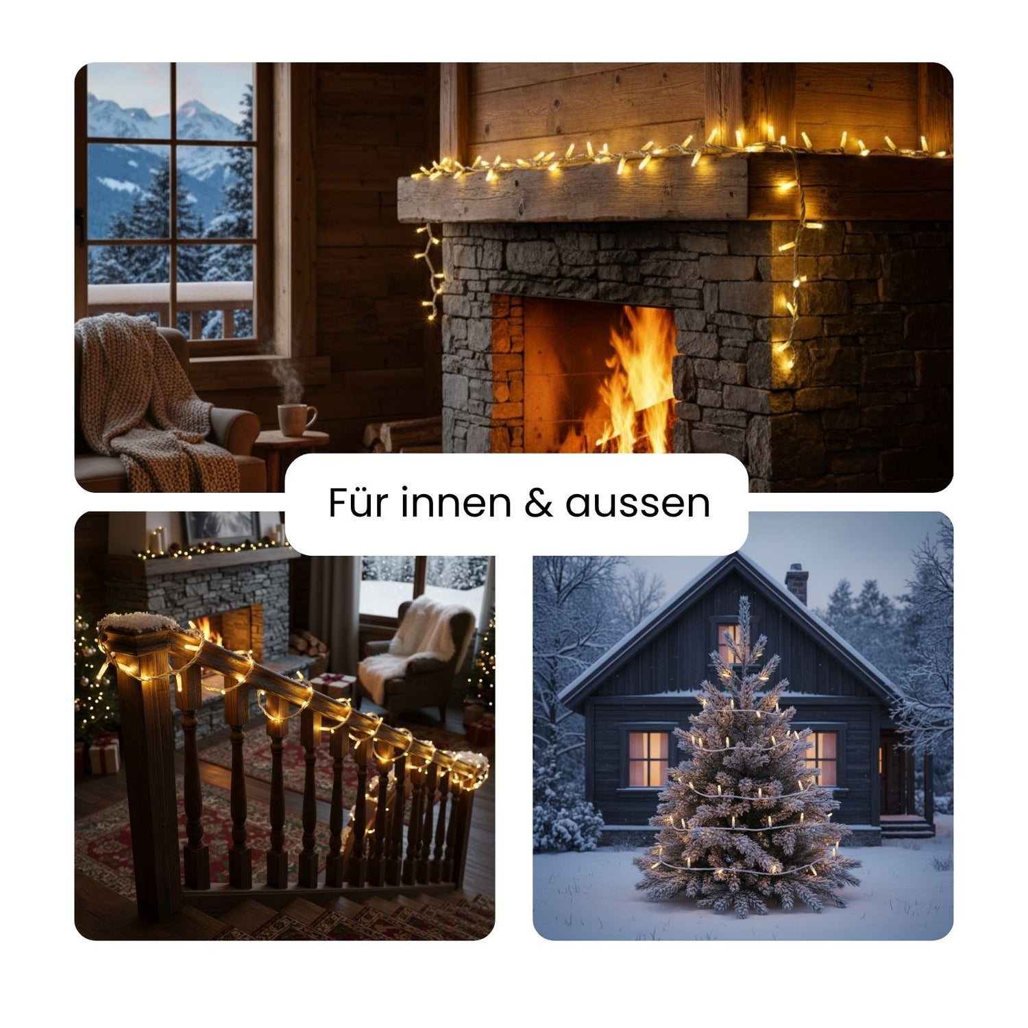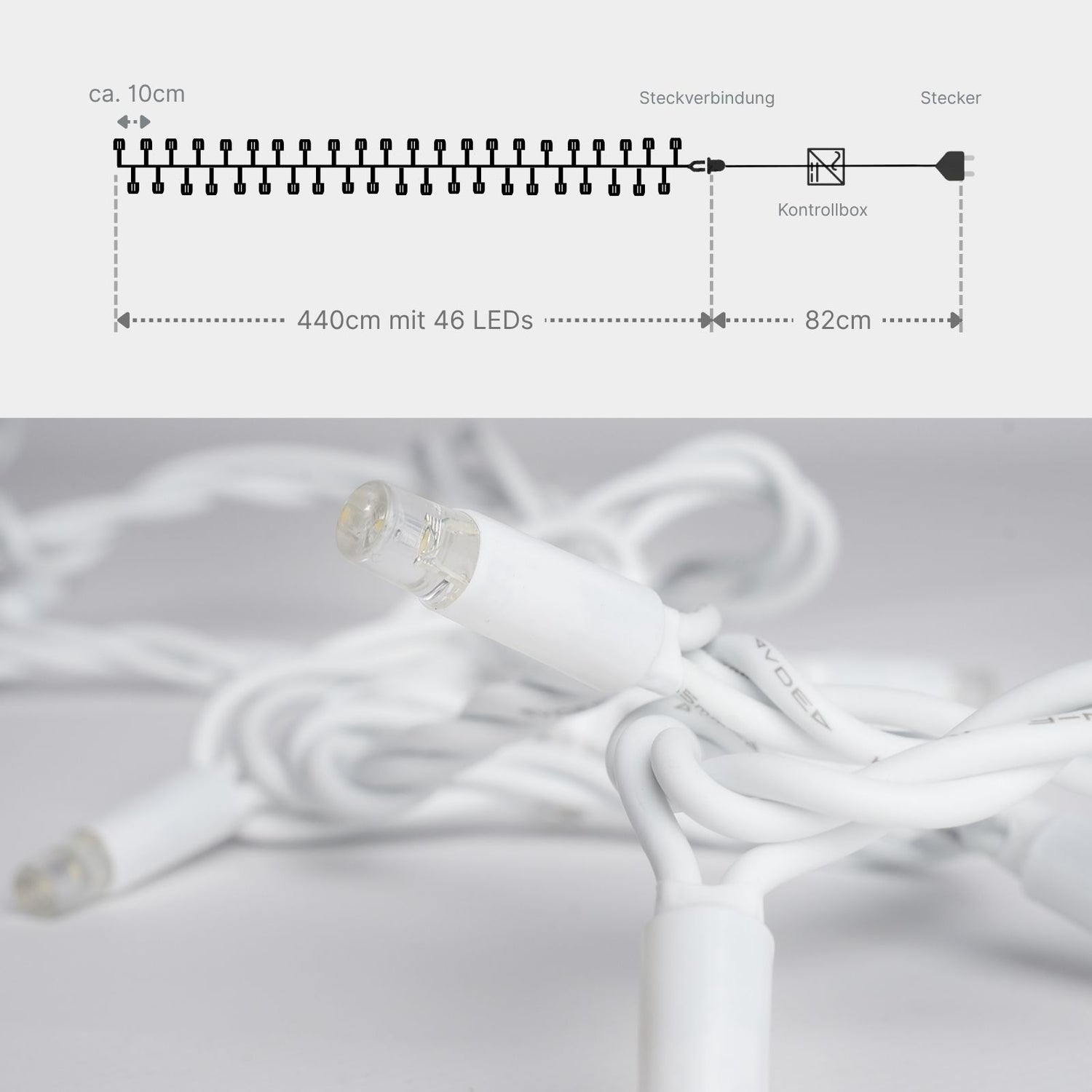 Wenn die Tage kürzer werden und draussen die Dunkelheit früher einsetzt, entsteht der Wunsch nach warmem, stimmungsvollem Licht, das Geborgenheit und Atmosphäre schafft. Genau dann entfaltet diese 4.4m lange LED Lichterkette in Weiss ihren vollen Charme – als vielseitige Gartenbeleuchtung, festliche Weihnachtsdeko, am Weihnachtsbaum oder stilvolle Partybeleuchtung. Mit ihren 46 warmweissen LEDs und einem gleichmässigen Abstand von etwa 10cm zwischen den Lichtern taucht sie jeden Raum oder Aussenbereich in sanftes, einladendes Licht, das Gemütlichkeit und Ruhe ausstrahlt. Der besondere Vorteil dieser Lichterkette aus PVC liegt in ihrer robusten IP65-Schutzart, die sie sowohl für den Innen- als auch den Aussenbereich geeignet macht. Ob im Garten, auf dem Balkon oder rund um den Weihnachtsbaum – sie ist wetterfest und sorgt selbst bei Regen oder Schnee für zuverlässige Beleuchtung. Über den Knopf an der Kontrollbox kannst du zwischen acht Leuchtmodi wählen: Kombinationsmodus, Sequenzielles Leuchten, Wechselleuchten, verblassendes Wechselleuchten, Laufblitz, sanftes Verblassen, Wellenleuchten und Dauerleuchten. So lässt sich die Stimmung individuell nach deinem Wunsch anpassen – ruhig und harmonisch oder lebendig und festlich. Das warmweisse Licht wirkt angenehm für die Augen und betont die natürliche Struktur von Pflanzen, Holz oder Dekorationselementen. Die Lichterkette passt zudem besonders gut zu modernen Weihnachtsbäumen mit Schneeeffekt, da sie dezent in den Hintergrund rückt und so das warme Licht stärker zur Geltung kommt. Der Netzstecker sorgt für eine einfache Handhabung, während die Zuleitung von ca. 82cm genügend Flexibilität bei der Platzierung bietet. Egal, ob für festliche Anlässe, gemütliche Abende im Garten oder als Akzentbeleuchtung im Wohnzimmer oder Schlafzimmer, diese Outdoor-Lichterkette schafft jederzeit eine warme, einladende Atmosphäre.