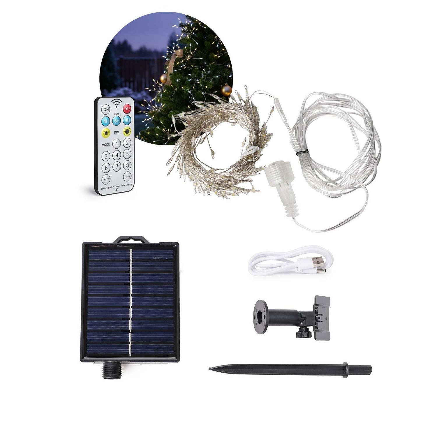 1x LED Lichterkette, 1x Solarpaneel, 1x Halterung, 1x Erdspiess, 1x USB-Ladekabel, 1x Fernbedienung