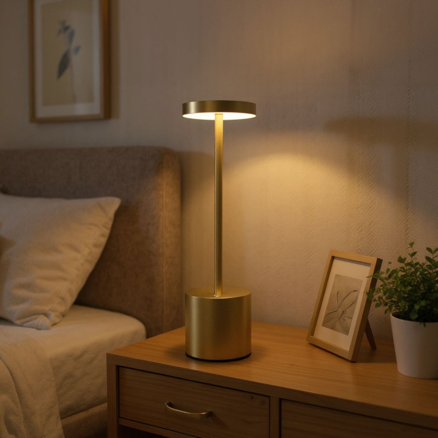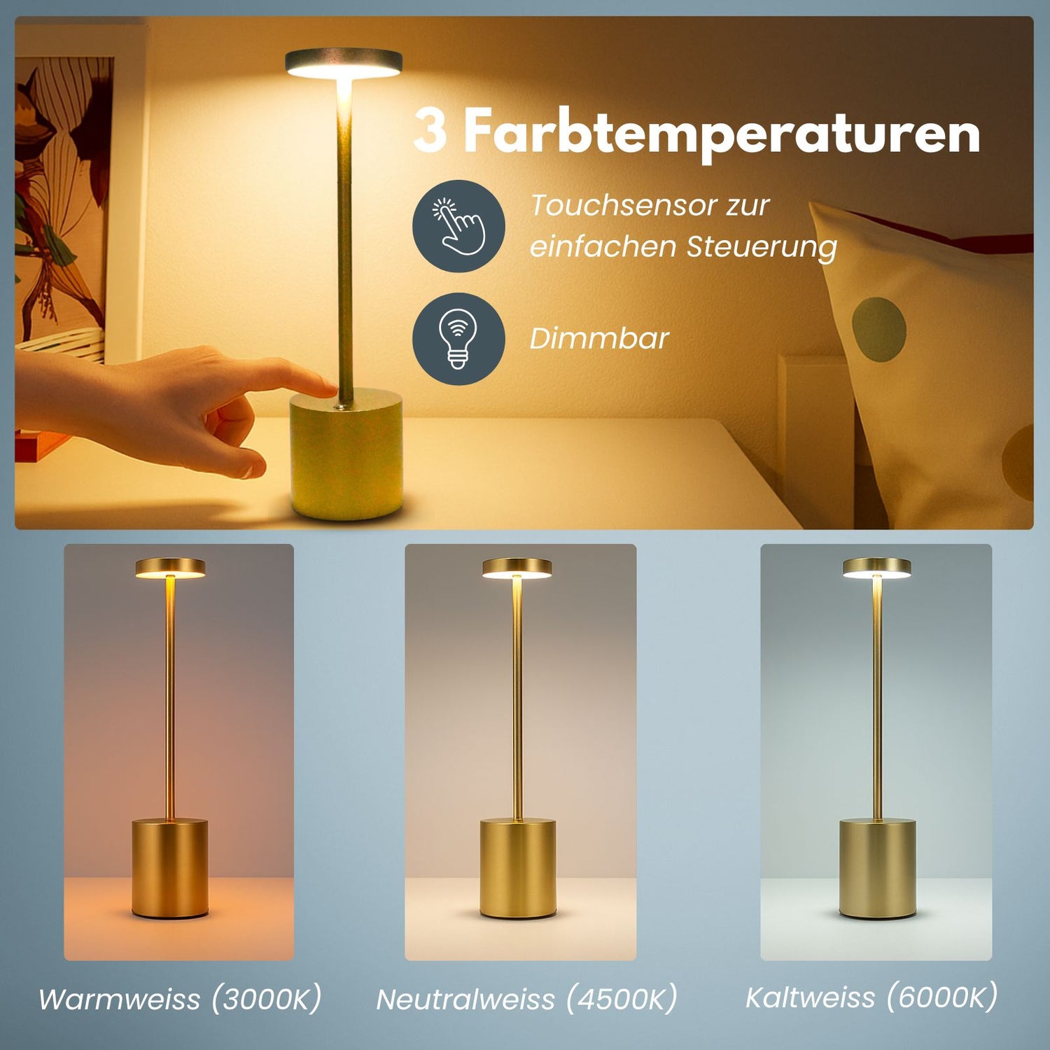 Wenn sich der Tag langsam dem Ende neigt und du endlich zur Ruhe kommen willst, spielt häufig das richtige Licht eine entscheidende Rolle. Grelles Deckenlicht stört beim Lesen oder Entspannen, zu wenig Licht dagegen lässt dich kaum sehen. Genau hier schafft diese kabellose LED-Tischlampe Abhilfe: Ob als stilvolle Nachttischlampe, praktische Schreibtischlampe oder sanftes Stimmungslicht, diese Leuchte begleitet dich durch deinen Alltag und schafft eine warme und gemütliche Atmosphäre. Der Touchsensor auf dem Lampensockel macht die Bedienung besonders angenehm: Eine kurze Berührung genügt, um die Leuchte ein- oder auszuschalten oder zwischen den drei Farbtemperaturen zu wechseln – von Warmweiss (3000K) über Neutralweiss (4500K) bis hin zu Kaltweiss (6000K). Hältst du den Touchsensor gedrückt, lässt sich die Helligkeit stufenlos regulieren – von gedimmt bis strahlend hell. So passt sich das Licht deinem Moment an: zum Arbeiten, Lesen oder Entspannen. Der integrierte 800mAh-Akku wird bequem per mitgeliefertem USB-Kabel (USB-A auf USB-C) in rund 4 Stunden aufgeladen und sorgt dafür, dass du unabhängig von Steckdosen bleibst. Je nach Helligkeit leuchtet die Tischlampe zwischen 4 und 8 Stunden. Die goldige Farbgebung in Kombination mit dem schlanken Design (8cm x 8cm x 34.5cm, 320g) verleiht der Lampe eine elegante Optik, die sich harmonisch in verschiedene Räume einfügt: von Büro über Arbeitszimmer bis hin zum Schlafzimmer. Dank des Akkubetriebs kannst du die Lampe problemlos überallhin mitnehmen. Das robuste Gehäuse aus Eisen und Aluminium gibt dem schlanken Korpus Stabilität. Dank des Schutzpads an Unterseite steht die Lampe sicher, lässt sich einfach verschieben und ist dabei schonend zu empfindlichen Oberflächen wie Holz oder Glas. Kompakt, kabellos und flexibel – diese Tischlampe passt sich deinem Alltag an.