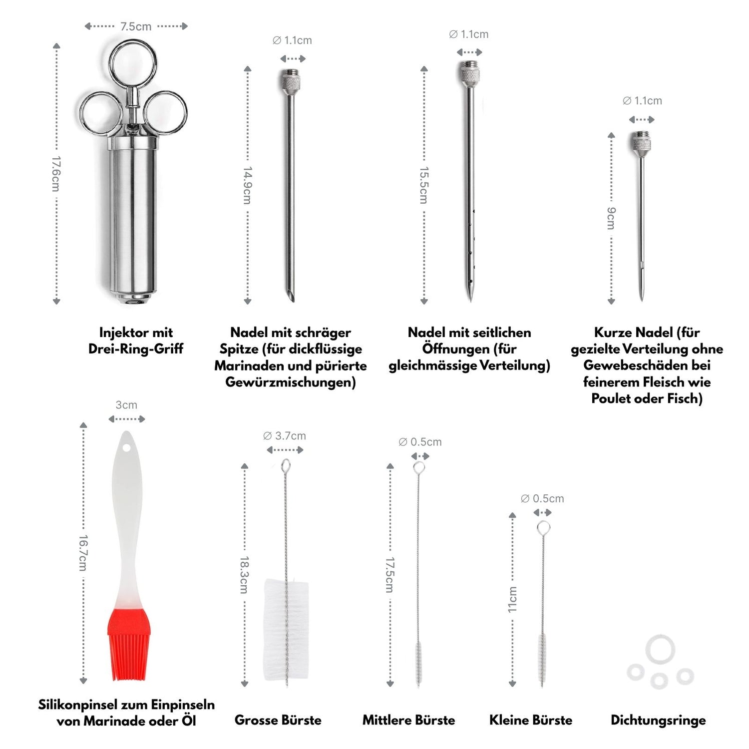 1x Marinadenspritze, 3x Nadeln, 1x Marinadenpinsel, 3x Reinigungsbürsten, 4 Dichtungsringe