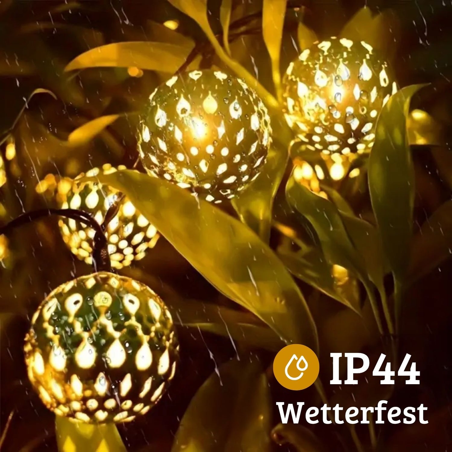 Wenn die Nacht hereinbricht und sich der Alltag in Stille hüllt, beginnt mit dieser marokkanischen LED Lichterkette die bezaubernde Magie von 1001 Nacht. Die Beleuchtung lässt goldene Metallkugeln im orientalischen Design erstrahlen, taucht dein Zuhause in geheimnisvolles Licht und zaubert ein buntes Spiel aus Glanz und Schatten, das an funkelnde Sterne erinnert und eine Atmosphäre voller Romantik und Geborgenheit schafft. Mit ihrem besonderen Stil hebt sie sich von herkömmlichen Lichterketten ab und bringt ein Stück Märchenwelt direkt zu dir. Die 4.8m lange Lichterkette (Gewicht: ca. 170g) besteht aus Kunststoff, flexiblem Kupferdraht und dekorativem Metall. Auf jeder der 20 warmweissen LED Lämpchen (3000K, 0.06W, 4.5V) sitzt eine Kugel mit Massen von 2.5cm x 2.5cm x 2.5cm, die im 15cm Abstand hängen und ein faszinierendes Spiel von Licht und Schatten erzeugen. Mit ihrer schwarzen Kabelfarbe und den goldigen Kugeln fügt sich die orientalische Deko harmonisch ein – egal ob im Garten, auf dem Balkon, als Party-Accessoire oder als festliche Weihnachtsbeleuchtung. Betrieben wird die Lichterkette über ein Solarpaneel. Auf der Rückseite des Paneels befinden sich zwei Knöpfe, mit denen du die Lichterkette ein- und ausschalten sowie zwischen 8 Leuchtmodi wählen kannst: von Kombinationsmodus, über Wellenlicht, zu Funkellicht bis hin zu Dauerlicht. So hast du jederzeit die passende Stimmung parat. Das Solarpaneel wird mit einer Halterung und einem Erdspiess geliefert. Nach etwa 6 Stunden Aufladen im Sonnenlicht leuchtet die Lichtgirlande 6 bis 7 Stunden lang. Möchtest du sie auch tagsüber nutzen, kannst du das Paneel einfach abdecken. Dank Schutzklasse IP44 und 2.1m Zuleitung eignet sich die Lichterkette im Aussenbereich, um Äste, Büsche, Dächer oder Zäune stimmungsvoll zu beleuchten.