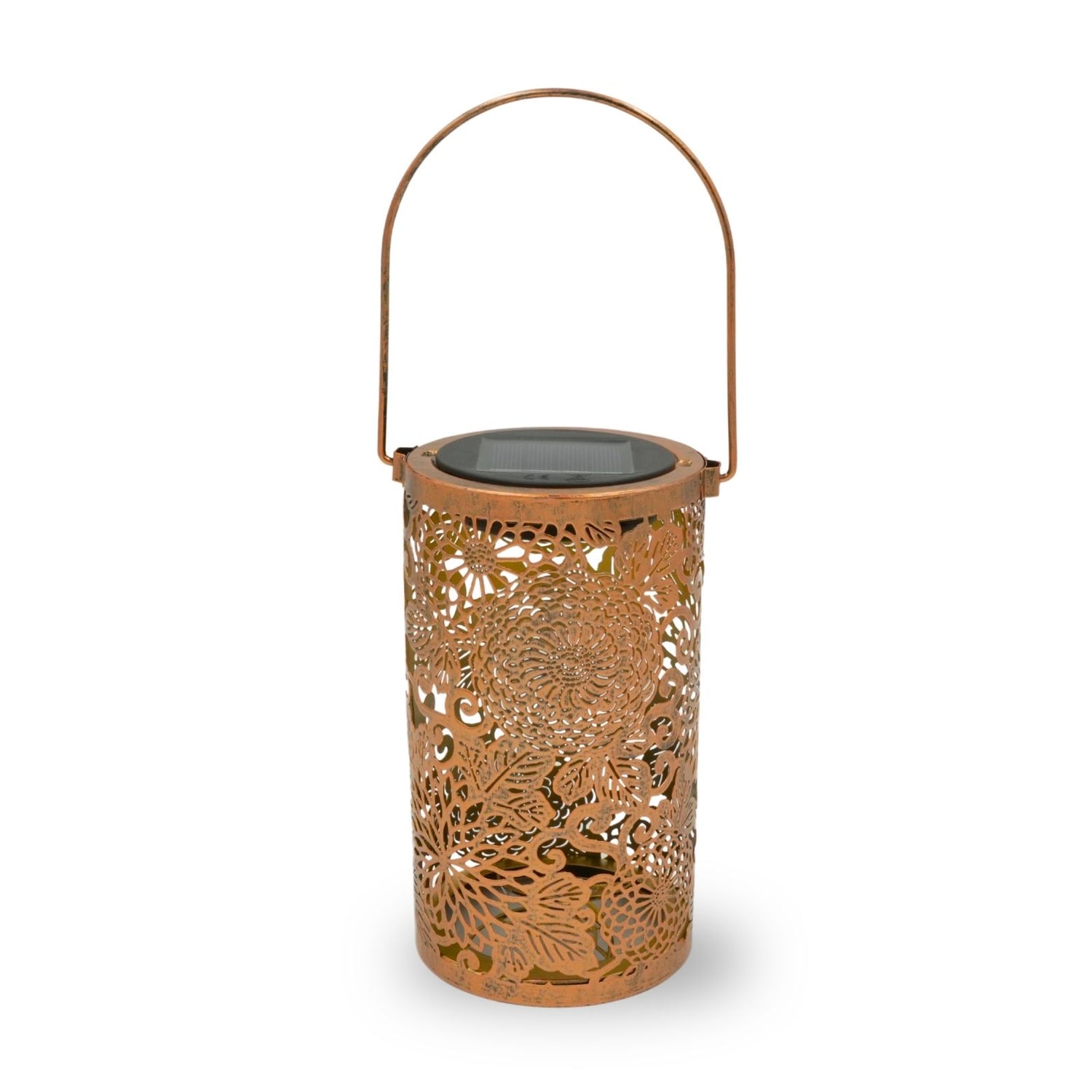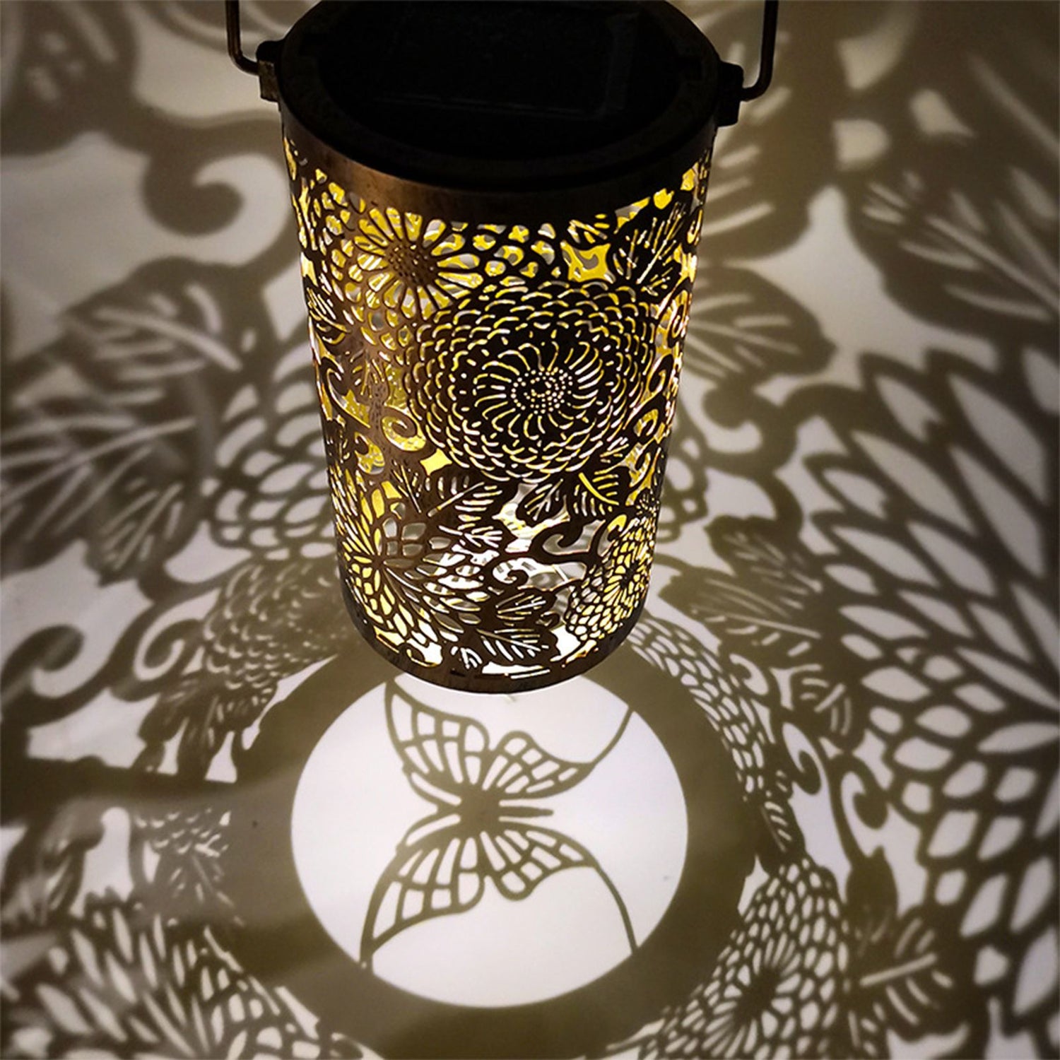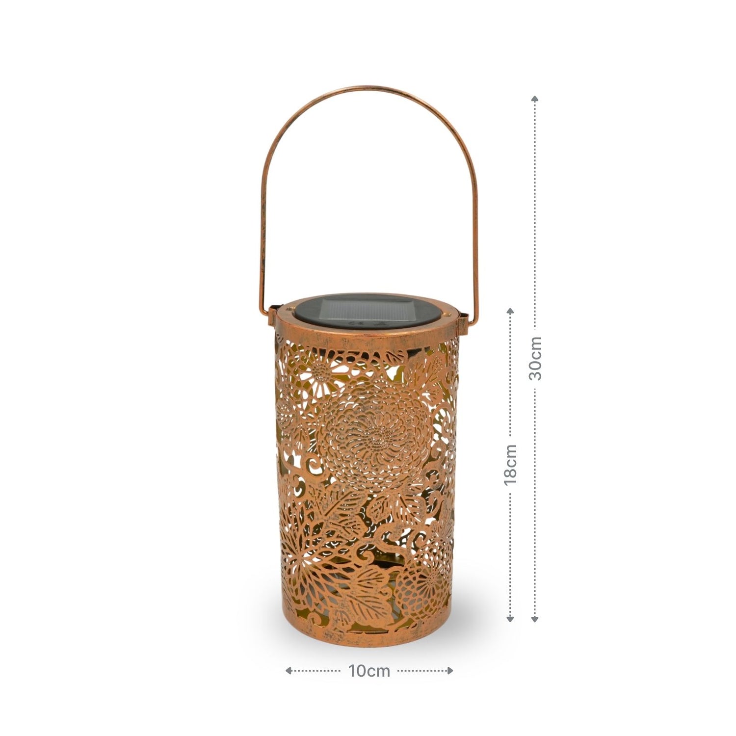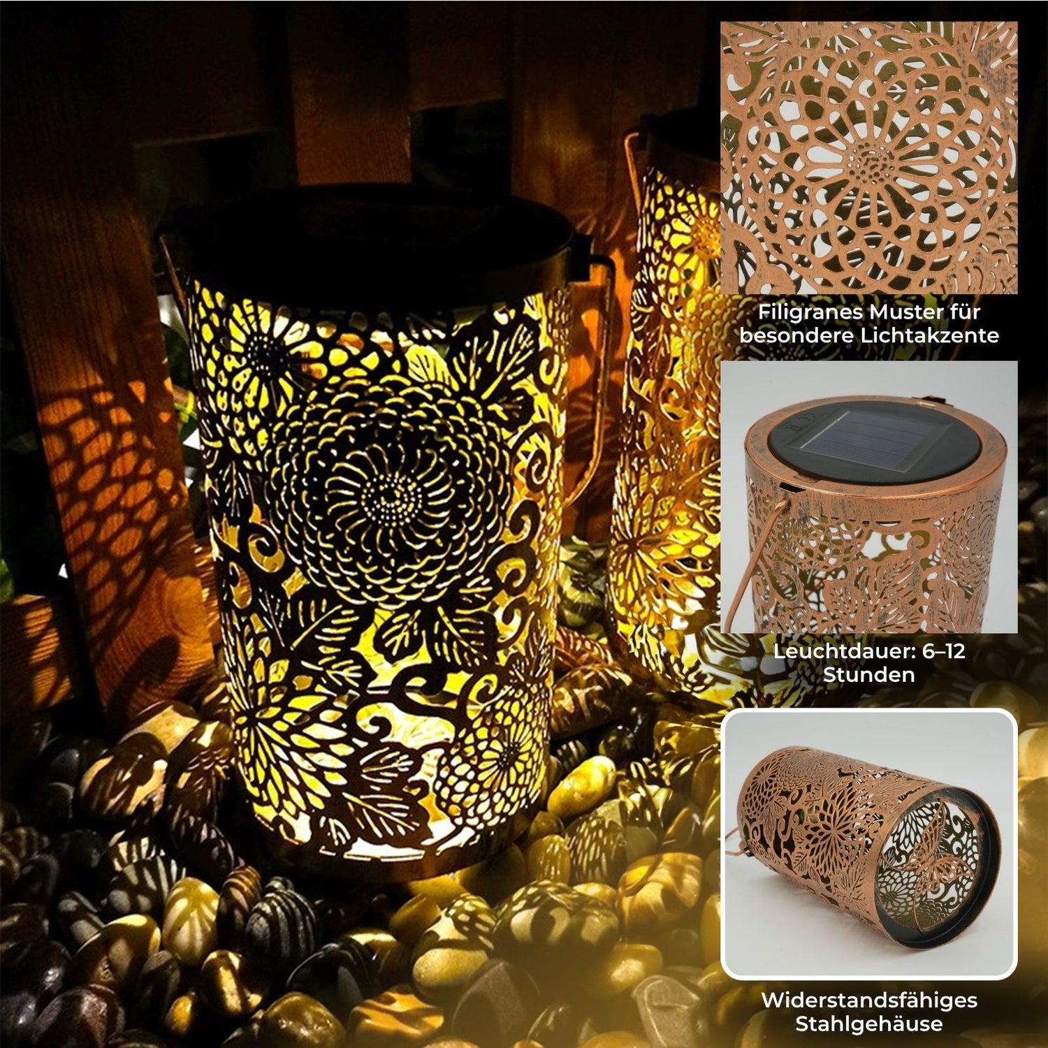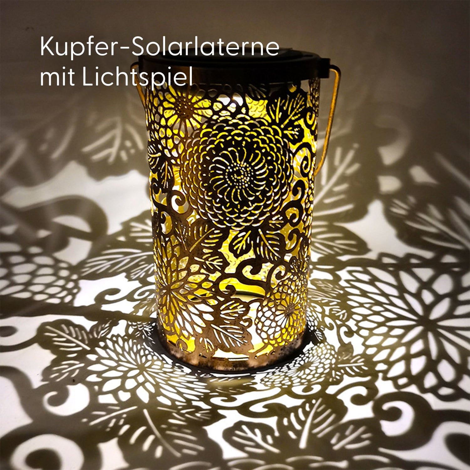 Du lehnst dich im Gartenstuhl zurück, das Tageslicht schwindet – und die feinen Lichtspiele der Solarleuchte breiten sich sanft auf dem Boden aus. Genau für solche Momente ist diese kupferfarbene Outdoor-Solarlaterne gemacht. Sie kombiniert dekoratives Design mit funktionaler LED-Technik. Das integrierte Solarpanel lädt sich tagsüber auf und versorgt den fest verbauten Ni-MH-Akku (1.2V, 600mAh) zuverlässig mit Energie. Sobald es dunkel ist, fängt die Solarlampe automatisch an zu leuchten und sorgt für ein warmes, atmosphärisches Licht. (Der Ein-/Ausschalter auf der Unterseite des Solarpaneels muss dafür auf "ON" stehen). Das durchbrochene Blumenmuster im Metallgehäuse projiziert lebendige Lichtreflexe auf den Untergrund – ergänzt durch einen Schmetterling auf der Unterseite der Leuchte, der bei eingeschaltetem Licht deutlich zu erkennen ist. Mit einer kompakten Grösse von 10cm x 10cm x 18cm und einem stabilen Bügelgriff lässt sich die Laterne flexibel platzieren oder aufhängen; bei aufgestelltem Griff beträgt die Gesamthöhe ca. 30cm. Die Leuchtdauer liegt – abhängig von der Sonneneinstrahlung – zwischen 6 und 12 Stunden. Die Gartenlaterne ist mit Schutzklasse IP55 spritzwassergeschützt und für den ganzjährigen Einsatz im Aussenbereich geeignet. Das robuste Metall sorgt für Stabilität und verleiht der Leuchte zugleich eine elegante Optik. Ob auf dem Balkon, im Garten oder am Hauseingang – diese Solarleuchte setzt dezente Lichtakzente und bringt warme Atmosphäre in deinen Aussenbereich.