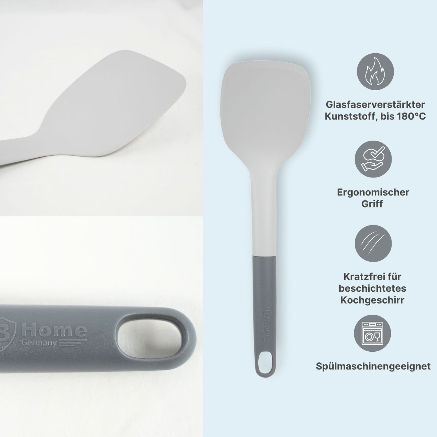 Das Brutzeln in der Pfanne erfüllt die Küche mit köstlichem Duft, während du das Steak oder das Gemüse mit einer mühelosen Bewegung wendest. Dieser Pfannenwender aus hochwertigem Kunststoff in Grau erleichtert dir das Wenden und Anheben von Speisen in Pfannen und Töpfen. Dank der Glasfaserverstärkung ist er besonders robust und langlebig, ohne dabei an Leichtigkeit zu verlieren. Mit Massen von 32cm x 9.5cm x 2cm hat er die ideale Grösse, um selbst grössere Portionen mühelos zu wenden und zu servieren. Der ergonomische Griff liegt angenehm in der Hand und ermöglicht dir ein komfortables Arbeiten, auch bei hohen Temperaturen. Egal ob Fisch, Fleisch, Gemüse oder Bratkartoffeln – der Pfannenwender hält hohen Temperaturen stand und ist einsetzbar bis 180°C. Der durchgehende Kopf ohne Schlitze gibt stabilen Halt und ermöglicht einfaches Anheben und Wenden, ohne dass etwas durchfällt. Hergestellt aus BPA-freiem Kunststoff, ist die Wendeschaufel lebensmittelecht und sicher für alle Arten von Speisen. Die glatte Kunststoffoberfläche schützt dein Kochgeschirr vor Kratzern und ist besonders schonend zu beschichteten Pfannen und Töpfen. Dank der vielseitigen Einsatzmöglichkeiten eignet sich der Pfannenwender sowohl zum Braten, Wenden als auch zum Servieren von Speisen. Er ist zudem spülmaschinengeeignet, sodass du ihn leicht reinigen kannst. Mit der praktischen Aufhängung am Griff kannst du den Bratenwender platzsparend aufbewahren und hast ihn immer griffbereit in der Küche. Ob beim Braten, Wenden oder Servieren – dieser Pfannenwender ist ein vielseitiger Küchenhelfer, der dir das Kochen erleichtert und für ein sauberes und präzises Arbeiten sorgt.