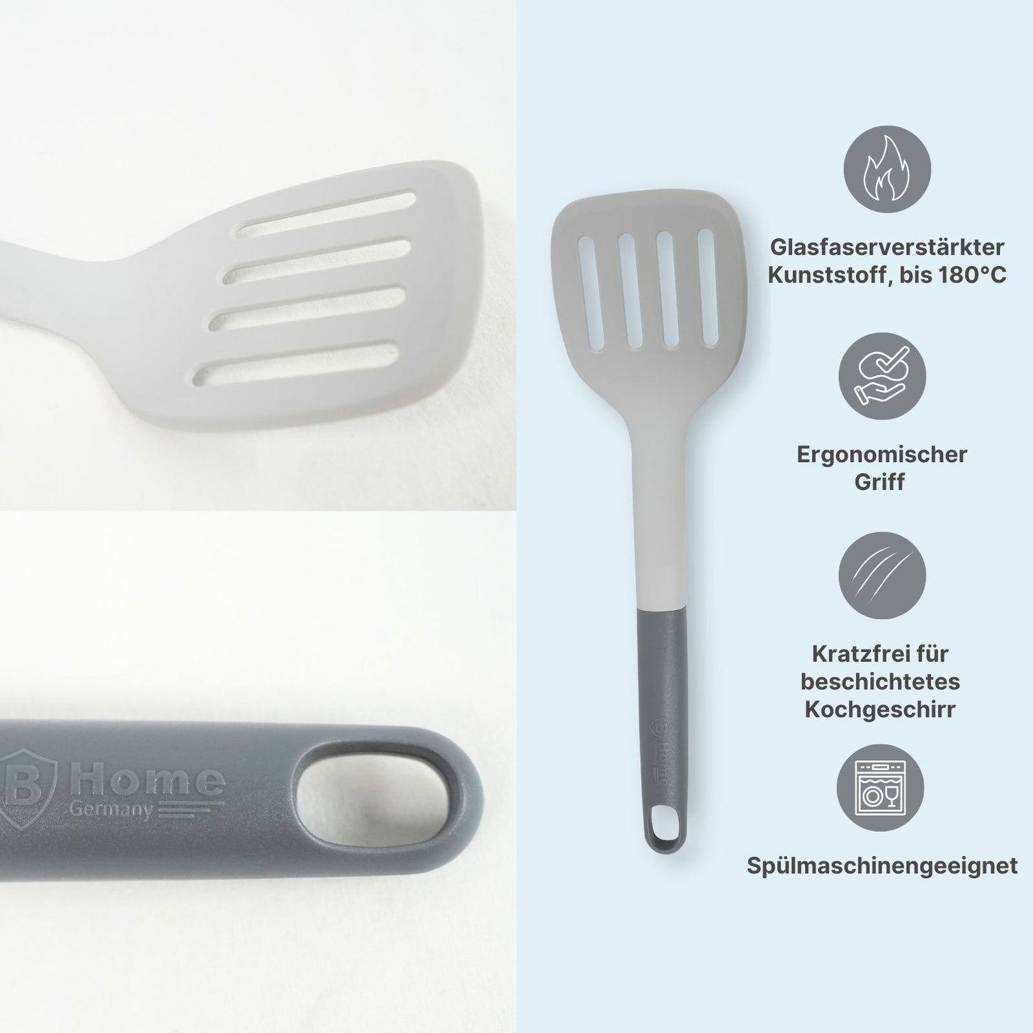Der verführerische Duft von knusprigen Bratkartoffeln oder goldbraunen Pfannkuchen erfüllt die Küche, während du vorsichtig den Schlitzwender ansetzt, um sie mühelos zu wenden. Dieser Küchenhelfer aus hochwertigem Kunststoff in Grau erleichtert dir das Wenden und Anheben von Speisen in Pfannen und Töpfen. Dank der Glasfaserverstärkung ist er besonders robust und langlebig, ohne dabei an Leichtigkeit zu verlieren. Mit Massen von 32cm x 9.5cm x 2cm hat er die ideale Grösse, um selbst grössere Portionen mühelos zu wenden und zu servieren. Der ergonomische Griff liegt angenehm in der Hand und ermöglicht dir ein komfortables Arbeiten, auch bei hohen Temperaturen. Hergestellt aus BPA-freiem Kunststoff, ist die Wendeschaufel lebensmittelecht und sicher für alle Arten von Speisen. Egal ob Fisch, Fleisch, Pfannkuchen oder Gemüse – der Schlitzwender hält hohen Temperaturen stand und ist einsetzbar bis 180°C. Die praktischen Schlitze im Kopf lassen überschüssiges Fett und Flüssigkeiten abtropfen, was für ein sauberes Kochen sorgt. Die Kunststoffoberfläche schützt dein Kochgeschirr vor Kratzern und ist besonders schonend zu beschichteten Pfannen und Töpfen. Dank der vielseitigen Einsatzmöglichkeiten eignet sich der Pfannenwender mit Schlitzen sowohl zum Braten, Wenden als auch zum Servieren von Speisen. Er ist zudem spülmaschinengeeignet, sodass du ihn leicht reinigen kannst. Mit der praktischen Aufhängung am Griff kannst du den Bratenwender platzsparend aufbewahren und hast ihn immer griffbereit in der Küche. Ob beim Braten, Wenden oder Servieren – dieser Schlitzwender ist ein vielseitiger Küchenhelfer, der dir das Kochen erleichtert und für ein sauberes und präzises Arbeiten sorgt.