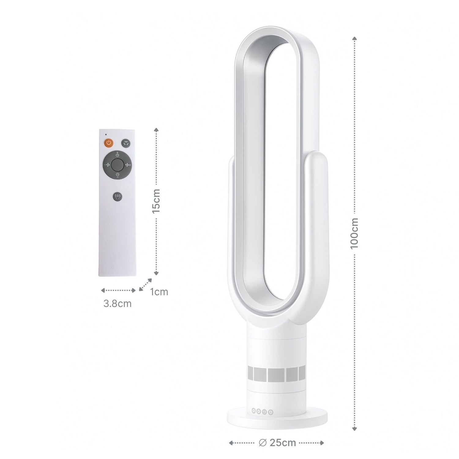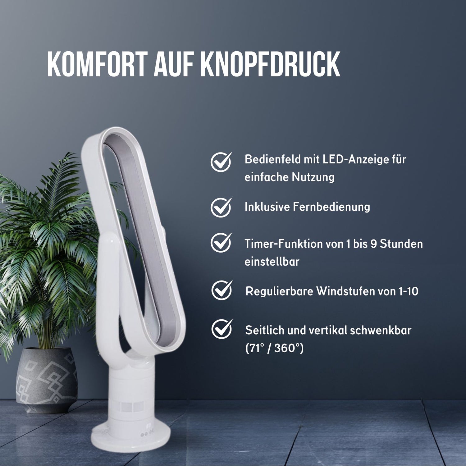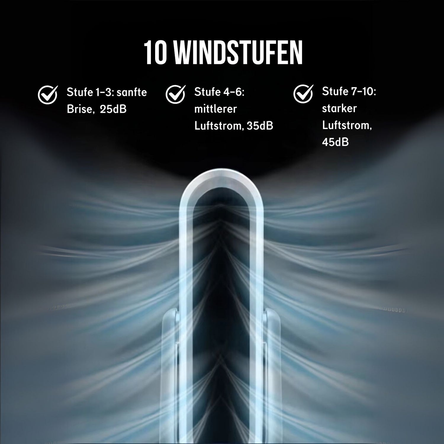 An einem schwülen Sommertag klebt dir die Kleidung am Körper, und alles, was du dir wünschst, ist ein frischer und kühler Luftzug. Genau in solchen Momenten bringt dir dieser rotierende Turmventilator die ersehnte Erfrischung! Dieser Säulenventilator sorgt mit seinem durchdachten Design und moderner Technik für ein angenehmes Raumklima – ideal für heisse Sommertage. Mit 10 Windstufen bietet dir der Standventilator genau die Abkühlung, die du brauchst: Stufe 1–3 für eine sanfte Brise, Stufe 4–6 für etwas kräftigeren Wind und Stufe 7–10 für einen spürbar starken Luftstrom. Dank steuerbarer 71° Rotationsfunktion nach links und rechts per Fernbedienung und Bedienfeld sowie manuell einstellbarer 360° Drehung des Innenrings nach oben und unten verteilt sich die Luft frei im Raum. So entsteht eine spürbar dynamisch-effiziente Luftzufuhr, die für gleichmässige Erfrischung sorgt. Der energieeffiziente Vollaluminiummotor arbeitet dabei zuverlässig mit 35W Leistung. Mit einer Lautstärke von nur 25–45dB läuft der Ventilator angenehm leise und eignet sich auch fürs Schlafzimmer oder fürs Büro. Ein praktischer Timer ist in 1-Stunden-Schritten von 1–9 Stunden einstellbar und ermöglicht es dir, das Gerät automatisch an deinen Tagesablauf anzupassen. Die Funktionen steuerst du bequem über das Bedienfeld am Ventilatorsockel oder über die mitgelieferte Fernbedienung. Das silbrig-weisse Kunststoff-Gehäuse ist nicht nur modern, sondern auch funktional: Das abgerundete Design ohne Lüfterflügel reduziert das Verletzungsrisiko und macht den Ventilator auch für Haushalte mit Kindern, älteren Menschen oder Haustieren sicher. Mit einem Gewicht von 2.7kg, Massen von 25cm x 25cm x 100cm und einer Kabellänge von 1.5m lässt sich der Ventilator flexibel einsetzen. Mit diesem rotierenden Turmventilator bekommst du eine frische Brise genau dann, wann du sie brauchst.