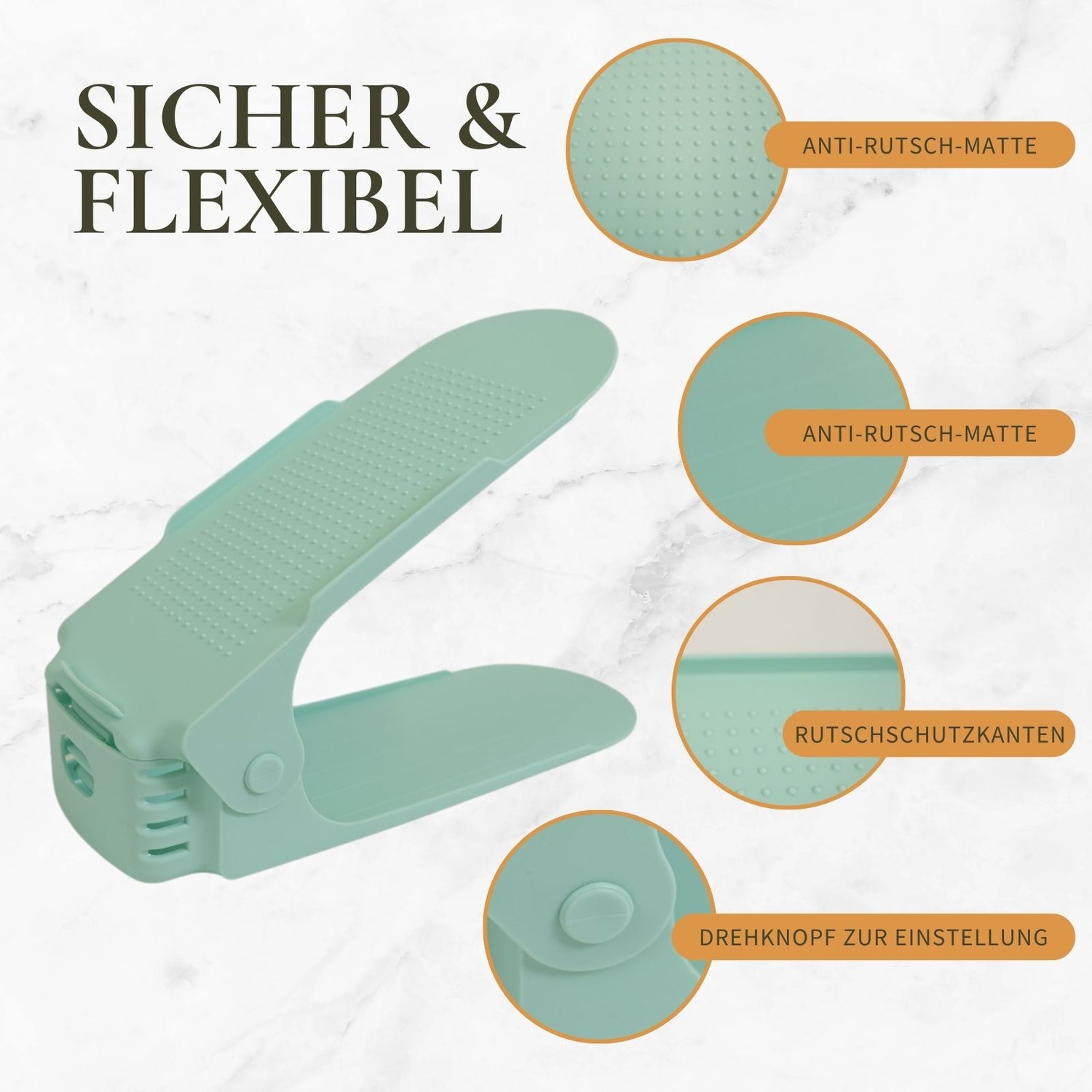 Dein Schuhschrank platzt aus allen Nähten und du wünschst dir endlich mehr Platz und Ordnung? Mit diesem Schuhstapler gehört das Chaos der Vergangenheit an! Dieses praktische Hilfsmittel hilft dir, dein Schuhregal effizient zu organisieren und gleichzeitig Platz zu sparen. Ideal für jeden, der Wert auf ein ordentliches Zuhause legt. Der Schuhhalter ermöglicht es, ein Paar Schuhe auf zwei Etagen zu lagern, wodurch nur die Hälfte an Platz benötigt wird. Perfekt für geordnete und übersichtliche Regale, in denen du deine Lieblingsschuhe sofort findest. Das offene Design der Schuhhalterung sorgt dafür, dass deine Schuhe atmen können, was Gerüche minimiert und die Schuhe länger frisch hält. Dank der dreifach verstellbaren Höhe ist der Schuhhalter für verschiedenste Schuharten geeignet – ob Freizeitschuhe, High-Top Sneaker, Hausschuhe, Absatz-Schuhe oder viele weitere, auf diesem Schuh-Organizer finden deine Schuhe Platz! Die Höhe lässt sich flexibel auf 12cm, 15.5cm und 18cm anpassen. Dafür einfach am hinteren Loch die Stufenverstellung eindrücken, sodass diese aus dem Loch springt. Danach die Halterung auf die gewünschte Höhe stellen und die Stufenverstellung wieder einrasten lassen. Die auf der unteren Ebene befindlichen Anti-Rutsch-Rillen und die auf der oberen Ebene gepunktete Anti-Rutsch-Fläche sowie die clevere Erhöhung sorgen dafür, dass deine Schuhe sicher an ihrem Platz bleiben und nicht herunterfallen oder herausrutschen. Mit kompakten Massen von 25cm x 9cm x 7cm und einem leichten Gewicht von 107g passt er in jeden Schuhschrank und ist die ideale Lösung für kleine Räume oder grosse Schuhsammlungen. Schaffe Platz, verbessere die Übersicht und schone deine Schuhe gleichzeitig. Perfekt für alle, die ihre Schuhaufbewahrung revolutionieren möchten! Hol dir die platzsparende Lösung in Form dieses Schuhstaplers und geniesse ein ordentliches Zuhause! Hinweis: Schuhe und Regal sind nicht im Lieferumfang enthalten.