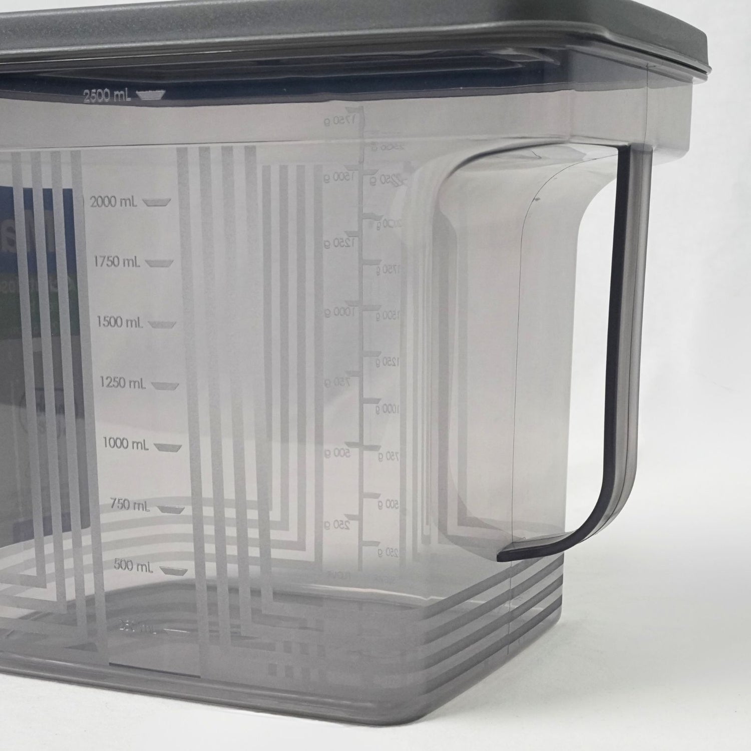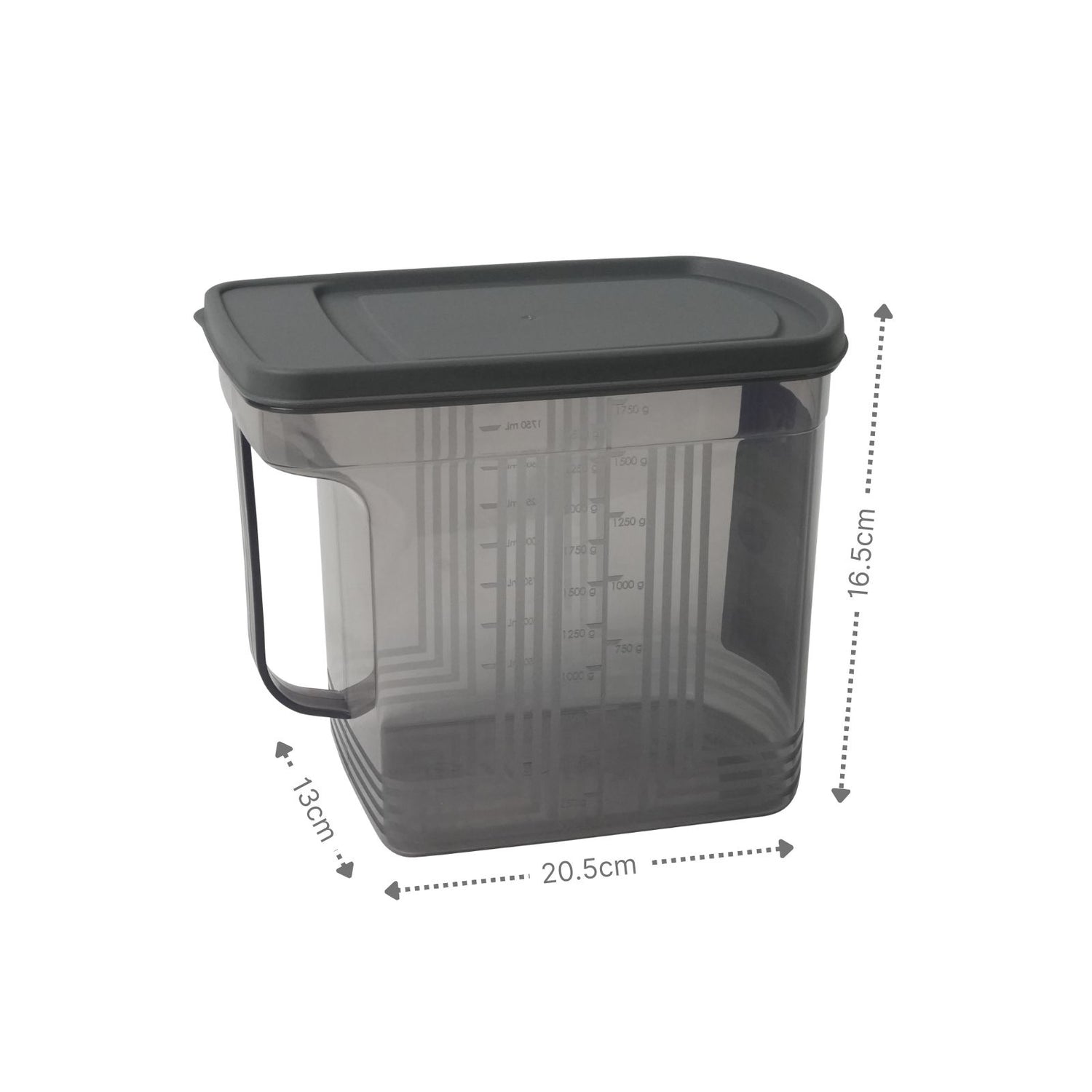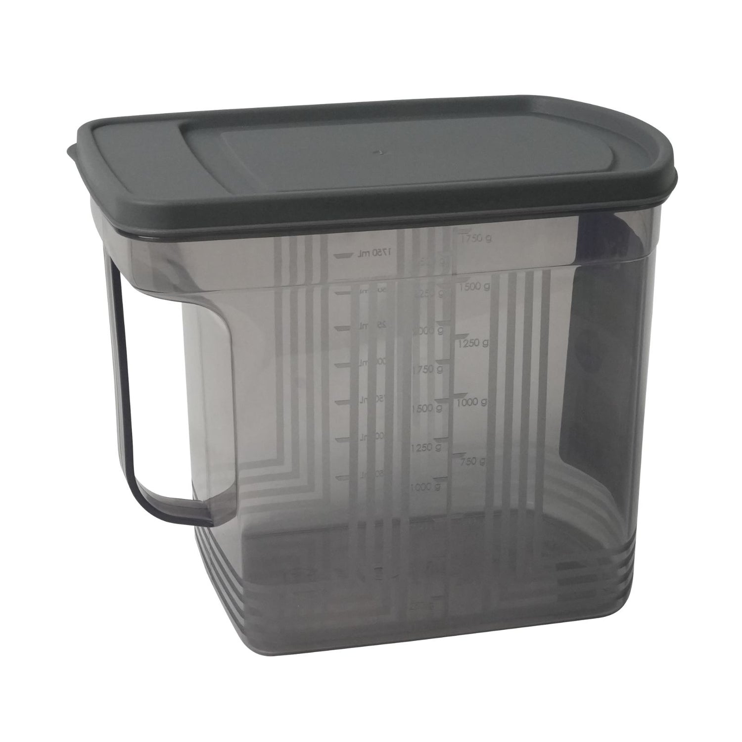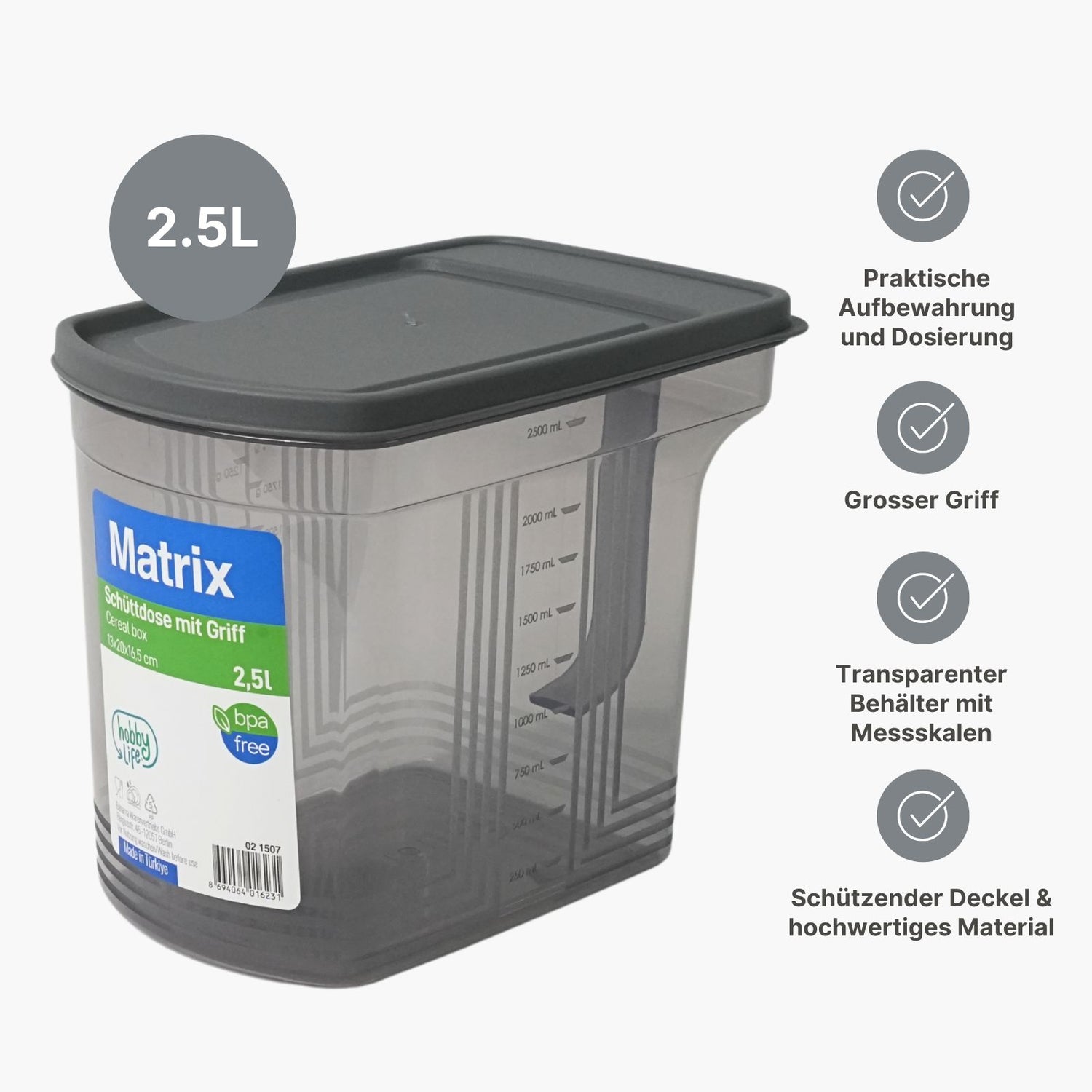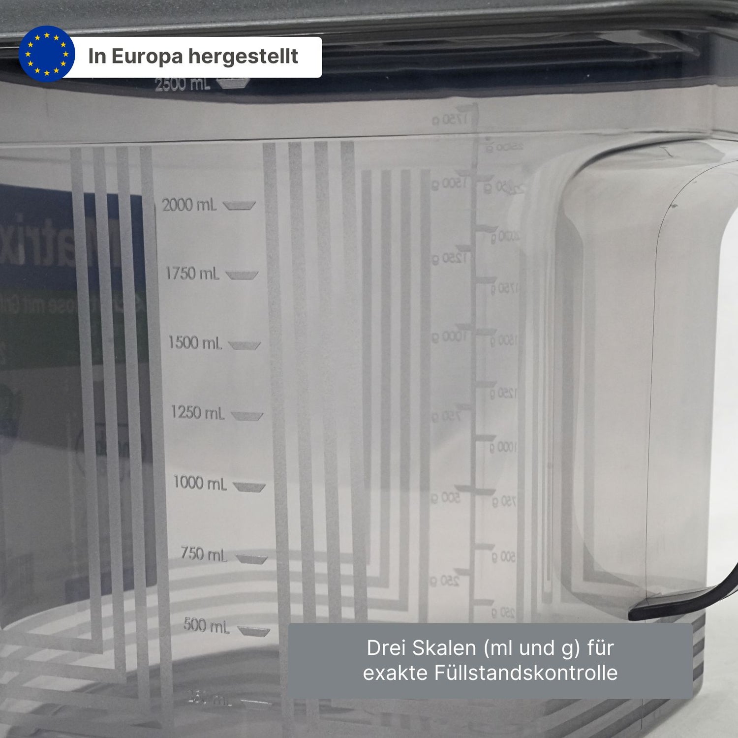 Ein schneller Griff in den Vorratsschrank. Du ziehst an dem Zuckerbeutel oder der Mehltüte, bleibst aber an etwas hängen und reist die Vorratstüten auf. Zucker und Mehl verteilen sich überall auf deiner Arbeitsfläche. Mit dieser Schüttdose mit Griff gehört so ein Chaos der Vergangenheit an. Sie bietet eine praktische Lösung zur Aufbewahrung und Dosierung von Trockenware wie Mehl, Zucker, Reis oder Müsli. Mit einer Grösse von 13cm x 20.5cm x 16.5cm und einem Fassungsvermögen von 2.5L eignet sie sich sowohl für den Vorratsschrank als auch für die direkte Nutzung in der Küche. Feine Zutaten wie Mehl oder Zucker lassen sich ideal in der Dose aufbewahren, während sich gröbere Lebensmittel wie Reis, Linsen oder Müsli auch direkt aus der Dose dosieren lassen. Dank des grossen Griffs liegt der Küchenbehälter gut in der Hand und ermöglicht ein sicheres Ausgiessen. Zudem lässt er sich durch den Griff leicht und sicher aus dem Schrank entnehmen, ohne umständlich danach greifen zu müssen. Die grau-transparente Ausführung sorgt dafür, dass der Inhalt jederzeit sichtbar ist, während drei Massskalen eine präzise Einschätzung der Füllmenge ermöglichen – eine in Millilitern sowie zwei in Gramm für unterschiedliche Lebensmittel. Der passgenaue, graue Verschluss-Deckel schützt die Zutaten vor Feuchtigkeit und hält sie lange frisch. Gefertigt aus robustem Polypropylen, ist die Schüttdose BPA-frei, lebensmittelecht und spülmaschinengeeignet, was die Reinigung besonders einfach macht. Hergestellt in Europa, überzeugt dieser Vorratsbehälter durch langlebige Qualität und eine durchdachte Funktionalität – eine praktische Ergänzung für jede Küche.