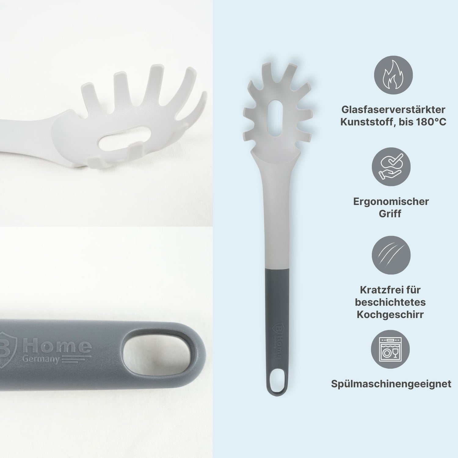 Der Duft von frisch gekochten Spaghetti steigt aus dem Topf, während du die Nudeln elegant aus dem Wasser hebst, ohne dass sie zurückrutschen. Dieser Spaghettilöffel aus hochwertigem Kunststoff in Grau erleichtert dir das Portionieren, Servieren und Anrichten von Pasta direkt aus dem Topf. Dank der Glasfaserverstärkung ist er besonders robust und langlebig, ohne dabei an Leichtigkeit zu verlieren. Mit Massen von 32cm x 7cm x 2cm hat er die ideale Grösse, um Spaghetti, Linguine oder andere lange Nudeln mühelos zu greifen und zu servieren. Die praktischen Zinken am Löffelkopf sorgen dafür, dass die Nudeln sicher auf dem Löffel bleiben und nicht zurück in den Topf rutschen. Egal ob du Spaghetti, Tagliatelle oder andere lange Pastaformen servierst – der Nudellöffel hält hohen Temperaturen stand und ist einsetzbar bis 180°C. Der ergonomische Griff liegt angenehm in der Hand und ermöglicht dir ein komfortables Arbeiten, auch bei vollen Töpfen. Der integrierte Portionierer im Löffelkopf hilft dir dabei, die perfekte Menge an Pasta pro Portion abzumessen – kein Überkochen und keine Reste mehr. Hergestellt aus BPA-freiem Kunststoff, ist der Pastalöffel lebensmittelecht und sicher für alle Arten von Speisen. Die Kunststoffoberfläche schützt dein Kochgeschirr vor Kratzern und ist besonders schonend zu beschichtetem Kochgeschirr. Die Nudelkelle ist zudem spülmaschinengeeignet, sodass du sie leicht reinigen kannst. Mit der praktischen Aufhängung am Griff kannst du den Spaghettilöffel platzsparend aufbewahren. Ob beim Portionieren, Servieren oder Anrichten – dieser Pastalöffel ist ein vielseitiger Helfer, der dir die Arbeit in der Küche erleichtert und für perfekt portionierte Pasta sorgt.