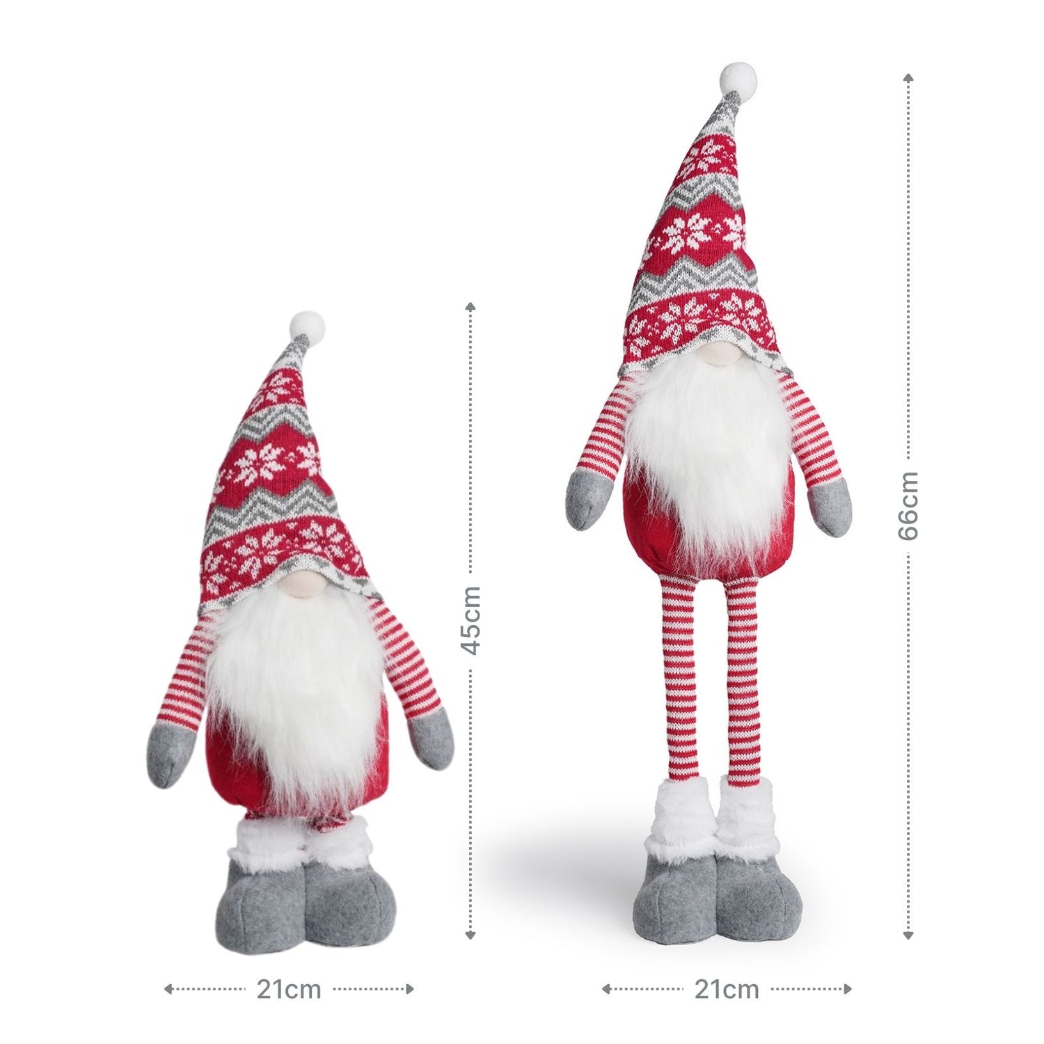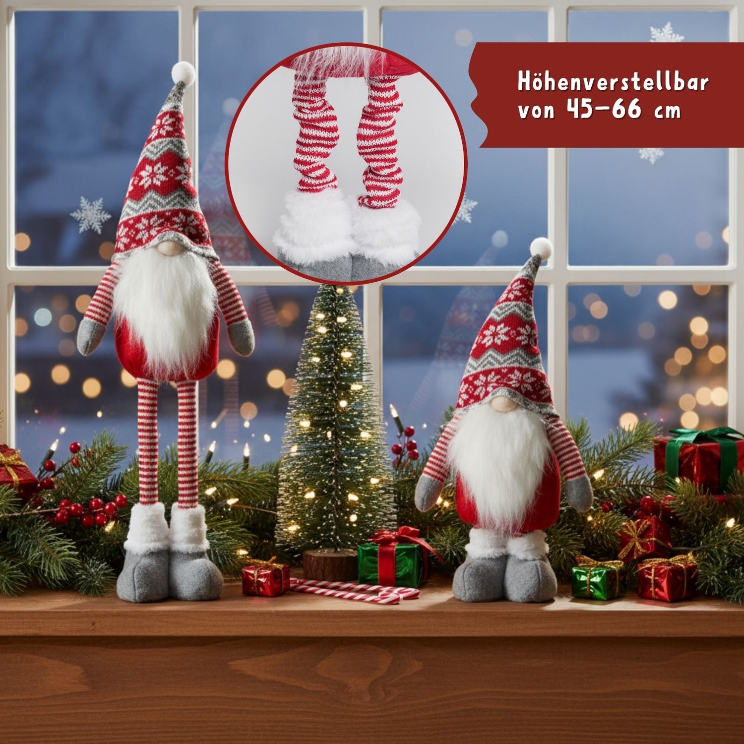 Wenn draussen die Kälte Einzug hält und dein Zuhause in warmes Licht getaucht ist, darf eine winterliche Dekoration nicht fehlen, die Gemütlichkeit und Charme ausstrahlt. Dieser rote Deko-Wichtel bringt genau dieses Gefühl in deine vier Wände – stilvoll, herzlich und voller Weihnachtsstimmung. Mit seinem ausziehbaren Design kannst du die Höhe flexibel anpassen, wodurch er sich ideal an verschiedene Dekorationsflächen anpasst – ob auf dem Fenstersims, unter dem Weihnachtsbaum oder als Blickfang im Eingangsbereich. Der Teleskop-Wichtel überzeugt durch seine liebevoll gestalteten Details: die gestrickte rot-graue Mütze mit Schneeflockenmuster und der lange weisse Bart sorgen für eine gemütliche Feststimmung. Seine Beine lassen sich teleskopartig verlängern – so wächst er stufenlos von 45cm bis auf 66cm Höhe. Damit lässt er sich wunderbar mit unterschiedlich grossen Dekofiguren kombinieren oder einzeln arrangieren. Mit einer Grösse von 21cm x 10cm x 45cm - 66cm findet er überall seinen Platz. Dank seines stabilen Standes bleibt die Figur sicher an Ort und Stelle, auch wenn sie öfter umgestellt oder neu dekoriert wird. Mit ihrem höhenverstellbaren Design und ihrem charmanten Ausdruck ist sie nicht nur Dekoration, sondern ein kleiner Botschafter winterlicher Freude.