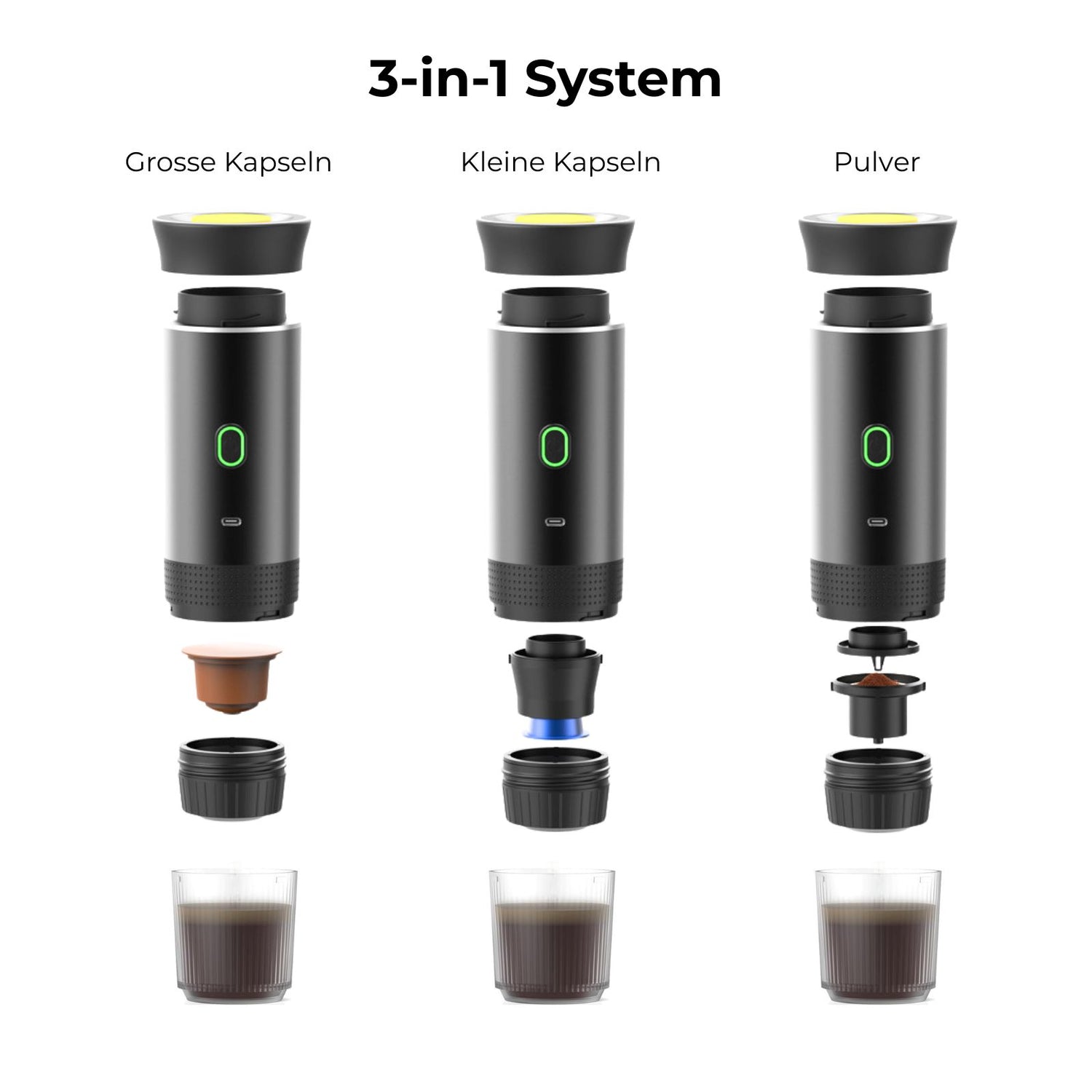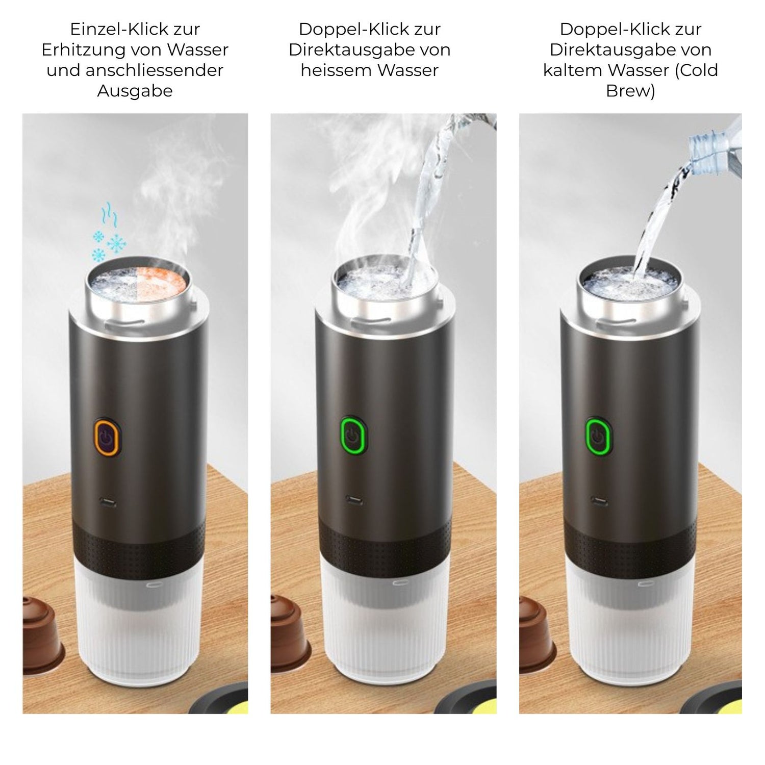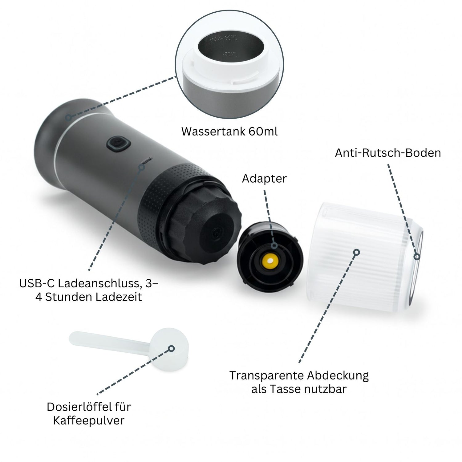Noch bevor der Tag richtig beginnt, weht der Duft von frisch gebrühtem Kaffee durch deine Gedanken – doch unterwegs im Auto, beim Wandern oder im Büro scheint der nächste Espresso oft unerreichbar. Genau hier setzt diese tragbare Kaffeemaschine (72W, 5V) an: ein kabelloser Espressokocher, der dir jederzeit und überall heissen, aromatischen Kaffee oder Espresso schenkt. Das 3-in-1 System verarbeitet dank extra Aufsätzen Kaffeepulver, kleine wie auch grosse Kapseln und bietet so volle Flexibilität. Mit nur einem Doppelklick erhitzt die Kapselmaschine das in den Tank gefüllte Wasser (Kapazität: 60ml) in etwa 5 Minuten auf 92 °C (leuchtet Orange), signalisiert das Ende mit vier leisen Pieptönen und füllt automatisch rund 60 Sekunden lang 1 Tassenfüllung frischen Kaffee in den integrierten Becher (Kapazität: 120ml). Durch Gedrückt-Halten kann heiss aufgefülltes oder kaltes Wasser direkt ausgeschenkt werden und so auch Cold Brew Kaffee genossen werden. Das graue Gehäuse aus ABS, Edelstahl 304 und PC bietet eine griffige Oberfläche. Die transparente Abdeckung lässt sich als Kaffeetasse nutzen, während der Anti-Rutsch-Boden des Bechers für sicheren Stand sorgt. Mit dem mitgelieferten USB-C-Ladekabel lädst du über den USB-C-Ladeport den 2500mAh Akku des Kaffeeautomaten in etwa 3-4 Stunden komplett auf – genug für etwa 50 Einsätze. Mit 8.4cm x 8.4cm x 24.6cm und nur 710g passt das Gerät problemlos in Rucksack, Reisetasche oder Schreibtischschublade und ist ideal für Wanderungen, Camping, Büro, lange Autofahrten oder den gemütlichen Morgen zuhause. Und wenn es um die Pflege geht, genügt ein kurzer Spülgang: Einfach frisches Wasser einfüllen und ohne Kapsel laufen lassen. So bleibt deine Maschine mühelos sauber und bereit für den nächsten aromatischen Moment. Die Kaffeemaschine ist kompatibel mit Dolce Gusto und Nespresso Kapseln.