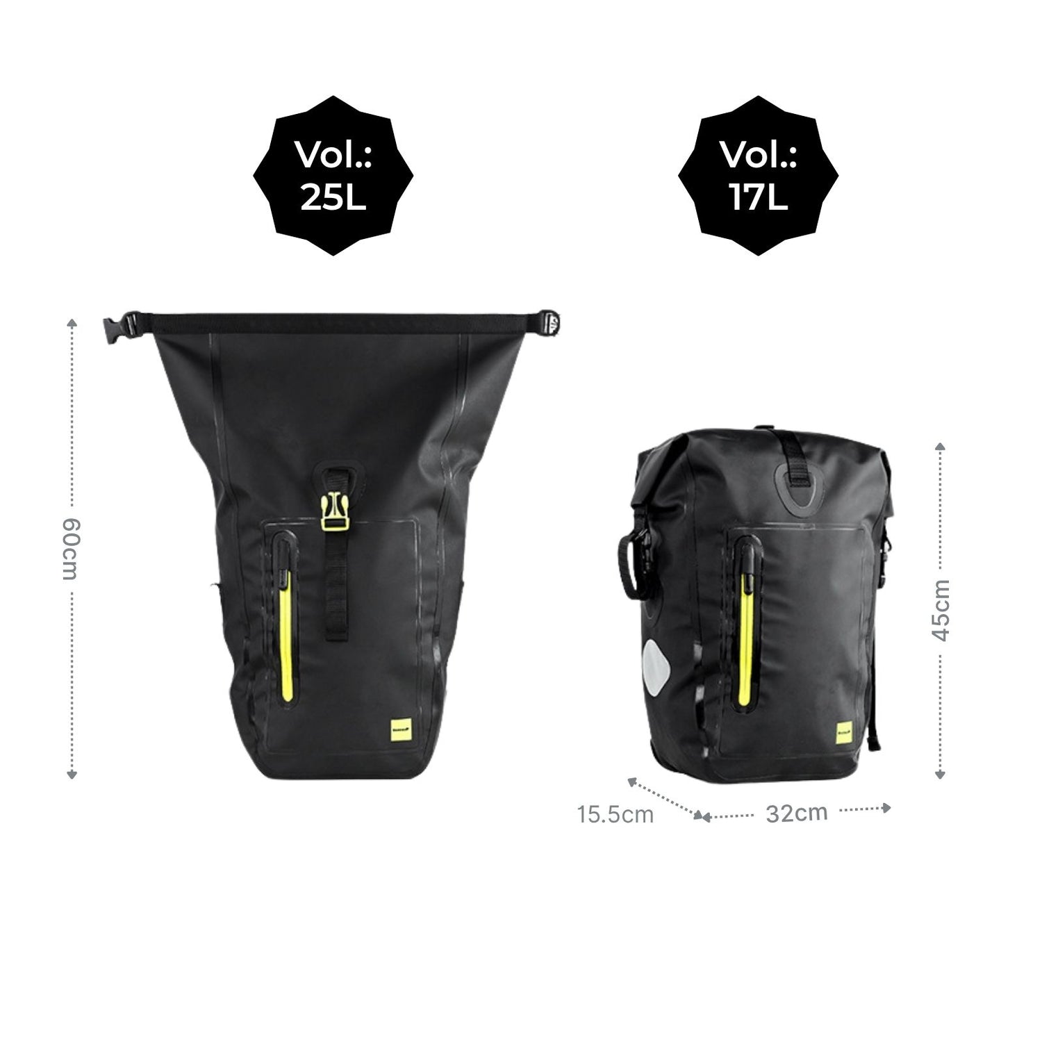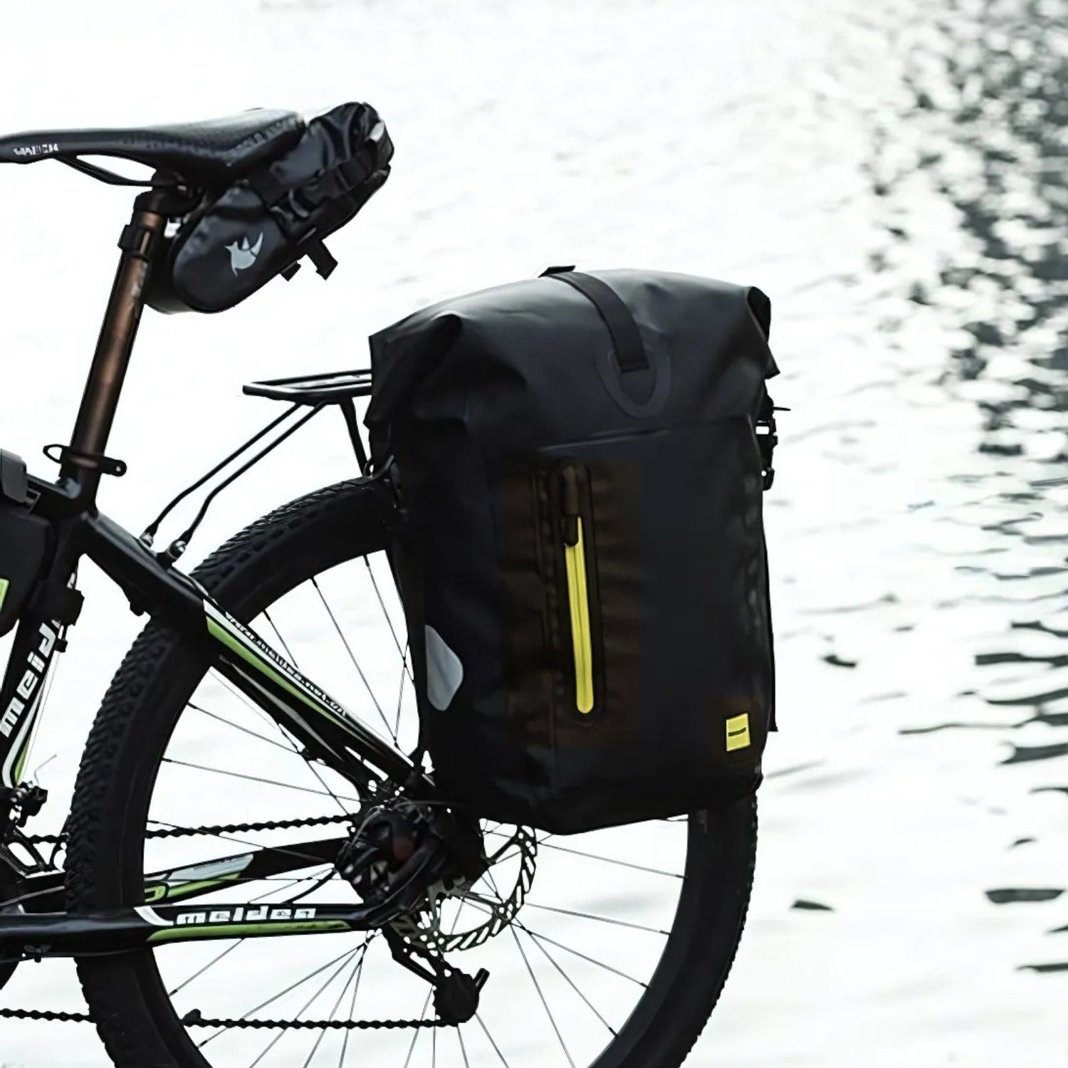 Funktional, durchdacht und bereit für wechselhaftes Wetter: Diese schwarze Fahrradtasche aus wasserabweisendem PVC und Polyester begleitet dich auf dem Arbeitsweg oder beim Wochenendtrip. Mit ca. 17L Volumen (ausgerollt ca. 25L), einem Gewicht von 1.18kg und Massen von 32cm x 15.5cm x 60cm, passt sich die Gepäckträgertasche flexibel deinem Alltag an. Dank des Rolltop-Designs lässt sich die Höhe bei Bedarf auf ca. 45cm reduzieren – je nachdem, wie viel du transportierst. Du kannst den Verschluss dabei wahlweise und flexibel oben oder seitlich fixieren. Im Inneren bietet die Tasche ein grosses Hauptfach sowie eine zusätzliche Reissverschlusstasche, die sich ideal zur Aufbewahrung von Wertsachen oder Zubehör eignet. Für kleinere Gegenstände wie dein Handy steht dir vorne eine separate Reissverschlusstasche zur Verfügung. Die Velo-Tasche wird direkt am Gepäckträger befestigt und entlastet so Rücken und Schultern – besonders angenehm auf längeren Strecken. Die oberen Halterungen auf der Rückseite lassen sich zwischen 9.3cm und 17.3cm einstellen und einfach am Gepäckträger einhängen. Ein drehbarer Knopf mit Schnalle fixiert die Tasche zusätzlich am unteren Teil des Trägers. Die Schnalle ist um 360° drehbar, was die Befestigung deutlich erleichtert. Reflektierende Elemente an den Seiten verbessern deine Sichtbarkeit bei Dämmerung und Dunkelheit. Du kannst die Velo-Tasche zudem in der Hand oder über der Schulter tragen – beides ist dank Handgriff und Schultergurt möglich. Mit dieser wasserabweisenden Bike-Tasche hast du deine Sachen stets trocken, sicher und gut erreichbar, ganz egal, wohin dich deine Fahrt führt.